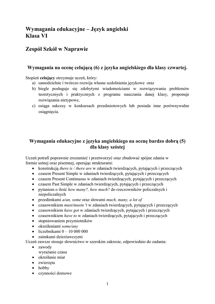 Wymagania edukacyjne – Język angielski Klasa VI Zespół Szkół w Naprawie Wymagania na ocenę celującą (6) z języka angielskiego dla klasy czwartej. Stopień celujący otrzymuje uczeń, który: a) samodzielnie i twórczo rozwija własne uzdolnienia językowe oraz b) biegle posługuje się zdobytymi wiadomościami w rozwiązywaniu problemów teoretycznych i praktycznych z programu nauczania danej klasy, proponuje rozwiązania nietypowe, c) osiąga sukcesy w konkursach przedmiotowych lub posiada inne porównywalne osiągnięcia. Wymagania edukacyjne z języka angielskiego na ocenę bardzo dobrą (5) dla klasy szóstej Uczeń potrafi poprawnie zrozumieć i przetworzyć oraz zbudować spójne zdania w formie ustnej oraz pisemnej, operując strukturami: konstrukcją there is / there are w zdaniach twierdzących, pytających i przeczących czasem Present Simple w zdaniach twierdzących, pytających i przeczących czasem Present Continuous w zdaniach twierdzących, pytających i przeczących czasem Past Simple w zdaniach twierdzących, pytających i przeczących pytaniem o ilość how many?, how much? do rzeczowników policzalnych i niepoliczalnych przedimkami a/an, some oraz słowami much, many, a lot of czasownikiem must/mustn 't w zdaniach twierdzących, pytających i przeczących czasownikiem have got w zdaniach twierdzących, pytających i przeczących czasownikiem have to w zdaniach twierdzących, pytających i przeczących stopniowaniem przymiotników określeniami some/any liczebnikami 0 – 10 000 000 zaimkami dzierżawczymi Uczeń zawsze stosuje słownictwo w szerokim zakresie, odpowiednio do zadania: zawody wyrażanie czasu określanie miar zwierzęta hobby czynności domowe 1 sposoby spędzania wolnego czasu muzyka: gatunki zasady postępowania nazwy produktów spożywczych zapraszanie na przyjęcia, do kina etc. nazwy programów telewizyjnych podróże i transport obiekty w mieście przymiotniki i przysłówki sposoby spędzania wakacji obowiązki szkolne, słownictwo związane ze szkołą przymiotniki opisujące wygląd osób i ich osobowość zabytki Wymagania edukacyjne na ocenę dobrą (4) z języka angielskiego dla klasy szóstej Uczeń potrafi zazwyczaj poprawnie zrozumieć i przetworzyć oraz zbudować w formie ustnej oraz pisemnej zdania w większości przypadków spójne, operując większością prostych struktur: konstrukcją there is / there are w zdaniach twierdzących, pytających i przeczących czasem Present Simple w zdaniach twierdzących, pytających i przeczących czasem Present Continuous w zdaniach twierdzących, pytających i przeczących czasem Past Simple w zdaniach twierdzących, pytających i przeczących pytaniem o ilość how many?, how much? do rzeczowników policzalnych i niepoliczalnych przedimkami a/an, some oraz słowami much, many, a lot of czasownikiem must/mustn 't w zdaniach twierdzących, pytających i przeczących czasownikiem have got w zdaniach twierdzących, pytających i przeczących czasownikiem have to w zdaniach twierdzących, pytających i przeczących stopniowaniem przymiotników określeniami some/any liczebnikami 0 – 10 000 000 zaimkami dzierżawczymi Uczeń na ogół stosuje słownictwo szerokiego zakresu z wymienionych dziedzin: zawody wyrażanie czasu określanie miar zwierzęta hobby czynności domowe sposoby spędzania wolnego czasu muzyka: gatunki zasady postępowania nazwy produktów spożywczych zapraszanie na przyjęcia, do kina etc. nazwy programów telewizyjnych 2 podróże i transport obiekty w mieście przymiotniki i przysłówki sposoby spędzania wakacji obowiązki szkolne, słownictwo związane ze szkołą przymiotniki opisujące wygląd osób i ich osobowość zabytki Wymagania edukacyjne na ocenę dostateczną (3) z języka angielskiego dla klasy szóstej Uczeń potrafi czasami zrozumieć i przetworzyć oraz zbudować zdania w formie pisemnej i ustnej, raczej spójne, operując większością prostych struktur: konstrukcją there is / there are w zdaniach twierdzących, pytających i przeczących czasem Present Simple w zdaniach twierdzących, pytających i przeczących czasem Present Continuous w zdaniach twierdzących, pytających i przeczących czasem Past Simple w zdaniach twierdzących, pytających i przeczących pytaniem o ilość how many?, how much? do rzeczowników policzalnych i niepoliczalnych przedimkami a/an, some oraz słowami much, many, a lot of czasownikiem must/mustn 't w zdaniach twierdzących, pytających i przeczących czasownikiem have got w zdaniach twierdzących, pytających i przeczących czasownikiem have to w zdaniach twierdzących, pytających i przeczących stopniowaniem przymiotników określeniami some/any liczebnikami 0 – 10 000 000 zaimkami dzierżawczymi Uczeń czasami używa słownictwa z niżej podanego zakresu, dysponując nim w ograniczonym stopniu odpowiednio do zadania: zawody wyrażanie czasu określanie miar zwierzęta hobby czynności domowe sposoby spędzania wolnego czasu muzyka: gatunki zasady postępowania nazwy produktów spożywczych zapraszanie na przyjęcia, do kina etc. nazwy programów telewizyjnych podróże i transport obiekty w mieście przymiotniki i przysłówki sposoby spędzania wakacji obowiązki szkolne, słownictwo związane ze szkołą przymiotniki opisujące wygląd osób i ich osobowość 3 zabytki Wymagania edukacyjne na ocenę dopuszczającą (2) z języka angielskiego dla klasy szóstej Uczeń potrafi operować niewielką ilością wymienionych struktur, potrafi zbudować zdania w formie pisemnej i ustnej, lecz w większości przypadków niespójne, w niewielu przypadkach potrafi poprawnie zrozumieć i przetworzyć tekst słuchany lub czytany: konstrukcją there is / there are w zdaniach twierdzących, pytających i przeczących czasem Present Simple w zdaniach twierdzących, pytających i przeczących czasem Present Continuous w zdaniach twierdzących, pytających i przeczących czasem Past Simple w zdaniach twierdzących, pytających