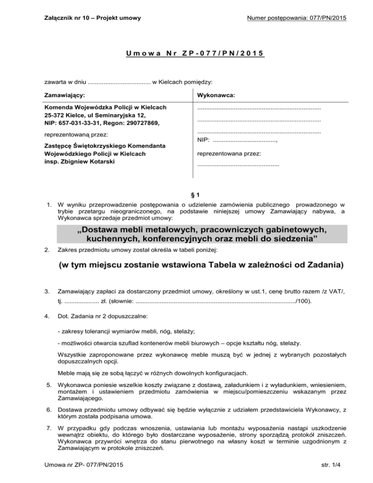 Załącznik nr 10 – Projekt umowy Numer postępowania: 077/PN/2015 Umowa Nr ZP-077/PN/2015 zawarta w dniu .................................... w Kielcach pomiędzy: Zamawiający: Wykonawca: Komenda Wojewódzka Policji w Kielcach 25-372 Kielce, ul Seminaryjska 12, NIP: 657-031-33-31, Regon: 290727869, ....................................................................... ....................................................................... ....................................................................... NIP: ...................................., reprezentowaną przez: Zastępcę Świętokrzyskiego Komendanta Wojewódzkiego Policji w Kielcach insp. Zbigniew Kotarski reprezentowana przez: ............................................... §1 1. W wyniku przeprowadzenie postępowania o udzielenie zamówienia publicznego prowadzonego w trybie przetargu nieograniczonego, na podstawie niniejszej umowy Zamawiający nabywa, a Wykonawca sprzedaje przedmiot umowy: „Dostawa mebli metalowych, pracowniczych gabinetowych, kuchennych, konferencyjnych oraz mebli do siedzenia” 2. Zakres przedmiotu umowy został określa w tabeli poniżej: (w tym miejscu zostanie wstawiona Tabela w zależności od Zadania) 3. Zamawiający zapłaci za dostarczony przedmiot umowy, określony w ust.1, cenę brutto razem /z VAT/, tj. .................... zł. (słownie: ............................................................................................/100). 4. Dot. Zadania nr 2 dopuszczalne: - zakresy tolerancji wymiarów mebli, nóg, stelaży; - możliwości otwarcia szuflad kontenerów mebli biurowych – opcje kształtu nóg, stelaży. Wszystkie zaproponowane przez wykonawcę meble muszą być w jednej z wybranych pozostałych dopuszczalnych opcji. Meble mają się ze sobą łączyć w różnych dowolnych konfiguracjach. 5. Wykonawca poniesie wszelkie koszty związane z dostawą, załadunkiem i z wyładunkiem, wniesieniem, montażem i ustawieniem przedmiotu zamówienia w miejscu/pomieszczeniu wskazanym przez Zamawiającego. 6. Dostawa przedmiotu umowy odbywać się będzie wyłącznie z udziałem przedstawiciela Wykonawcy, z którym została podpisana umowa. 7. W przypadku gdy podczas wnoszenia, ustawiania lub montażu wyposażenia nastąpi uszkodzenie wewnątrz obiektu, do którego było dostarczane wyposażenie, strony sporządzą protokół zniszczeń. Wykonawca przywróci wnętrza do stanu pierwotnego na własny koszt w terminie uzgodnionym z Zamawiającym w protokole zniszczeń. Umowa nr ZP- 077/PN/2015 str. 1/4 Załącznik nr 10 – Projekt umowy Numer postępowania: 077/PN/2015 8. Spisanie protokołu odbioru ilościowo/jakościowego przez strony. Zamawiający uzna dostawę za zrealizowaną po podpisaniu protokołu bez uwag co stanowić będzie podstawę do wystawienia przez Wykonawcę faktury. 9. Dostarczony przedmiot umowy wyszczególnionymi w SIWZ. musi być zgodny z opisem i parametrami technicznymi 10. W przypadku ustalenia przy odbiorze przedmiotu umowy przez Zamawiającego iż dostarczony towar nie jest zgodny ze specyfikacją, niekompletny lub uszkodzony Wykonawca zobowiązany jest w terminie 5 dni roboczych licząc od dnia podpisania przez strony protokołu zawierającego w/wym. zastrzeżenia do załadunku, transportu, wymiany przedmiotu umowy lub uzupełnienia braków oraz do poniesienia wszelkich związanych z tym kosztów. 11. Wydłużenie terminu dostawy w przypadku wystąpienia zmian związanych z zakończeniem budowy po stronie Zamawiającego, mających bezpośredni wpływ na terminowość wykonania dostawy. W takim przypadku przedłużenie terminu dostawy nastąpi o czas niezbędny na wprowadzenie zmian. Zamawiający powiadomi Wykonawcę o opóźnieniu z co najmniej z 5 dniowym wyprzedzeniem liczonym w stosunku do terminu dostawy. Wykonawca zobowiązany będzie wówczas do przechowywania wyposażenia na własny koszt. 12. Dot. Zadania nr 1 – Wykonawca przeszkoli wskazanych pracowników Zamawiającego z prawidłowej obsługi zamków w szafach na informacje niejawne, w miejscu dostawy. 13. Dot. Zadania nr 1 - Przy dostawie każdy dostarczony przedmiot umowy ma zawierać komplet dokumentów w formie oryginału lub kserokopii podpisanych za zgodność z oryginałem przez wykonawcę, tj. - Certyfikat IMP dla szaf metalowych do przechowywania dokumentów niejawnych potwierdzający zgodność szaf metalowych z klasą A wg Mon nr 57 i Mon nr 58 spełniające wymagania Typ 1 wg Rozporządzenia Rady Ministrów z 29.05.2012 r w sprawie środków bezpieczeństwa fizycznego stosowanych do zabezpieczania informacji niejawnych; - Certyfikat IMP dla szaf metalowych do przechowywania informacji niejawnych potwierdzający zgodność szaf metalowych z klasa S1 (wg PN-EN 144450:2006) Typ 2 (wg Rozporządzenia Rady Ministrów z dnia z dnia 29 maja 2012 r. w sprawie środków bezpieczeństwa fizycznego stosowanych do zabezpieczania informacji niejawnych; - Certyfikat IPM do przechowywania broni palnej i amunicji potwierdzający zgodność szaf metalowych z klasą S1 typ 2 zgodnie z KT/101/IPM/2008 wg Rozporządzenia Rady Ministra Spraw Wewnętrznych i Administracji z dnia 21.10.2011. 14. Przedmiot umowy charakteryzuje się najwyższą jakością wykonania, zgodne z opisami i parametrami technicznymi zawartymi w SIWZ. 15. Zamawiającemu przysługuje prawo do ograniczenia przedmiotu umowy, w przypadku ograniczenia finansowego Zamawiającego, niezależnego od Zamawiającego, a Wykonawca wyraża na to zgodę i oświadcza, że z tego tytułu nie będzie żądał od Zamawiającego żadnego odszkodowania". §2 1. Wykonawca przedmiot umowy dostarczy i zamontuje w terminie: - dla Zadania nr 1 - do 30.10.2015r. - dla Zadania nr 2 – do 03.11.2015r. - dla Zadania nr 3 – do 05.11.2015r. - dla Zadania nr 4 – do 06.11.2015r. w KPP w Busku Zdroju, ul. Mickiewicza 19 – kontakt. Jolanta Wach, tel. 41 37 89 239,229; w KPP w Pińczowie, ul. Floriańska 4, kontakt: Seweryn Pietrawski, tel. 41 8053 230; Magazyn 