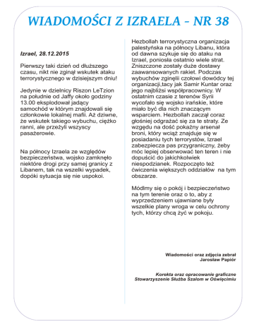 WIADOMOŚCI Z IZRAELA - NR 38 Izrael, 28.12.2015 Pierwszy taki dzień od dłuższego czasu, nikt nie zginął wskutek ataku terrorystycznego w dzisiejszym dniu! Jedynie w dzielnicy Riszon LeTzion na południe od Jaffy około godziny 13.00 eksplodował jadący samochód w którym znajdowali się członkowie lokalnej mafii. Aż dziwne, że wskutek takiego wybuchu, ciężko ranni, ale przeżyli wszyscy pasażerowie. Na północy Izraela ze względów bezpieczeństwa, wojsko zamknęło niektóre drogi przy samej granicy z Libanem, tak na wszelki wypadek, dopóki sytuacja się nie uspokoi. Hezbollah terrorystyczna organizacja palestyńska na północy Libanu, która od dawna szykuje się do ataku na Izrael, poniosła ostatnio wiele strat. Zniszczone zostały duże dostawy zaawansowanych rakiet. Podczas wybuchów zginęlii czołowi dowódcy tej organizacji,tacy jak Samir Kuntar oraz jego najbliżsi współpracownicy. W ostatnim czasie z terenów Syrii wycofało się wojsko irańskie, które miało być dla nich znaczącym wsparciem. Hezbollah zaczął coraz głośniej odgrażać się za te straty. Ze wzgędu na dość pokaźny arsenał broni, który wciąż znajduje się w posiadaniu tych terrorystów, Izrael zabezpiecza pas przygraniczny, żeby móc lepiej obserwować ten teren i nie dopuścić do jakichkolwiek niespodzianek. Rozpoczęto też ćwiczenia większych oddziałów na tym obszarze. Módlmy się o pokój i bezpieczeństwo na tym terenie oraz o to, aby z wyprzedzeniem ujawniane były wszelkie plany wroga w celu ochrony tych, którzy chcą żyć w pokoju. Wiadomości oraz zdjęcia zebrał Jarosław Papiór Korekta oraz opracowanie graficzne Stowarzyszenie Służba Szalom w Oświęcimiu