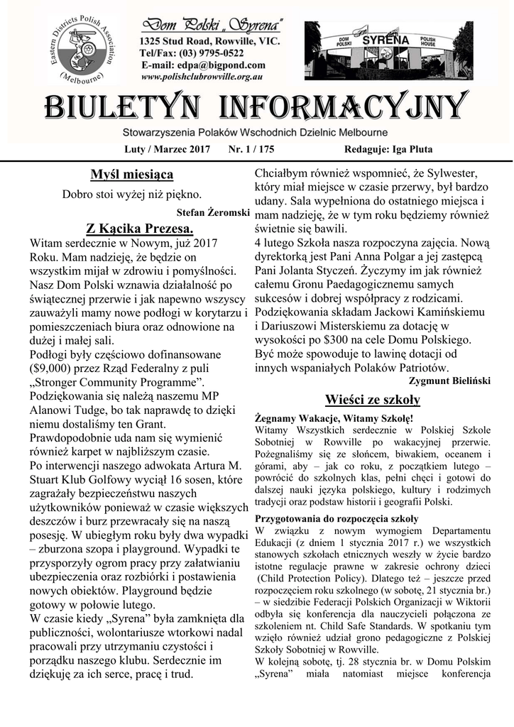 Luty / Marzec 2017 Nr. 1 / 175 Redaguje: Iga Pluta Chciałbym również wspomnieć, że Sylwester, który miał miejsce w czasie przerwy, był bardzo Dobro stoi wyżej niż piękno. udany. Sala wypełniona do ostatniego miejsca i Stefan Żeromski mam nadzieję, że w tym roku będziemy również świetnie się bawili. Z Kącika Prezesa. 4 lutego Szkoła nasza rozpoczyna zajęcia. Nową Witam serdecznie w Nowym, już 2017 dyrektorką jest Pani Anna Polgar a jej zastępcą Roku. Mam nadzieję, że będzie on wszystkim mijał w zdrowiu i pomyślności. Pani Jolanta Styczeń. Życzymy im jak również całemu Gronu Paedagogicznemu samych Nasz Dom Polski wznawia działalność po świątecznej przerwie i jak napewno wszyscy sukcesów i dobrej współpracy z rodzicami. zauważyli mamy nowe podłogi w korytarzu i Podziękowania składam Jackowi Kamińskiemu i Dariuszowi Misterskiemu za dotację w pomieszczeniach biura oraz odnowione na wysokości po $300 na cele Domu Polskiego. dużej i małej sali. Być może spowoduje to lawinę dotacji od Podłogi były częściowo dofinansowane innych wspaniałych Polaków Patriotów. ($9,000) przez Rząd Federalny z puli Zygmunt Bieliński „Stronger Community Programme”. Podziękowania się należą naszemu MP Wieści ze szkoły Alanowi Tudge, bo tak naprawdę to dzięki Żegnamy Wakacje, Witamy Szkołę! niemu dostaliśmy ten Grant. Witamy Wszystkich serdecznie w Polskiej Szkole Prawdopodobnie uda nam się wymienić Sobotniej w Rowville po wakacyjnej przerwie. również karpet w najbliższym czasie. Pożegnaliśmy się ze słońcem, biwakiem, oceanem i Po interwencji naszego adwokata Artura M. górami, aby – jak co roku, z początkiem lutego – Stuart Klub Golfowy wyciął 16 sosen, które powrócić do szkolnych klas, pełni chęci i gotowi do dalszej nauki języka polskiego, kultury i rodzimych zagrażały bezpieczeństwu naszych tradycji oraz podstaw historii i geografii Polski. użytkowników ponieważ w czasie większych Przygotowania do rozpoczęcia szkoły deszczów i burz przewracały się na naszą posesję. W ubiegłym roku były dwa wypadki W związku z nowym wymogiem Departamentu Edukacji (z dniem 1 stycznia 2017 r.) we wszystkich – zburzona szopa i playground. Wypadki te stanowych szkołach etnicznych weszły w życie bardzo przysporzyły ogrom pracy przy załatwianiu istotne regulacje prawne w zakresie ochrony dzieci ubezpieczenia oraz rozbiórki i postawienia (Child Protection Policy). Dlatego też – jeszcze przed rozpoczęciem roku szkolnego (w sobotę, 21 stycznia br.) nowych obiektów. Playground będzie – w siedzibie Federacji Polskich Organizacji w Wiktorii gotowy w połowie lutego. W czasie kiedy „Syrena” była zamknięta dla odbyła się konferencja dla nauczycieli połączona ze szkoleniem nt. Child Safe Standards. W spotkaniu tym publiczności, wolontariusze wtorkowi nadal wzięło również udział grono pedagogiczne z Polskiej pracowali przy utrzymaniu czystości i Szkoły Sobotniej w Rowville. porządku naszego klubu. Serdecznie im W kolejną sobotę, tj. 28 stycznia br. w Domu Polskim „Syrena” miała natomiast miejsce konferencja dziękuję za ich serce, pracę i trud. Myśl miesiąca pedagogiczna przeznaczona dla nauczycieli naszej placówki oświatowej, na której omówiony zastał kalendarz i nowy podział pracy oraz sprawy organizacyjne i programowe szkoły. Ponadto, w tygodniu poprzedzającym rozpoczęcie nowego roku szkolnego we wszystkich salach lekcyjnych zostały zainstalowane nowe, piękne tablice, każda klasa została zaopatrzona w odtwarzacz płyt CD (bardzo pomocny w lekcjach muzyki), a także w dwóch pomieszczeniach szkolnych zamontowano kolorowe okładziny na ścianach, które będą stanowiły tło dla przygotowywanych przez uczniów – podczas lekcji – prac artystycznych i rozmaitych dekoracji. Dodatkowo, w pokoju nauczycielskim została zainstalowana specjalna tablica, na której – w widocznym miejscu – będą znajdowały się wszystkie najważniejsze informacje dotyczące uczniów, którzy wymagają szczególnej opieki ze strony nauczycieli ze względu na swoją sytuację zdrowotną (np. Anaphylaxis&Allergic Reactions Action Plan i/lub Asthma Action Plan). Szkoła została także zaopatrzona w dobrze wyposażoną apteczkę, książki i podręczniki oraz niezbędne artykuły papiernicze i biurowe. Pierwszy dzień szkoły Po wszystkich przygotowaniach nadszedł wreszcie czas na ponowne otwarcie naszej placówki oświatowej. W sobotę, 4 lutego br. odbyły się pierwsze zajęcia lekcyjne. Do szkoły polskiej w Rowville przybyło wielu dotychczasowych i nowych uczniów, w tym maluszki rozpoczynające w tym roku klasę „0”. Były uśmiechy na twarzach dzieci i rodziców, wspomnienia z wakacji oraz serdeczne powitania z dawnymi i tegorocznymi nauczycielami. Zawiązały się również nowe znajomości i przyjaźnie zarówno pomiędzy uczniami, jak i ich opiekunami. Rodzice wypełnili karty informacyjne do szkoły, a każdy z naszych podopiecznych – z okazji rozpoczęcia roku szkolnego – otrzymał drobny upominek. Wszyscy zapoznali się także z nowym regulaminem Polskiej Szkoły Sobotniej w Rowville. Uroczyste rozpoczęcie roku szkolnego 2017 Oficjalne uroczystości związane z rozpoczęciem nowego roku szkolnego, połączone z Mszą św. oraz obchodami jubileuszu 60-lecia naszej placówki oświatowej zostały zaplanowane na sobotę, 25 lutego 2017 roku (w godzinach 10.00-12.30) w Domu Polskim „Syrena”. W imieniu całej społeczności szkolnej, a także naszym własnym serdecznie Wszystkich zapraszamy do wzięcia w nich udziału. Szczegółowa relacja z tego wydarzenia będzie zamieszczona w kolejnym numerze Biuletynu Informacyjnego Stowarzyszenia Polaków Dzielnic Wschodnich w Melbourne. Życzenia na nowy rok szkolny „Nie tak ważne, aby człowiek dużo wiedział, ale żeby dobrze wiedział, nie żeby umiał na pamięć, ale żeby rozumiał, nie żeby go wszystko trochę 