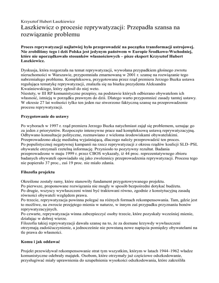 Krzysztof Hubert Łaszkiewicz Łaszkiewicz o procesie reprywatyzacji: Przepadła szansa na rozwiązanie problemu Proces reprywatyzacji najłatwiej było przeprowadzić na początku transformacji ustrojowej. Nie zrobiliśmy tego i dziś Polska jest jedynym państwem w Europie Środkowo-Wschodniej, które nie uporządkowało stosunków własnościowych – pisze ekspert Krzysztof Hubert Łaszkiewicz. Dyskusja, która rozgorzała na temat reprywatyzacji, wywołana przypadkiem głośnego zwrotu nieruchomości w Warszawie, przypomniała zmarnowaną w 2001 r. szansę na rozwiązanie tego nabrzmiałego problemu. Kompleksowa, przygotowana przez rząd premiera Jerzego Buzka ustawa regulująca tematykę reprywatyzacji, znalazła się na biurku prezydenta Aleksandra Kwaśniewskiego, który zgłosił do niej weto. Niestety, w III RP komunistyczne przepisy, na podstawie których odbierano obywatelom ich własność, istnieją w porządku prawnym do dziś. Dlatego warto przypomnieć zasady tamtej ustawy. W okresie 27 lat wolności tylko ten jeden raz stworzono faktyczną szansę na przeprowadzenie procesu reprywatyzacji. Przygotowanie do ustawy Po wyborach w 1997 r. rząd premiera Jerzego Buzka natychmiast zajął się problemem, uznając go za jeden z priorytetów. Rozpoczęto intensywne prace nad kompleksową ustawą reprywatyzacyjną. Odbywano konsultacje polityczne, rozmawiano z wieloma środowiskami obywatelskimi. Przeprowadzono akcję medialną wyjaśniającą, dlaczego należy przeprowadzić ten proces. Po populistycznej negatywnej kampanii na rzecz reprywatyzacji z okresu rządów koalicji SLD–PSL obywatele otrzymali rzetelną informację. Przyniosło to pozytywny rezultat. Badania przeprowadzone w maju 1999 r. przez CBOS wykazały, iż 44 proc. reprezentatywnego zbioru badanych obywateli opowiadało się jako zwolennicy przeprowadzenia reprywatyzacji. Procesu tego nie popierało 37 proc., zaś 19 proc. nie miało zdania. Filozofia projektu Określone zostały ramy, które stanowiły fundament przygotowywanego projektu. Po pierwsze, proponowane rozwiązania nie mogły w sposób bezpośredni dotykać budżetu. Po drugie, wszyscy wywłaszczeni winni być traktowani równo, zgodnie z konstytucyjną zasadą równości obywateli względem prawa. Po trzecie, reprywatyzacja powinna polegać na różnych formach rekompensowania. Tam, gdzie jest to możliwe, na zwrocie przejętego mienia w naturze, w innym zaś przypadku przyznaniu bonów reprywatyzacyjnych. Po czwarte, reprywatyzacja winna zabezpieczyć osoby trzecie, które pozyskały wcześniej mienie, działając w dobrej wierze. Filozofia takiej reprywatyzacji dawała szansę na to, że za doznane krzywdy wywłaszczeni otrzymają zadośćuczynienie, a jednocześnie nie powstaną nowe napięcia pomiędzy obywatelami na tle prawa do własności. Komu i jak oddawać Projekt przewidywał rekompensowanie strat tym wszystkim, którym w latach 1944–1962 władze komunistyczne odebrały majątek. Osobom, które otrzymały już częściowe odszkodowanie, przysługiwać miały uprawnienia do uzupełnienia wysokości odszkodowania, które zakreśliła ustawa – to jest 50 proc. wartości utraconego mienia. Procesy nacjonalizacyjne przeprowadzone w poprzedniej formacji ustrojowej w sposób bezceremonialny naruszały prawo. Naruszenia te można zakwalifikować do trzech grup. Pierwsza to przypadki dotknięcia wadą niespójności aktów wywłaszczeniowych z ówcześnie obowiązującym porządkiem prawnym, np. z konstytucją lub z obowiązującymi ogólnie zasadami. Druga to przypadki niewykonania zobowiązań ustawowych państwa wobec obywateli w zakresie ich rekompensowania. Trzecia to niewłaściwe wręcz dowolne stosowanie przepisów, w tym stosowanie prawa wstecz. Zasady państwa prawa oraz obowiązek poszanowania podstawowych praw człowieka wymagają, aby proces reprywatyzacji objął wszystkie te przypadki. Projekt ustawy zakładał, że reprywatyzacja obejmie osoby, które w chwili utraty mienia były obywatelami polskimi, lub ich spadkobierców, jeżeli nabyli oni zgodnie z zasadami prawa polskiego prawo do spadku. Znaczącą część zgłoszonych roszczeń stanowiły „roszczenia zabużańskie". Pomimo jednoznacznej sytuacji prawnej (uprawnienia tej grupy były przedmiotem orzeczeń Sądu Najwyższego, podniesionych do rangi zasad prawnych, jak również orzeczeń Trybunału Konstytucyjnego) tworzone przeszkody nie pozwalały uprawnionym na zrealizowanie przysługującego im prawa. Zaistniała sytuacja dowodziła, jak w sferze prawa własności praktyka III RP jest rozbieżna z teorią. Dlatego tę grupę poszkodowanych też objęto projektem. Postępowanie reprywatyzacyjne miało być prowadzone w trybie administracyjnym. Obowiązek udowodnienia swoich praw do mienia ciążył na uprawnionych zgodnie z ogólnie obowiązującymi zasadami. W przypadku konieczności pozyskania dowodów, np. przed sądem powszechnym, postępowanie reprywatyzacyjne miało podlegać zawieszeniu. Zwrot w naturze i wyłączenia Reprywatyzacją, poza pewnymi wyjątkami, miano objąć mienie nieruchome, głównie grunty, budynki mieszkalne, gospodarcze i przemysłowe. Generalną zasadą był zwrot mienia w naturze wszędzie tam, gdzie jest to tylko możliwe. W przypadku zwrotu mienia, które służyło aktualnie celom użyteczności publicznej, proponowano utrzymanie przez pewien okres najmu dotychczasowemu użytkownikowi. Gdyby dawny właściciel nie godził się na zawarcie takiej umowy, wojewoda miał orzec w drodze decyzji administracyjnej, czy mienie zostanie zwrócone w naturze, czy też uprawniony otrzyma inną formę rekompensaty, tj. bony. Aby nie zakłócić procesów gospodarczych zaproponowano, by uprawniony, otrzymując mienie objęte umową z osobą trzecią, stał się stroną tej umowy. Projekt ustawy pewne składniki majątkowe wyłączał z bezpośredniego zwrotu w naturze. Dotyczyło to między innymi nieruchomości o szczególnym znaczeniu dla kultury
