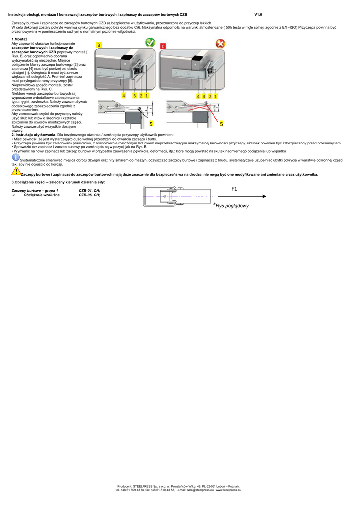 Instrukcja obsługi, montażu I konserwacji zaczepów burtowych i zapinaczy do zaczepów burtowych CZB V1.0 Zaczepy burtowe i zapinacze do zaczepów burtowych CZB są bezpieczne w użytkowaniu, przeznaczone do przyczep lekkich. W celu dekoracji zostały pokryte warstwą cynku galwanicznego bez dodatku Cr6. Maksymalna odporność na warunki atmosferyczne ( 50h testu w mgle solnej, zgodnie z EN –ISO) Przyczepa powinna być przechowywana w pomieszczeniu suchym o normalnym poziomie wilgotności. 1.Montaż Aby zapewnić właściwe funkcjonowanie zaczepów burtowych i zapinaczy do zaczepów burtowych CZB poprawny montaż [ Rys. B] oraz odpowiednio dobrana wytrzymałość są niezbędne. Miejsce połączenie klamry zaczepu burtowego [2] oraz zapinacza [4] musi być poniżej osi obrotu dźwigni [1]. Odległość B musi być zawsze większa niż odległość A. Promień zapinacza musi przylegać do ramy przyczepy [5]. Nieprawidłowy sposób montażu został przedstawiony na Rys. C. Niektóre wersje zaczepów burtowych są wyposażone w dodatkowe zabezpieczenia typu: rygiel, zawleczka. Należy zawsze używać dodatkowego zabezpieczenia zgodnie z przeznaczeniem. Aby zamocować części do przyczepy należy użyć śrub lub nitów o średnicy i kształcie zbliżonym do otworów montażowych części. Należy zawsze użyć wszystkie dostępne otwory. 2. Instrukcja użytkowania- Dla bezpiecznego otwarcia / zamknięcia przyczepy użytkownik powinien: • Mieć pewność, że jest wystarczająco dużo wolnej przestrzeni do otwarcia zaczepu i burty. • Przyczepa powinna być załadowana prawidłowo, z równomiernie rozłożonym ładunkiem nieprzekraczającym maksymalnej ładowności przyczepy, ładunek powinien być zabezpieczony przed przesunięciem. • Sprawdzić czy zapinacz i zaczep burtowy po zamknięciu są w pozycji jak na Rys. B. • Wymienić na nowy zapinacz lub zaczep burtowy w przypadku zauważenia pęknięcia, deformacji, itp.: które mogą powstać na skutek nadmiernego obciążenia lub wypadku. 5 5 Systematycznie smarować miejsca obrotu dźwigni oraz nity smarem do maszyn, oczyszczać zaczepy burtowe i zapinacze z brudu, systematycznie uzupełniać ubytki pokrycia w warstwie ochronnej części tak, aby nie dopuścić do korozji. Zaczepy burtowe i zapinacze do zaczepów burtowych mają duże znaczenie dla bezpieczeństwa na drodze, nie mogą być one modyfikowane ani zmieniane przez użytkownika. 3.Obciążenie części – zalecany kierunek działania siły: Zaczepy burtowe – grupa 1 • Obciążenie wzdłużne CZB-01. CH; CZB-06. CH; F1 *Rys poglądowy Producent: STEELPRESS Sp. z o.o. ul. Powstańców Wlkp. 48, PL 62-031 Luboń – Poznań, tel. +48 61 899 43 83, fax +48 61 810 43 53, e-mail: [email protected] www.steelpress.eu