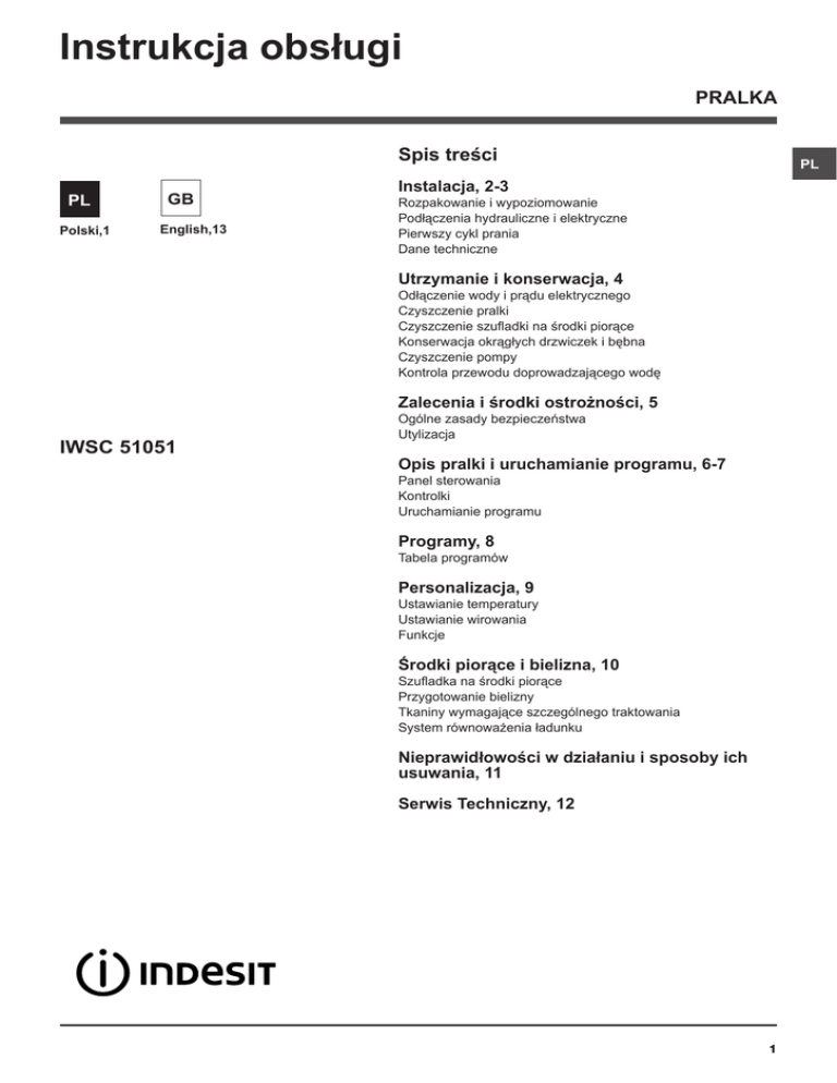 Instrukcja obsługi PRALKA Spis treści PL Polski,1 GB English,13 PL Instalacja, 2-3 Rozpakowanie i wypoziomowanie Podłączenia hydrauliczne i elektryczne Pierwszy cykl prania Dane techniczne Utrzymanie i konserwacja, 4 Odłączenie wody i prądu elektrycznego Czyszczenie pralki Czyszczenie szufladki na środki piorące Konserwacja okrągłych drzwiczek i bębna Czyszczenie pompy Kontrola przewodu doprowadzającego wodę Zalecenia i środki ostrożności, 5 IWSC 51051 Ogólne zasady bezpieczeństwa Utylizacja Opis pralki i uruchamianie programu, 6-7 Panel sterowania Kontrolki Uruchamianie programu Programy, 8 Tabela programów Personalizacja, 9 Ustawianie temperatury Ustawianie wirowania Funkcje Środki piorące i bielizna, 10 Szufladka na środki piorące Przygotowanie bielizny Tkaniny wymagające szczególnego traktowania System równoważenia ładunku Nieprawidłowości w działaniu i sposoby ich usuwania, 11 Serwis Techniczny, 12 1 Instalacja PL ! Należy zachować niniejszą książeczkę, aby móc z niej skorzystać w każdej chwili. W przypadku sprzedaży, odstąpienia lub przeniesienia pralki w inne miejsce należy zadbać o przekazanie instrukcji wraz z maszyną, aby nowy właściciel mógł zapoznać się z działaniem urządzenia i z dotyczącymi go ostrzeżeniami. ! Należy uważnie przeczytać instrukcję obsługi: zawiera ona ważne informacje dotyczące instalacji oraz właściwego i bezpiecznego użytkowania pralki. Rozpakowanie i wypoziomowanie Rozpakowanie 1. Rozpakować pralkę. 2. Sprawdzić, czy nie doznała ona uszkodzeń w czasie transportu. W przypadku stwierdzenia uszkodzeń nie podłączać jej i skontaktować się ze sprzedawcą. 3. Odkręcić 4 śruby zabezpieczające maszynę na czas transportu oraz zdjąć gumowy element z podkładką, znajdujący się w tylnej części pralki (patrz rysunek). 4. Zatkać otwory przy pomocy plastikowych zaślepek, znajdujących się w wyposażeniu maszyny. 5. Zachować wszystkie części: w razie konieczności przewiezienia pralki w inne miejsce, powinny one zostać ponownie zamontowane. ! Części opakowania nie są zabawkami dla dzieci. Poziomowanie 1. Ustawić pralkę na płaskiej i twardej podłodze, nie opierając jej o ściany, meble itp. 2. Jeśli podłoga nie jest idealnie pozioma, należy skompensować nierówności, odkręcając lub dokręcając przednie nóżki (patrz rysunek); kąt nachylenia, zmierzony na górnym blacie pralki nie powinien przekraczać 2°. Staranne wypoziomowanie pralki zapewnia jej stabilność i zapobiega wibracjom, hałasowi oraz przesuwaniu się maszyny w czasie pracy. W razie ustawienia na dywanie lub wykładzinie dywanowej należy tak wyregulować nóżki, aby pod pralką pozostawała wolna przestrzeń niezbędna dla wentylacji. Podłączenia hydrauliczne i elektryczne Podłączenie przewodu doprowadzającego wodę zezroczysta. 1. Podłączyć przewód zasilający poprzez przykręcenie do zaworu wody zimnej z końcówką gwintowaną ¾ gas (patrz rysunek). Przed podłączeniem spuszczać wodę do momentu, aż stanie się ona całkowicie pr2. Podłączyć do maszyny przewód doprowadzający wodę, przykręcając go do odpowiedniego otworu dopływowego, znajdującego się w tylnej części pralki, z prawej strony u góry (patrz rysunek). 3. Zwrócić uwagę, aby na przewodzie nie było zagięć ani zwężeń. ! Ciśnienie wody w kurku powinno mieścić się w przedziale podanym w tabeli Danych technicznych (patrz strona obok). ! Jeśli długość przewodu doprowadzającego wodę jest niewystarczająca, należy zwrócić się do specjalistycznego sklepu lub do autoryzowanego technika. ! Nigdy nie instalować już używanych przewodów. ! Stosować przewody znajdujące się w wyposażeniu maszyny. 2 Podłączenie przewodu odpływowego 65 - 100 cm Podłączyć przewód o d p ł y w o w y, n i e zginając go, do rury ściekowej lub do otworu odpływowego w ścianie, które powinny znajdować się na wysokości od 65 do 100 cm od podłogi; ewentualnie oprzeć go na brzegu zlewu lub wanny, przymocowując do kranu prowadnik, znajdujący się w wyposażeniu (patrz rysunek). Wolny koniec przewodu odpływowego nie powinien być zanurzony w wodzie. ! Odradza się stosowanie przewodów przedłużających; jeśli to konieczne, przewód przedłużający powinien mieć taką samą średnicę jak oryginalny, a jego długość nie może przekraczać 150 cm. Podłączenie elektryczne Przed włożeniem wtyczki do gniazdka elektrycznego należy się upewnić, czy: •gniazdko posiada uziemienie i jest zgodne z obowiązującymi przepisami; •gniazdko jest w stanie wytrzymać maksymalne obciążenie mocy maszyny, wskazane w tabeli Danych technicznych (patrz obok); •napięcie zasilania mieści się w wartościach wskazanych w tabeli Danych technicznych (patrz obok); • gniazdko pasuje do wtyczki pralki. W przeciwnym razie należy wymienić gniazdko lub wtyczkę. ! Nie należy instalować pralki na otwartym powietrzu, nawet w osłoniętym miejscu, gdyż wystawienie urządzenia na działanie deszczu i burz jest bardzo niebezpieczne. ! Po zainstalowaniu pralki gniazdko elektryczne powinno być łatwo dostępne. ! Nie używać przedłużaczy ani rozgałęźników. ! Przewód nie powinien być pozginany ani przygnieciony. ! Przewód zasilania elektrycznego może być wymieniany wyłącznie przez autoryzowanych techników. Uwaga! Producent nie ponosi żadnej odpowiedzialności w przypadku nieprzestrzegania powyższych zasad. Pierwszy cykl prania Po zainstalowaniu pralki, przed przystąpieniem do jej użytkowania, należy wykonać jeden cykl prania ze środkiem piorącym, ale bez wsadu, nastawiając program 2. Dane techniczne Model IWSC 51051 Wymiary szerokość cm 59,5 wysokość cm 85 głębokość cm 42 Pojemność od 1 do 5 kg dane techniczne umieszczone są na tabliczce na maszynie Maksymalne ciśnienie 1 MPa (10 barów) Dane sieci minimalne wodociągowej ciśnienie 0,05 MPa (0,5 barów) pojemność bębna 40 l