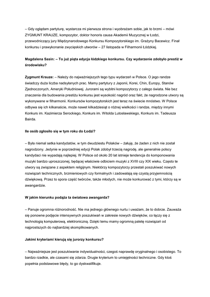 – Gdy oglądam partyturę, wystarcza mi pierwsza strona i wyobrażam sobie, jak to brzmi – mówi ZYGMUNT KRAUZE, kompozytor, doktor honoris causa Akademii Muzycznej w Łodzi, przewodniczący jury Międzynarodowego Konkursu Kompozytorskiego im. Grażyny Bacewicz. Finał konkursu i prawykonanie zwycięskich utworów – 27 listopada w Filharmonii Łódzkiej. Magdalena Sasin: – To już piąta edycja łódzkiego konkursu. Czy wydarzenie zdobyło prestiż w środowisku? Zygmunt Krauze: – Należy do najważniejszych tego typu wydarzeń w Polsce. O jego randze świadczy duża liczba nadsyłanych prac. Mamy partytury z Japonii, Korei, Chin, Europy, Stanów Zjednoczonych, Ameryki Południowej. Jurorami są wybitni kompozytorzy z całego świata. Nie bez znaczenia dla budowania prestiżu konkursu jest wysokość nagród oraz fakt, że nagrodzone utwory są wykonywane w filharmonii. Konkursów kompozytorskich jest teraz na świecie mnóstwo. W Polsce odbywa się ich kilkanaście, może nawet kilkadziesiąt o różnej wielkości i randze, między innymi Konkurs im. Kazimierza Serockiego, Konkurs im. Witolda Lutosławskiego, Konkurs im. Tadeusza Bairda. Ile osób zgłosiło się w tym roku do Łodzi? – Była niemal setka kandydatów, w tym dwudziestu Polaków – żałuję, że żaden z nich nie został nagrodzony. Jedynie w poprzedniej edycji Polak zdobył trzecią nagrodę, ale generalnie polscy kandydaci nie wypadają najlepiej. W Polsce od około 20 lat istnieje tendencja do komponowania muzyki bardzo uproszczonej, będącej właściwie odbiciem muzyki z XVIII czy XIX wieku. Często te utwory są związane z aspektem religijnym. Niektórzy kompozytorzy przestali poszukiwać nowych rozwiązań technicznych, brzmieniowych czy formalnych i zadowalają się czystą przyjemnością dźwiękową. Przez to spora część twórców, także młodych, nie może konkurować z tymi, którzy są w awangardzie. W jakim kierunku podąża ta światowa awangarda? – Panuje ogromna różnorodność. Nie ma jednego głównego nurtu i uważam, że to dobrze. Zauważa się ponowne podjęcie intensywnych poszukiwań w zakresie nowych dźwięków, co łączy się z technologią komputerową, elektroniczną. Dzięki temu mamy ogromną paletę rozwiązań od najprostszych do najbardziej skomplikowanych. Jakimi kryteriami kierują się jurorzy konkursu? – Najważniejsze jest poszukiwanie indywidualności, czegoś naprawdę oryginalnego i osobistego. To bardzo rzadkie, ale czasami się zdarza. Drugie kryterium to umiejętności techniczne. Gdy ktoś popełnia podstawowe błędy, to go dyskwalifikuje. Czy tym razem decyzja była trudna? – Nie, powiedziałbym wręcz, że obrady przebiegły bezkonfliktowo, choć jurorzy reprezentują różną estetykę i pochodzą z różnych krajów. Dobierając jako przewodniczący skład jury, kierowałem się właśnie różnorodnością. Osoby z różnych krajów, różnych pokoleń i estetyk dają sumę ocen z wielu punktów widzenia. W tym roku byli to: Steven Stucky z Nowego Jorku – profesor Juilliard School of Music, wybitny kompozytor, doradca filharmonii w Los Angeles i festiwalu w Aspen, związany z Polską poprzez Witolda Lutosławskiego, któremu pomógł zaistnieć za oceanem, Berislav Šipuš – kompozytor z Zagrzebia, aktualnie minister kultury Chorwacji, wybitny dyrygent muzyki najnowszej, założyciel znakomitego zespołu kameralnego Cantus, Mauricio Sotelo – kompozytor hiszpański, mieszkający obecnie w Berlinie, autor oper i utworów symfonicznych. Czy jurorzy zapoznają się ze wszystkimi partyturami? – Tak. W pierwszym i drugim etapie przyznaje się punkty, a w trzecim, ostatnim, odbywa się tajne głosowanie. Gdy decyzja jest już podjęta, sekretarz otwiera koperty z danymi uczestników i… czasami następuje niespodzianka. W tym roku dowiedzieliśmy się, że pierwszą nagrodę zdobył Hiszpan Manuel Burgos, który w poprzedniej edycji zajął drugie miejsce. Jego tegoroczna partytura wyglądała jednak kompletnie inaczej, nie dało się go rozpoznać. Zresztą, gdy oglądamy partyturę, nie myślimy o tym, kim jest kompozytor. Dla łódzkiego konkursu fakt, że zwyciężył Burgos, jest bardzo korzystny, bo to dojrzały twórca, wybitna postać w świecie muzyki. Trudno poznać utwór tylko na podstawie partytury, bez wysłuchania go? – Gdy oglądam partyturę, wystarcza mi pierwsza strona i w ciągu dwóch sekund wyobrażam sobie, co to jest i jak brzmi. Takie błyskawiczne zrozumienie sytuacji muzycznej wynika z wyobraźni i doświadczenia; byłem już w jury około 50 konkursów kompozytorskich, a w jednym konkursie może być nawet 700 partytur. Możliwość takiej oceny dzieła potwierdza fakt, że jurorzy tegorocznego konkursu zgadzali się w swoich opiniach w co najmniej 80 procentach. Jak wygląda praca współczesnego kompozytora? – Teraz może nim być prawie każdy. Wystarczy podstawowe wykształcenie muzyczne i umiejętność korzystania z technologii i już można układać piosenki czy inne proste utwory. Ja chcę mówić o kompozytorach, którzy są profesjonalnie wykształceni i uprawiają muzykę artystyczną, nie komercyjną. Ich liczba zwiększa się lawinowo. Do twórców z Europy i Stanów Zjednoczonych dołącza ogromna rzesza z Dalekiego Wschodu: Chin, Japonii i Korei. Tych najwybitniejszych, którzy potrafią żyć tylko z kompozycji, jest bardzo niewielu i oni pracują w podobny sposób, jak w poprzednich pokoleniach: borykają się z życiem i ze swoją sztuką, a w sensie materialnym starają się zdobyć zamówienia. Właśnie dlatego, że kompozytorów jest tak dużo, coraz większą rolę odgrywają konkursy: potrzebny jest jakiś sposób weryfikacji, a nagroda w konkursie to konkretny dorobek kompozytora. Trudno twórcy zdobyć zamówienie? – Obecnie łatwiej, bo jest coraz więcej fundacji i innych instytucji, które sponsorują kompozytorów. W Polsce po przemianach ustrojowych zapanował dziki kapitaliz