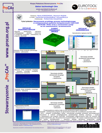 Wyspa Plakatowa Stowarzyszenia ProCAx Salon technologii CAx www.eurotool.krakow.pl 16 – 18 października 2012r Stowarzyszenie ProCAx www.procax.org.pl Autorzy: Marta KORDOWSKA, Wojciech MUSIAŁ e-mail: marteczka.kordowska@vp, [email protected] Instytucja: Politechnika Koszalińska Tytuł plakatu: Opracowanie przebiegu procesu technologicznego w zintegrowanym systemie komputerowym CAD/CAM (SerfCAM i MTS) wraz z zwróceniem uwagi na ich zastosowanie i przeznaczenie WIRTUALNE ŚRODOWISKO SERFCAM Rysunek powierzchni elementu podlegającego obróbce wykonany w programie AutoCAD i przeniesiony do programu SerfCAM ELEMENT PODLEGAJĄCY OBRÓBCE WIRTUALNE ŚRODOWISKO MTS Samodzielnie napisany kod NC Ukazanie drogi przejazdu pierwszego narzędzia – planowanie Symulacja obróbki skrawaniem pierwszego narzędzia – planowanie Ukazanie drogi przejazdu drugiego i zarazem trzeciego narzędzia – nawiercanie i wiercenie Symulacja obróbki skrawaniem drugiego narzędzia – nawiercanie Symulacja obróbki skrawaniem trzeciego narzędzia – wiercenie Ukazanie drogi przejazdu czwartego narzędzia – wiercenie Symulacja obróbki skrawaniem czwartego narzędzia – wiercenie Wygenerowany kod NC Przeprowadzona analiza miała na celu porównanie dwóch programów: SerfCAM – profesjonalny program do generowania kodów NC na podstawie rysunków CAD i MTS – program umożliwiający naukę i wizualizację przebiegu procesów technologicznych. Oczywiście w realiach przedsiębiorstwa produkcyjnego bardziej użyteczny i szybszy w zastosowaniu jest program SerfCAM, umożliwiający wygenerowanie kodu NC zarówno dla prostych elementów, jaki i dla powierzchni krzywoliniowych. Ale czasem wygenerowany kod może być bardzo skomplikowany i obszerny, dlatego wprawiony programista może go uprościć, aby nabrać wprawy w pisaniu kodów NC warto korzystać z takiego systemu jak MTS. Autorzy prac zaprezentują szerzej swoje dokonania podczas prezentacji na „Sesji Plakatowej 17 i/lub 18 października 2012r. w Krakowie. Więcej na www.procax.org.pl Zapraszamy wszystkich zainteresowanych do prezentacji dokonań! Plakat w postaci elektronicznej można pobrać ze strony: www.procax.org.pl Najlepsze prace zostaną opublikowane jako typowe artykuły w miesięczniku Mechanik nr 1, 2 i 3 2013