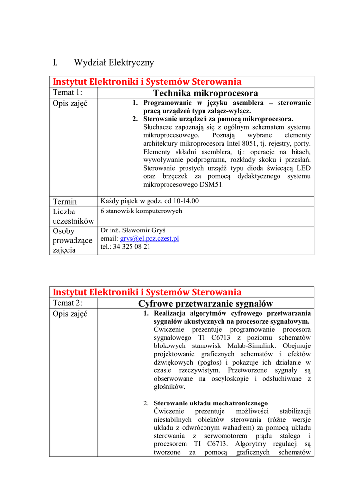 I. Wydział Elektryczny Instytut Elektroniki i Systemów Sterowania