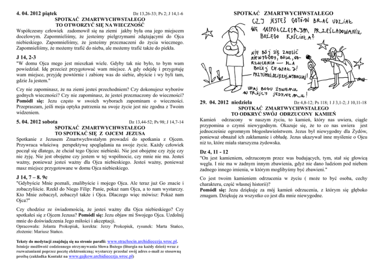 4. 04. 2012 piątek SPOTKAĆ ZMARTWYCHWSTAŁEGO Dz 13,26-33; Ps 2; J 14,1-6 SPOTKAĆ ZMARTWYCHWSTAŁEGO TO OTWORZYĆ SIĘ NA WIECZNOŚĆ Współczesny człowiek zadomowił się na ziemi jakby była ona jego miejscem docelowym. Zapomnieliśmy, że jesteśmy pielgrzymami zdążającymi do Ojca niebieskiego. Zapomnieliśmy, że jesteśmy przeznaczeni do życia wiecznego. Zapomnieliśmy, że możemy trafić do nieba, ale możemy trafić także do piekła. J 14, 2-3 "W domu Ojca mego jest mieszkań wiele. Gdyby tak nie było, to bym wam powiedział. Idę przecież przygotować wam miejsce. A gdy odejdę i przygotuję wam miejsce, przyjdę powtórnie i zabiorę was do siebie, abyście i wy byli tam, gdzie Ja jestem." Czy nie zapominasz, że na ziemi jesteś przechodniem? Czy dokonujesz wyborów godnych wieczności? Czy nie zapominasz, że jesteś przeznaczony do wieczności? Pomódl się: Jezu często w swoich wyborach zapominam o wieczności. Przepraszam, jeśli moja optyka patrzenia na swoje życie jest nie zgodna z Twoim widzeniem. 5. 04. 2012 sobota Dz 13,44-52; Ps 98; J 14,7-14 SPOTKAĆ ZMARTWYCHWSTAŁEGO TO SPOTKAĆ SIĘ Z OJCEM JEZUSA Spotkanie z Jezusem Zmartwychwstałym prowadzi do spotkania z Ojcem. Przywraca właściwą perspektywę spoglądania na swoje życie. Każdy człowiek począł się dlatego, że chciał tego Ojciec niebieski. Nie jest obojętne czy żyję czy nie żyję. Nie jest obojętne czy jestem w tej wspólnocie, czy mnie nie ma. Jesteś ważny, ponieważ jesteś ważny dla Ojca niebieskiego. Jesteś ważny, ponieważ masz miejsce przygotowane w domu Ojca niebieskiego. J 14, 7 – 8. 9c "Gdybyście Mnie poznali, znalibyście i mojego Ojca. Ale teraz już Go znacie i zobaczyliście. Rzekł do Niego Filip: Panie, pokaż nam Ojca, a to nam wystarczy. Kto Mnie zobaczył, zobaczył także i Ojca. Dlaczego więc mówisz: Pokaż nam Ojca?" Czy chodzisz ze świadomością, że jesteś ważny dla Ojca niebieskiego? Czy spotkałeś się z Ojcem Jezusa? Pomódl się: Jezu objaw mi Swojego Ojca. Uzdolnij mnie do doświadczenia Jego miłości i akceptacji. Opracowała: Jolanta Prokopiuk, korekta: Jerzy Prokopiuk, rysunek: Marta Stańco, złożenie: Mariusz Stańco. Teksty do medytacji znajdują się na stronie parafii: www.strachocin.archidiecezja.wroc.pl. Istnieje możliwość codziennego otrzymywania Słowa Bożego (liturgia na każdy dzień) wraz z rozważaniami poprzez pocztę elektroniczną; wystarczy przesłać swój adres e-mail ze stosowną prośbą (zakładka Kontakt na www.gajkow.archidiecezja.wroc.pl) 29. 04. 2012 niedziela Dz 4,8-12; Ps 118; 1 J 3,1-2; J 10,11-18 SPOTKAĆ ZMARTWYCHWSTAŁEGO TO ODKRYĆ SWÓJ ODRZUCONY KAMIEŃ Kamień odrzucony w naszym życiu, to kamień, który nas uwiera, ciągle przypomina o czymś niewygodnym. Okazuje się, że to co nas uwiera jest jednocześnie ogromnym błogosławieństwem. Jezus był niewygodny dla Żydów, ponieważ obnażał ich zakłamanie i obłudę. Jezus ukazywał inne myślenie o Ojcu niż to, które miała starszyzna żydowska. Dz 4, 11 - 12 "On jest kamieniem, odrzuconym przez was budujących, tym, stał się głowicą węgla. I nie ma w żadnym innym zbawienia, gdyż nie dano ludziom pod niebem żadnego innego imienia, w którym moglibyśmy być zbawieni." Co jest twoim kamieniem odrzucenia w życiu ( może to być osoba, cechy charakteru, część własnej historii)? Pomódl się: Jezu dziękuję za mój kamień odrzucenia, z którym się głęboko zmagam. Dziękuję za wszystko co jest dla mnie niewygodne. 30. 04. 2012 poniedziałek Dz 11,1-18; Ps 42; J 10,1-10 2. 05. 2012 środa Dz 12,24-13,5; Ps 67; J 12,44-50 SPOTKAĆ ZMARTWYCHWSTAŁEGO TO PRZEKRACZAĆ SWOJE LUDZKIE MYŚLENIE Jezus Chrystus był synem Narodu Wybranego i zapowiadany przez proroków przyszedł do tego Narodu. Upłynęły 42 pokolenia od Abrahama do narodzenia Jezusa. Bóg żywy zapragnął wtedy wkroczyć również w życie pogan i nasze życie jako potomków tychże pogan. Dla pierwszych chrześcijan pochodzenia żydowskiego było to trudne do przyjęcia. Posłuszeństwo okazane Bogu sprawiło jednak, że Dobra Nowina o Jezusie Chrystusie dotarła również do nas. SPOTKAĆ ZMARTWYCHWSTAŁEGO TO WRACAĆ DO WSPÓLNOTY Duch tego świata dzieli i atomizuje ludzi. Zamykani jesteśmy w swoim domu i w swoich potrzebach. W konsekwencji żyjemy w samotności i z poczuciem porzucenia i osamotnienia. Duch Jezusa jednoczy, wysyła po dwóch i prowadzi do szerszej wspólnoty. Paweł i Barnaba zostali posłani we dwóch na swoją pierwszą wyprawę misyjną i posłani nie tylko przez Ducha Świętego, ale także przez wspólnotę. Dz 11, 1-3 Dz 13, 2-3 "Apostołowie i bracia, przebywający w Judei, dowiedzieli się, że również poganie przyjęli słowo Boże. Kiedy Piotr przybył do Jerozolimy, ci, którzy byli pochodzenia żydowskiego, robili mu wymówki: Wszedłeś do ludzi nieobrzezanych – mówili – i jadłeś z nimi." "Gdy odprawiali publiczne nabożeństwo i pościli, rzekł Duch Święty: Wyznaczcie mi już Barnabę i Szawła do dzieła, do którego ich powołałem. Wtedy po poście i modlitwie oraz po nałożeniu na nich rąk wyprawili ich." Jakie myślenie ludzkie w twoim życiu jest trudne do przekroczenia? Czy wiesz co Bóg myśli o twoich problemach i sprawach, jak On je widzi? Pomódl się: Jezu ukaż mi moje ludzkie myślenie, które niszczy Twoje plany. Daj mi przyjąć Twoje myślenie w moim życiu. 1. 05. 2012 wtorek Rdz 1,26-2,3 lub Kol 3,1-24; Ps 90; Mt 13,54-58 SPOTKAĆ ZMARTWYCHWSTAŁEGO TO PRZYJMOWAĆ BOŻY PLAN Prześladowanie to cierpienie fizyczne i psychiczne. To znoszenie niewygód. To także doświadczenie zagrożenia. Chrześcijaństwo się rozszerzało, ponieważ pierwsi chrześcijanie przez prześladowania zostali zmuszeni do opuszczenia swoich środowisk. Było im dobrze w ich braterskiej wspólnocie i zapewne nie byli skorzy aby gdziekolwiek iść. Człowiek ma tendencje do zamykania się w swoim samozadowoleniu i poczuciu