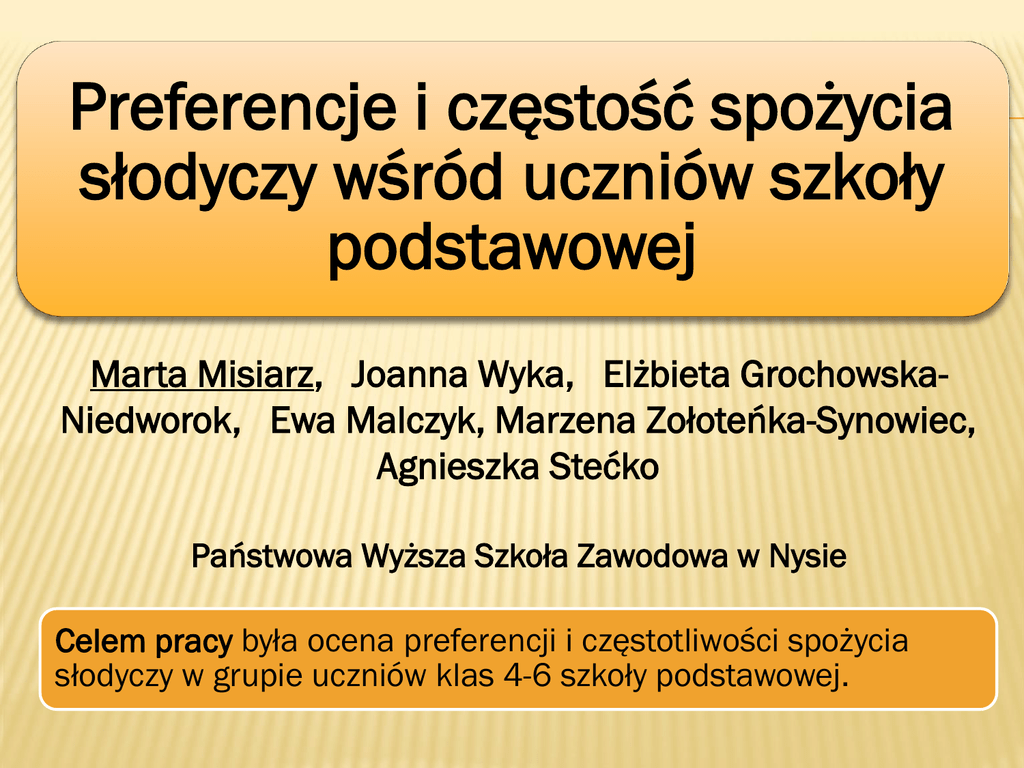 Preferencje i częstość spożycia słodyczy wśród uczniów szkoły podstawowej Marta Misiarz, Joanna Wyka, Elżbieta GrochowskaNiedworok, Ewa Malczyk, Marzena Zołoteńka-Synowiec, Agnieszka Stećko Państwowa Wyższa Szkoła Zawodowa w Nysie Celem pracy była ocena preferencji i częstotliwości spożycia słodyczy w grupie uczniów klas 4-6 szkoły podstawowej. Materiał i metody Badania zostały przeprowadzone w pierwszej połowie 2013 roku, wśród 140 uczniów (74 dziewczynki i 66 chłopców) z klas 4-6 uczących się w jednej z nyskich szkół podstawowych. Zastosowano metodę sondażu diagnostycznego, wykorzystując autorski kwestionariusz ankiety składający się z pytań o charakterze zamkniętym, w którym wykorzystano następującą skalę preferencji: „bardzo lubię”, „lubię”, „ani lubię, ani nie lubię” (pole neutralne), „nie lubię”, „bardzo nie lubię”. Możliwe było również udzielenie odpowiedzi „nie spożywam”. W celu dokonania oceny częstotliwości spożycia słodyczy poproszono respondentów o zakwalifikowanie swoich odpowiedzi do następujących kategorii: „kilka razy dziennie”, „raz dziennie”, „kilka razy w tygodniu”, „kilka razy w miesiącu”, „rzadziej lub wcale”. Wyniki W badaniu wykazano, że większość dzieci szkoły podstawowej z klas 4-6 „bardzo lubi” lub „lubi” słodycze i często je spożywa Tabela I. Preferencje uczniów klas 4-6 szkoły podstawowej dotyczące wybranego asortymentu słodyczy wg % uzyskanych odpowiedzi co do skali preferencji. Wybrany asortyment słodyczy Czekolada gorzka Czekolada mleczna Czekolada z orzechami Batony Ciasta, ciastka Cukierki czekoladowe Cukierki owocowe Cukier Miód Dżem, marmolada Bardzo lubię 9,3 36,5 51,4 30,0 35,0 14,3 29,3 10,0 21,4 28,6 Lubię 22,1 46,4 30,0 48,6 50,8 37,8 41,4 43,6 32,2 34,3 Skala preferencji [%] Ani lubię, Nie Bardzo nie ani nie lubię lubię lubię 16,4 17,9 5,0 10,0 2,1 3,6 8,6 3,6 0,7 15,0 2,1 0,0 10,0 1,4 1,4 24,3 7,9 4,3 15,0 3,6 4,3 26,4 9,3 5,0 16,4 9,3 7,1 12,1 7,1 3,6 Nie spożywam 29,3 1,4 5,7 4,3 1,4 11,4 6,4 5,7 13,6 14,3 Tabela II. Częstotliwość spożycia wybranego asortymentu słodyczy przez uczniów klas 4-6 szkoły podstawowej wg % uzyskanych odpowiedzi co do skali częstości spożycia. Wybrany asortyment Skala częstości spożycia [%] słodyczy Kilka razy Raz Kilka razy w Kilka razy Rzadziej dziennie dziennie tygodniu w miesiącu Czekolada gorzka 0,7 2,9 9,3 20,7 66,4 Czekolada mleczna 2,9 8,6 37,1 19,3 32,1 Czekolada z orzechami 6,4 5,0 37,9 21,4 29,3 Batony 7,9 29,3 15,7 16,4 30,7 Ciasta, ciastka 10,0 36,5 11,4 10,0 32,1 Cukierki czekoladowe 7,1 8,6 14,3 27,1 42,9 Cukierki owocowe 12,9 27,1 24,3 22,1 13,6 Cukier 23,6 16,4 10,0 22,9 27,1 Miód 7,9 9,3 19,3 21,4 42,1 Dżem, marmolada 10,0 24,3 23,6 30,0 12,1 Wnioski Najbardziej lubiane przez uczniów klas 4-6 były: czekolada z orzechami, następnie ciastka i ciasta, czekolada mleczna oraz batony i cukierki owocowe. Badana grupa wykazała się dużą częstotliwością spożycia słodyczy, co może przyczynić się do wzrostu masy ciała i rozwoju innych chorób towarzyszących otyłości.