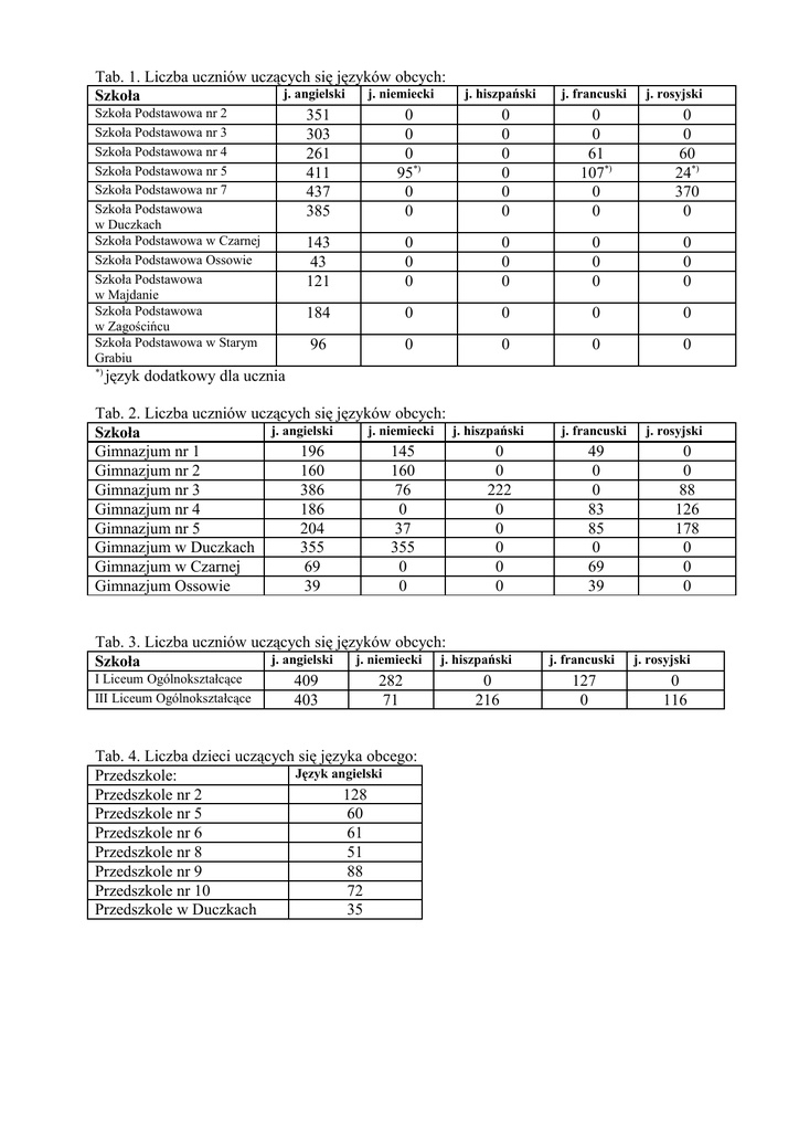 Tab. 1. Liczba uczniów uczących się języków obcych: j. angielski j. niemiecki Szkoła Szkoła Podstawowa nr 2 351 0 Szkoła Podstawowa nr 3 303 0 Szkoła Podstawowa nr 4 261 0 Szkoła Podstawowa nr 5 411 95*) Szkoła Podstawowa nr 7 437 0 Szkoła Podstawowa 385 0 w Duczkach Szkoła Podstawowa w Czarnej Szkoła Podstawowa Ossowie Szkoła Podstawowa w Majdanie Szkoła Podstawowa w Zagościńcu Szkoła Podstawowa w Starym Grabiu *) j. hiszpański j. francuski j. rosyjski 0 0 0 0 0 0 0 0 61 107*) 0 0 0 0 60 24*) 370 0 143 43 121 0 0 0 0 0 0 0 0 0 0 0 0 184 0 0 0 0 96 0 0 0 0 język dodatkowy dla ucznia Tab. 2. Liczba uczniów uczących się języków obcych: j. angielski j. niemiecki j. hiszpański Szkoła Gimnazjum nr 1 196 145 0 Gimnazjum nr 2 160 160 0 Gimnazjum nr 3 386 76 222 Gimnazjum nr 4 186 0 0 Gimnazjum nr 5 204 37 0 Gimnazjum w Duczkach 355 355 0 Gimnazjum w Czarnej 69 0 0 Gimnazjum Ossowie 39 0 0 Tab. 3. Liczba uczniów uczących się języków obcych: j. angielski j. niemiecki j. hiszpański Szkoła I Liceum Ogólnokształcące 409 282 0 III Liceum Ogólnokształcące 403 71 216 Tab. 4. Liczba dzieci uczących się języka obcego: Język angielski Przedszkole: Przedszkole nr 2 128 Przedszkole nr 5 60 Przedszkole nr 6 61 Przedszkole nr 8 51 Przedszkole nr 9 88 Przedszkole nr 10 72 Przedszkole w Duczkach 35 j. francuski 49 0 0 83 85 0 69 39 j. francuski 127 0 j. rosyjski 0 0 88 126 178 0 0 0 j. rosyjski 0 116