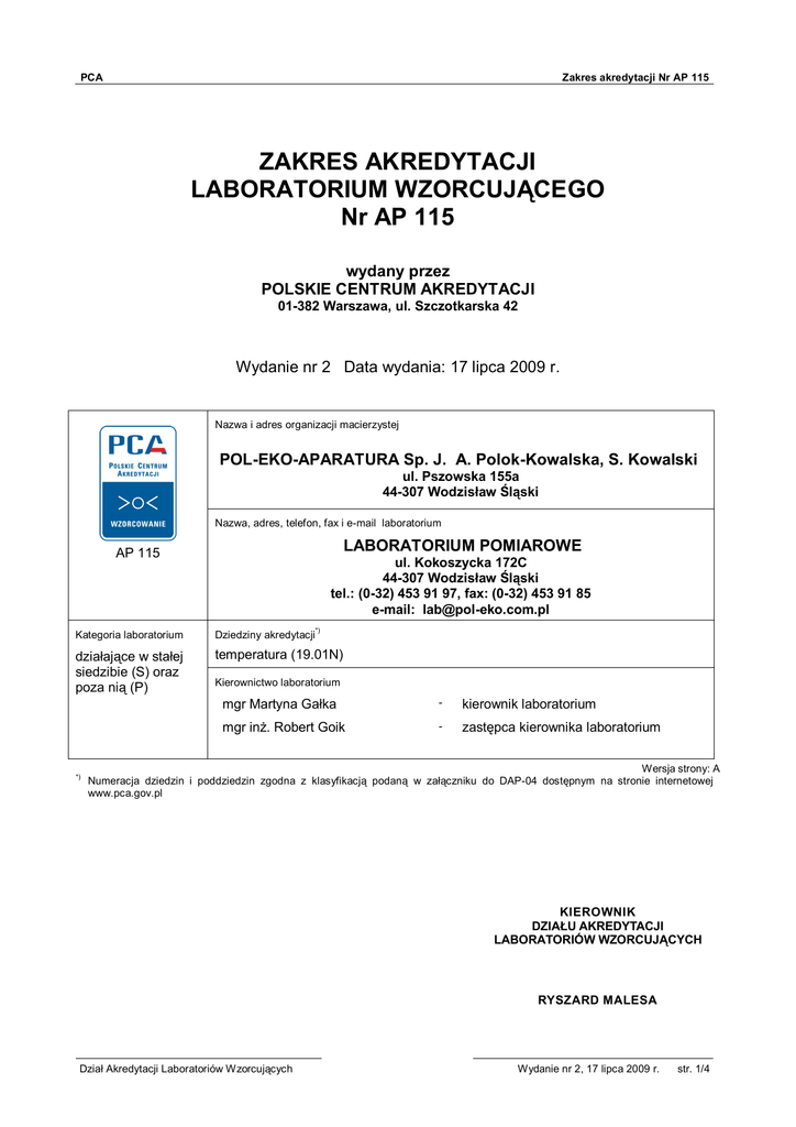 PCA Zakres akredytacji Nr AP 115 ZAKRES AKREDYTACJI LABORATORIUM WZORCUJĄCEGO Nr AP 115 wydany przez POLSKIE CENTRUM AKREDYTACJI 01-382 Warszawa, ul. Szczotkarska 42 Wydanie nr 2 Data wydania: 17 lipca 2009 r. Nazwa i adres organizacji macierzystej POL-EKO-APARATURA Sp. J. A. Polok-Kowalska, S. Kowalski ul. Pszowska 155a 44-307 Wodzisław Śląski Nazwa, adres, telefon, fax i e-mail laboratorium LABORATORIUM POMIAROWE AP 115 ul. Kokoszycka 172C 44-307 Wodzisław Śląski tel.: (0-32) 453 91 97, fax: (0-32) 453 91 85 e-mail: [email protected] *) Kategoria laboratorium Dziedziny akredytacji działające w stałej siedzibie (S) oraz poza nią (P) temperatura (19.01N) *) Kierownictwo laboratorium mgr Martyna Gałka - kierownik laboratorium mgr inż. Robert Goik - zastępca kierownika laboratorium Wersja strony: A Numeracja dziedzin i poddziedzin zgodna z klasyfikacją podaną w załączniku do DAP-04 dostępnym na stronie internetowej www.pca.gov.pl KIEROWNIK DZIAŁU AKREDYTACJI LABORATORIÓW WZORCUJĄCYCH RYSZARD MALESA Dział Akredytacji Laboratoriów Wzorcujących Wydanie nr 2, 17 lipca 2009 r. str. 1/4 PCA Nazwa wielkości fizycznej i rodzaj przyrządu pomiarowego Zakres akredytacji Nr AP 115 Zakres pomiarowy Najlepsza możliwość pomiarowa*) Kat. Lab. Uwagi 19. Temperatura 19.01N termometria elektryczna Termometry elektryczne i elektroniczne Rejestratory temperatury Komory klimatyczne, termostatyczne, łaźnie laboratoryjne 1) Piece wysokotemperaturowe 1) o (-20 ÷ 80) C o (80 ÷ 200) C (200 ÷ 1000) oC o o 0,05 C o 0,06 C o 2,5 C o S Wzorcowanie w termostacie cieczowym Wzorcowanie w komorze termostatycznej (0 ÷ 60) C 0,2 C S (-20 ÷ 200) oC 0,14 oC 2) S, P (200 ÷ 1000) oC 2,6 oC 2) S, P Wzorcowanie w piecu pionowym Wersja strony: A *) Podane wartości niepewności stanowią niepewność rozszerzoną przy poziomie ufności ok. 95 % i współczynniku rozszerzenia k = 2. 1) Możliwość dokonania pomiaru z jednoczesną rejestracją do 30 punktów w przestrzeni obiektu wzorcowanego. 2) Wartość najlepszej możliwości pomiarowej dotyczy pojedynczego punktu pomiarowego w przestrzeni obiektu wzorcowanego. Laboratorium ma możliwość wydawania świadectw pomiaru opatrzonych symbolem akredytacji PCA w ramach posiadanego zakresu akredytacji w poddziedzinie 19.01N. Dział Akredytacji Laboratoriów Wzorcujących Wydanie nr 2, 17 lipca 2009 r. str. 2/4 PCA Zakres akredytacji Nr AP 115 Personel akredytowany Imię i nazwisko Stanowisko służbowe Nazwa wielkości fizycznej i rodzaj przyrządu pomiarowego Martyna Gałka kierownik laboratorium Temperatura - termometry elektryczne i elektroniczne - rejestratory temperatury - komory klimatyczne i termostatyczne - łaźnie laboratoryjne Robert Goik zastępca kierownika laboratorium - termometry elektryczne i elektroniczne - rejestratory temperatury - komory klimatyczne i termostatyczne - łaźnie laboratoryjne - piece wysokotemperaturowe Marek Pluta specjalista ds. pomiarów - termometry elektryczne i elektroniczne - rejestratory temperatury - komory klimatyczne i termostatyczne - łaźnie laboratoryjne - piece wysokotemperaturowe Michał Marszałek pracownik laboratorium - komory klimatyczne i termostatyczne - łaźnie laboratoryjne - piece wysokotemperaturowe Łukasz Pompa pracownik laboratorium jw. Wersja strony: A Dział Akredytacji Laboratoriów Wzorcujących Wydanie nr 2, 17 lipca 2009 r. str. 3/4 PCA Zakres akredytacji Nr AP 115 Wykaz zmian Zakresu Akredytacji Nr AP 115 Status zmian: wersja pierwotna - A Zatwierdzam status zmian KIEROWNIK DZIAŁU AKREDYTACJI LABORATORIÓW WZORCUJĄCYCH RYSZARD MALESA dnia: 17.07.2009 r. Dział Akredytacji Laboratoriów Wzorcujących Wydanie nr 2, 17 lipca 2009 r. str. 4/4