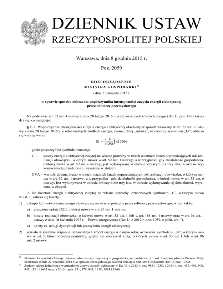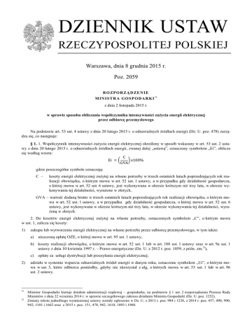 DZIENNIK USTAW RZECZYPOSPOLITEJ POLSKIEJ Warszawa, dnia 8 grudnia 2015 r. Poz. 2059 RO ZPO R ZĄ D ZE N I E M INI S TR A GO SPO DA RK I 1) z dnia 2 listopada 2015 r. w sprawie sposobu obliczania współczynnika intensywności zużycia energii elektrycznej przez odbiorcę przemysłowego Na podstawie art. 53 ust. 4 ustawy z dnia 20 lutego 2015 r. o odnawialnych źródłach energii (Dz. U. poz. 478) zarządza się, co następuje: § 1. 1. Współczynnik intensywności zużycia energii elektrycznej określony w sposób wskazany w art. 53 ust. 2 ustawy z dnia 20 lutego 2015 r. o odnawialnych źródłach energii, zwanej dalej „ustawą”, oznaczony symbolem „Ei”, oblicza się według wzoru: C Ei = x100% GVA gdzie poszczególne symbole oznaczają: C – koszty energii elektrycznej zużytej na własne potrzeby w trzech ostatnich latach poprzedzających rok realizacji obowiązku, o którym mowa w art. 52 ust. 1 ustawy, a w przypadku gdy działalność gospodarcza, o której mowa w art. 52 ust. 6 ustawy, jest wykonywana w okresie krótszym niż trzy lata, w okresie wykonywania tej działalności, wyrażone w złotych, GVA – wartość dodaną brutto w trzech ostatnich latach poprzedzających rok realizacji obowiązku, o którym mowa w art. 52 ust. 1 ustawy, a w przypadku gdy działalność gospodarcza, o której mowa w art. 52 ust. 6 ustawy, jest wykonywana w okresie krótszym niż trzy lata, w okresie wykonywania tej działalności, wyrażoną w złotych. 2. Do kosztów energii elektrycznej zużytej na własne potrzeby, oznaczonych symbolem „C”, o którym mowa w ust. 1, zalicza się koszty: 1) zakupu lub wytworzenia energii elektrycznej na własne potrzeby przez odbiorcę przemysłowego, w tym także: a) uiszczoną opłatę OZE, o której mowa w art. 95 ust. 1 ustawy, b) koszty realizacji obowiązku, o którym mowa w art. 52 ust. 1 lub w art. 188 ust. 1 ustawy oraz w art. 9a ust. 1 ustawy z dnia 10 kwietnia 1997 r. – Prawo energetyczne (Dz. U. z 2012 r. poz. 1059, z późn. zm. 2)), c) 2) 1) 2) opłaty za usługi dystrybucji lub przesyłania energii elektrycznej; udziału w systemie wsparcia odnawialnych źródeł energii w danym roku, oznaczone symbolem „Ui”, o którym mowa w ust. 3, które odbiorca poniósłby, gdyby nie skorzystał z ulg, o których mowa w art. 53 ust. 1 lub w art. 96 ust. 2 ustawy. Minister Gospodarki kieruje działem administracji rządowej – gospodarka, na podstawie § 1 ust. 2 rozporządzenia Prezesa Rady Ministrów z dnia 22 września 2014 r. w sprawie szczegółowego zakresu działania Ministra Gospodarki (Dz. U. poz. 1252). Zmiany tekstu jednolitego wymienionej ustawy zostały ogłoszone w Dz. U. z 2013 r. poz. 984 i 1238, z 2014 r. poz. 457, 490, 900, 942, 1101 i 1662 oraz z 2015 r. poz. 151, 478, 942, 1618, 1893 i 1960. Dziennik Ustaw –2– Poz. 2059 3. Koszty udziału w systemie wsparcia odnawialnych źródeł energii w danym roku, oznaczone symbolem „Ui”, oblicza się według wzoru: % xZoixOzjixEoi 100% − Ri xSRixEpi % Ui = + 100% 100% gdzie poszczególne symbole oznaczają: Eui – ilość energii elektrycznej określoną w art. 53 ust. 1 lub w art. 188 ust. 7 ustawy, w odniesieniu do której został dla danego odbiorcy przemysłowego wykonany obowiązek, o którym mowa w art. 52 ust. 1 lub w art. 188 ust. 1 ustawy, w danym roku „i”, wyrażoną w procentach, Zoi – udział, o którym mowa w art. 59 ustawy lub w przepisach wydanych na podstawie art. 60 ustawy, lub w art. 190 ustawy, w danym roku „i”, wyrażony w procentach, Ozji – jednostkową opłatę zastępczą, o której mowa w art. 56 lub w art. 188 ust. 16 ustawy, obowiązującą w danym roku „i”, wyrażoną w zł/MWh, Eoi – ilość energii elektrycznej zakupionej na własny użytek przez odbiorcę przemysłowego w danym roku „i”, wyrażoną w MWh, Ri – ilość energii elektrycznej określoną zgodnie z art. 96 ust. 2 ustawy, dla danego roku „i”, wyrażoną w procentach, SRi – stawkę opłaty OZE, o której mowa w art. 98 ust. 1 ustawy, obowiązującą w danym roku „i”, wyrażoną w zł/MWh, Epi – ilość energii elektrycznej pobranej z sieci i zużytej przez danego odbiorcę przemysłowego w danym roku „i”, wyrażoną w MWh. 4. Wartość dodaną brutto, oznaczoną symbolem „GVA”, o której mowa w ust. 1, oblicza się dla: 1) jednostek sporządzających rachunek zysków i strat zgodnie z art. 47 ust. 4 pkt 1 ustawy z dnia 29 września 1994 r. o rachunkowości (Dz. U. z 2013 r. poz. 330, z późn. zm.3)) w wariancie porównawczym, jako przychody netto ze sprzedaży i zrównane z nimi pomniejszone o koszty działalności operacyjnej po wyłączeniu kosztów amortyzacji, wynagrodzeń oraz ubezpieczeń społecznych i innych świadczeń pracowniczych, powiększone o pozostałe przychody operacyjne oraz pomniejszone o pozostałe koszty operacyjne; 2) jednostek sporządzających rachunek zysków i strat zgodnie z art. 47 ust. 4 pkt 1 ustawy z dnia 29 września 1994 r. o rachunkowości w wariancie kalkulacyjnym, jako przychody netto ze sprzedaży produktów, towarów i materiałów pomniejszone o koszty sprzedanych produktów, towarów i materiałów, koszty sprzedaży oraz koszty ogólnego zarządu po wyłączeniu kosztów amortyzacji, wynagrodzeń oraz ubezpieczeń społecznych i innych świadczeń pracowniczych, powiększone o pozostałe przychody operacyjne oraz pomniejszone o pozostałe koszty operacyjne; 3) jednostek sporządzających sprawozdania finansowe jednostki zgodnie z Międzynarodowymi Standardami Rachunkowości na podstawie art. 45 ustawy z dnia 29 września 1994 r. o rachunkowości, jako przychody ze sprzedaży powiększone o pozostałe przychody operacyjne, pomniejszone o koszty działalności operacyjnej po wyłączeniu kosztów amortyzacji oraz kosztów świadczeń pracowniczych, w tym kosztów wynagrodzeń oraz ubezpieczeń społecznych i innych świadczeń pracowniczych, oraz pomniejszone o pozostałe koszty operacyjne; 4) jedn