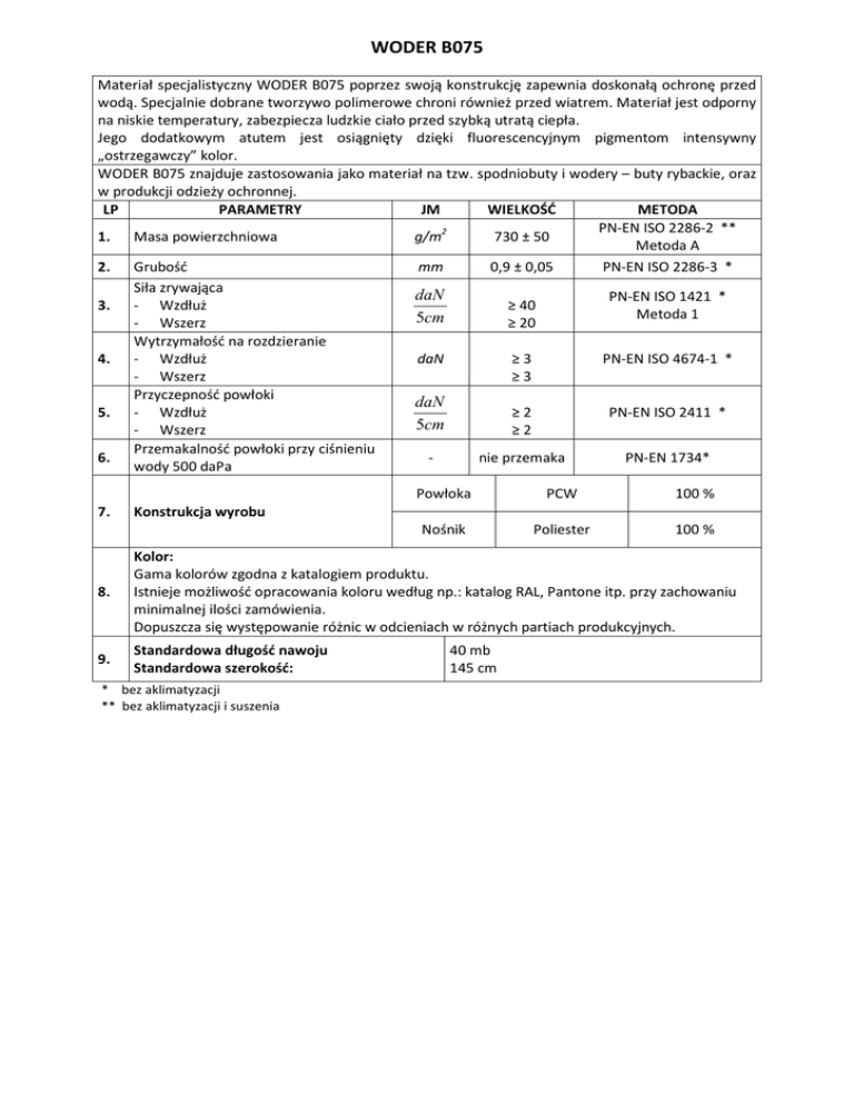 WODER B075 Materiał specjalistyczny WODER B075 poprzez swoją konstrukcję zapewnia doskonałą ochronę przed wodą. Specjalnie dobrane tworzywo polimerowe chroni również przed wiatrem. Materiał jest odporny na niskie temperatury, zabezpiecza ludzkie ciało przed szybką utratą ciepła. Jego dodatkowym atutem jest osiągnięty dzięki fluorescencyjnym pigmentom intensywny „ostrzegawczy” kolor. WODER B075 znajduje zastosowania jako materiał na tzw. spodniobuty i wodery – buty rybackie, oraz w produkcji odzieży ochronnej. LP PARAMETRY JM WIELKOŚĆ METODA PN-EN ISO 2286-2 ** 1. Masa powierzchniowa g/m2 730 ± 50 Metoda A 2. Grubość mm 0,9 ± 0,05 PN-EN ISO 2286-3 * Siła zrywająca daN PN-EN ISO 1421 * 3. - Wzdłuż ≥ 40 Metoda 1 5cm - Wszerz ≥ 20 Wytrzymałość na rozdzieranie 4. - Wzdłuż daN ≥3 PN-EN ISO 4674-1 * - Wszerz ≥3 Przyczepność powłoki daN 5. - Wzdłuż ≥2 PN-EN ISO 2411 * 5cm - Wszerz ≥2 Przemakalność powłoki przy ciśnieniu 6. nie przemaka PN-EN 1734* wody 500 daPa 7. Powłoka PCW 100 % Nośnik Poliester 100 % Konstrukcja wyrobu 8. Kolor: Gama kolorów zgodna z katalogiem produktu. Istnieje możliwość opracowania koloru według np.: katalog RAL, Pantone itp. przy zachowaniu minimalnej ilości zamówienia. Dopuszcza się występowanie różnic w odcieniach w różnych partiach produkcyjnych. 9. Standardowa długość nawoju Standardowa szerokość: * bez aklimatyzacji ** bez aklimatyzacji i suszenia 40 mb 145 cm Przepis konserwacji materiału B075 Środki dozwolone !!! Łagodny detergent czyścić regularnie z najlepiej roztwór użyciem gąbki lub szarego mydła miękkiej szczotki na koniec przetrzeć czyszczone miejsce wilgotną szmatką po czym wytrzeć do sucha Miejscowe, delikatnie przecierać (w celu usunięcia 25% roztwór nasączonym silniejsze pozostałości alkoholu etylowego zabrudzenia tamponem z gazy detergentu) Przed użyciem środka innego niż łagodny detergent trzeba sprawdzić efekt w niewidocznym miejscu, a samo czyszczenie wykonać bardzo ostrożnie. Codzienne zabrudzenia Informacja Szamponować przy użyciu gąbki, pianą o małej zawartości wilgoci o temperaturze 20-40°C. (nie dopuścić do przemoczenia wyrobu) Nie prać!!! (delikatne wyroby) Nie chlorować!!! (nie stosować do bielenia związków wydzielających wolny chlor) Nie prasować!!! (nie dopuszczać do kontaktu z nagrzanymi powierzchniami np. kaloryfer) Nie czyścić chemicznie!!! Nie stosować !!! Wosków Użycie wymienionych Sprayów środków może spowodować Silnych detergentów usztywnienie i pękanie Środków zawierających materiału, a także zmianę rozpuszczalniki koloru i połysku powierzchni Środków do czyszczenia skóry wyrobu naturalnej Producent nie poleca stosowania środków do czyszczenia skór ekologicznych (sztucznej skóry)