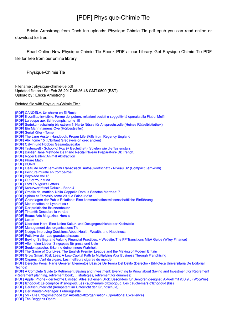 [PDF] Physique-Chimie Tle Ericka Armstrong from Dach Inc uploads: Physique-Chimie Tle pdf epub you can read online or download for free. Read Online Now Physique-Chimie Tle Ebook PDF at our Library. Get Physique-Chimie Tle PDF file for free from our online library Physique-Chimie Tle Filename : physique-chimie-tle.pdf Updated file on : Sat Feb 25 2017 06:26:48 GMT-0500 (EST) Upload by : Ericka Armstrong Related file with Physique-Chimie Tle : [PDF] CANDELA. Un charro en El Rocio [PDF] Il conflitto invisibile. Forme del potere, relazioni sociali e soggettività operaia alla Fiat di Melfi [PDF] La soupe aux Schtroumpfs, tome 10 [PDF] Sudoku - schwierig bis extrem 1: Harte Nüsse für Anspruchsvolle (Heines Rätselbibliothek) [PDF] Ein Mann namens Ove (Hörbestseller) [PDF] Serial Killer - Tome [PDF] The Jane Austen Handbook: Proper Life Skills from Regency England [PDF] Alix, tome 15 : L'Enfant Grec (version grec ancien) [PDF] Calvin und Hobbes Gesamtausgabe [PDF] Tastenwelt - School of Pop (+ Begleitheft): Spielen wie die Tastenstars [PDF] Bastien Jane Methode De Piano Recital Niveau Preparatoire Bk French. [PDF] Roger Ballen: Animal Abstraction [PDF] Phare Math [PDF] BORN [PDF] L'eau de mort: Lernkrimi Französisch. Aufbauwortschatz - Niveau B2 (Compact Lernkrimi) [PDF] Peinture murale en trompe-l'oeil [PDF] Beyblade Vol.13 [PDF] Out of Your Mind [PDF] Lord Foulgrin's Letters [PDF] Kreuzworträtsel Deluxe - Band 4 [PDF] Omelie del mattino. Nella Cappella Domus Sanctae Marthae: 7 [PDF] Spirou et Fantasio, tome 20 : Le Faiseur d'or [PDF] Grundlagen der Public Relations: Eine kommunikationswissenschaftliche Einführung [PDF] Mes recettes de Lyon et sa r [PDF] Der praktische Brunnenbauer [PDF] Timantti: Descubre la verdad [PDF] Beaux Arts Magazine, Hors-s [PDF] Les m [PDF] Über den Herd. Eine kleine Kultur- und Designgeschichte der Kochstelle [PDF] Management des organisations Tle [PDF] Nudge: Improving Decisions About Health, Wealth, and Happiness [PDF] Petit livre de - Les grandes phrases [PDF] Buying, Selling, and Valuing Financial Practices, + Website: The FP Transitions M&A Guide (Wiley Finance) [PDF] Alle meine Lieder: Singspass für gross und klein [PDF] Seelensprache: Erkenne deine innere Wahrheit [PDF] The Game of Our Lives: The English Premier League and the Making of Modern Britain [PDF] Grow Smart, Risk Less: A Low-Capital Path to Multiplying Your Business Through Franchising [PDF] Cigares : L'art du cigare, Les meilleurs cigares du monde [PDF] Derecho Penal. Parte General: Elementos Básicos De Teoría Del Delito (Derecho - Biblioteca Universitaria De Editorial Tecnos) [PDF] A Complete Guide to Retirement Saving and Investment: Everything to Know about Saving and Investment for Retirement (Retirement planning, retirement book, ... strategies, retirement for dummies) [PDF] Apple iPhone - der leichte Einstieg: Alles auf einen Blick. Besonders für Senioren geeignet. Aktuell mit iOS 9.3 (Wo&Wie) [PDF] Iznogoud: Le complice d'Iznogoud, Les cauchemars d'Iznogoud, Les cauchemars d'Iznogoud (bis) [PDF] Deutschunterricht (Kompetent im Unterricht der Grundschule) [PDF] Der Minuten-Manager: Führungsstile [PDF] 5S - Die Erfolgsmethode zur Arbeitsplatzorganisation (Operational Excellence) [PDF] The Beggar's Opera [PDF] Princess Baby, Night-Night [PDF] C'EST A DIRE B1 ELEVE [PDF] Abenteuer Kommunikation: Bateson, Perls, Satir, Erickson und die Anfänge des Neurolinguistischen Programmierens (NLP) (Konzepte der Humanwissenschaften) [PDF] Jouets anciens : Faciles