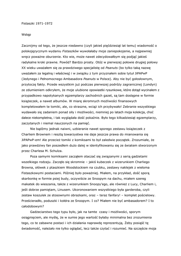 Fistaszki 1971-1972 Wstęp Zacznijmy od tego, że jeszcze niedawno (czyli jakieś pięćdziesiąt lat temu) wiadomość o polskojęzycznym wydaniu Fistaszków wywołałaby moje zaniepokojenie, a najpewniej wręcz poważne oburzenie. Kto wie, może nawet zdecydowałbym się podjąć jakieś radykalne kroki prawne. Powód? Bardzo prosty. Otóż w pierwszej połowie drugiej połowy XX wieku uważałem się za prawdziwego specjalistę od Peanuts (bo tylko taką nazwę uważałem za legalną i właściwą) i w związku z tym przyznałem sobie tytuł JiPAPwP (Jedynego i Pełnomocnego Ambasadora Peanuts w Polsce). Aby nie być gołosłownym, przytoczę fakty. Przede wszystkim już podczas pierwszej podróży zagranicznej (Londyn) ze zdumieniem odkryłem, że moje ulubione opowiastki rysunkowe, które dotąd wycinałem z przypadkowo napotykanych egzemplarzy zachodnich gazet, są tam dostępne w formie książeczek, a nawet albumów. W miarę skromnych możliwości finansowych kompletowałem te tomiki, ale, co straszne, wciąż ich przybywało! Zebranie wszystkiego wydawało się zadaniem ponad siły i możliwości, niemniej po latach moja kolekcja, choć dalece niekompletna, i tak wyglądała dość pokaźnie. Było tego kilkadziesiąt egzemplarzy, zaczytanych i niemal nauczonych na pamięć. Nie bądźmy jednak naiwni, uzbieranie nawet sporego zestawu książeczek z Charliem Brownem i resztą towarzystwa nie daje jeszcze prawa do mianowania się JiPAPwP-em! Ale przecież tomiki z komiksami to był zaledwie początek. Zrozumiałe, że jako prawdziwy fan poszedłem dużo dalej w identyfikowaniu się ze światem stworzonym przez Charlesa M. Schulza. Poza samymi komiksami zacząłem otaczać się związanymi z serią gadżetami wszelkiego rodzaju. Zaczęło się skromnie – jakiś kubeczek z wizerunkiem Charliego Browna, ołówek z ptaszkiem Woodstockiem na czubku, zestawy naklejek z wieloma Fistaszkowymi postaciami. Później było poważniej. Miałem, na przykład, dość sporą skarbonkę w formie psiej budy, oczywiście ze Snoopym na dachu, miałem szereg makatek do wieszania, także z wizerunkiem Snoopy’ego, ale również z Lucy, Charliem i, jeśli dobrze pamiętam, Linusem. Ukoronowaniem wszystkiego była garderoba, czyli zestaw koszulek ze stosownymi obrazkami, oraz – teraz fanfary! – komplet pościelowy. Prześcieradło, poduszki i kołdra ze Snoopym. I co? Miałem nie być ambasadorem? I to całodobowym? Gadżeciarstwo tego typu było, jak na tamte czasy i możliwości, sporym osiągnięciem, ale myślę, że w sumie jego wartość byłaby minimalna bez zrozumienia tego, co te zabawne postaci i ich działania naprawdę reprezentują. Żeby posiąść tę świadomość, należało nie tylko oglądać, lecz także czytać i rozumieć. Na szczęście moja znajomość angielskiego była wystarczająco dobra, więc mądrość i dowcip Fistaszkowych historyjek docierały do mnie bez większych problemów. I tu wchodzimy w zupełnie niezwykłą sferę pojmowania świata Peanuts. Bo warstwa jest tu niejedna. Dominuje żart i humorystyczne, często powtarzające się sytuacje, po prostu pozwalające się uśmiechnąć. Ale wraz z uśmiechem powinna przyjść myśl, refleksja. Choć bohaterami historyjek są dzieci i zwierzaki, to stale wyczuwalny jest otaczający je świat dorosłych. Mali bohaterowie tego niezwykłego cyklu reprezentują ogromną rozpiętość zarówno pod względem osobowości, jak i światopoglądu. Trapiące ich pytania oraz spostrzeżenia, których dokonują, każą czytelnikowi zastanowić się nad najprostszymi sprawami. Zrozumienie sytuacji i rozmów, jakich jesteśmy tu świadkami, często każe nam wypaść z kolein, którymi podążają nasze nierzadko zaspawane schematami myśli. Obok zadowolenia wynikającego z faktu pojawiania się kolejnych przetłumaczonych na polski tomów Fistaszków pojawić się może pewna wątpliwość. Chodzi mianowicie o to, czy ta, spóźniona o co najmniej pół wieku, obecność Charlesa M. Schulza na naszym rynku ma jakiś sens poza historycznym. Moim zdaniem tak, i to o wiele większy, niż gdyby komiks pojawiał się w Polsce, nazwijmy to ogólnie, poprzedniej. Teraz, gdy zawitał do nas kapitalizm, wzmogło się tempo życia, zaostrzyła konkurencja, a świat stanął otworem, polskie realia dużo bardziej przypominają te, w których funkcjonował Charlie Brown i całe jego towarzystwo. Codzienny pęd powoduje, że najbardziej odpowiada nam poznawanie świata poprzez skakanie po kanałach kablówek bądź internetowe klikanie w linki. Pamiętajmy jednak o Fistaszkach. Ich przygody, opowiadane w kilku zaledwie obrazkach, są krótkie, mądre i dowcipne. Nie zniechęcają rozbudowanymi opisami przyrody (jak wiele lektur szkolnych), nie epatują mozolnie analizowanymi życiowymi dylematami (jak kino moralnego niepokoju) i nie straszą prymitywnym humorem (jak większość nastawionych na rechot kabaretów). Uczą mądrego patrzenia na rzeczywistość oraz dystansu do zadęcia i pozerstwa różnego rodzaju mędrców czy proroków, pchających się z butami w nasze życie. Jako emerytowany i pozostający w stanie spoczynku JiPAPwP informuję niniejszym wszystkich zainteresowanych, że aprobuję i popieram wszelkie działania mające na celu prezentację oraz promocję Fistaszkowych idei na terenie całego kraju, a także wśród obywateli polskich przebywających poza jego granicami. Wojciech Mann