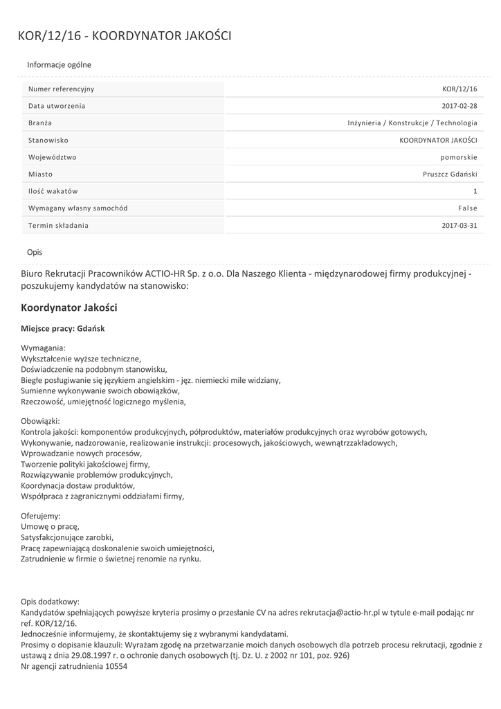 KOR/12/16 ‐ KOORDYNATOR JAKOŚCI Informacje ogólne Numer referencyjny KOR/12/16 Data utworzenia 2017‐02‐28 Branża Stanowisko Inżynieria / Konstrukcje / Technologia KOORDYNATOR JAKOŚCI Województwo Miasto pomorskie Pruszcz Gdański Ilość wakatów Wymagany własny samochód Termin składania 1 False 2017‐03‐31 Opis Biuro Rekrutacji Pracowników ACTIO‐HR Sp. z o.o. Dla Naszego Klienta ‐ międzynarodowej firmy produkcyjnej ‐ poszukujemy kandydatów na stanowisko: Koordynator Jakości Miejsce pracy: Gdańsk Wymagania: Wykształcenie wyższe techniczne, Doświadczenie na podobnym stanowisku, Biegłe posługiwanie się językiem angielskim ‐ jęz. niemiecki mile widziany, Sumienne wykonywanie swoich obowiązków, Rzeczowość, umiejętność logicznego myślenia, Obowiązki: Kontrola jakości: komponentów produkcyjnych, półproduktów, materiałów produkcyjnych oraz wyrobów gotowych, Wykonywanie, nadzorowanie, realizowanie instrukcji: procesowych, jakościowych, wewnątrzzakładowych, Wprowadzanie nowych procesów, Tworzenie polityki jakościowej firmy, Rozwiązywanie problemów produkcyjnych, Koordynacja dostaw produktów, Współpraca z zagranicznymi oddziałami firmy, Oferujemy: Umowę o pracę, Satysfakcjonujące zarobki, Pracę zapewniającą doskonalenie swoich umiejętności, Zatrudnienie w firmie o świetnej renomie na rynku. Opis dodatkowy: Kandydatów spełniających powyższe kryteria prosimy o przesłanie CV na adres rekrutacja@actio‐hr.pl w tytule e‐mail podając nr ref. KOR/12/16. Jednocześnie informujemy, że skontaktujemy się z wybranymi kandydatami. Prosimy o dopisanie klauzuli: Wyrażam zgodę na przetwarzanie moich danych osobowych dla potrzeb procesu rekrutacji, zgodnie z ustawą z dnia 29.08.1997 r. o ochronie danych osobowych (tj. Dz. U. z 2002 nr 101, poz. 926) Nr agencji zatrudnienia 10554