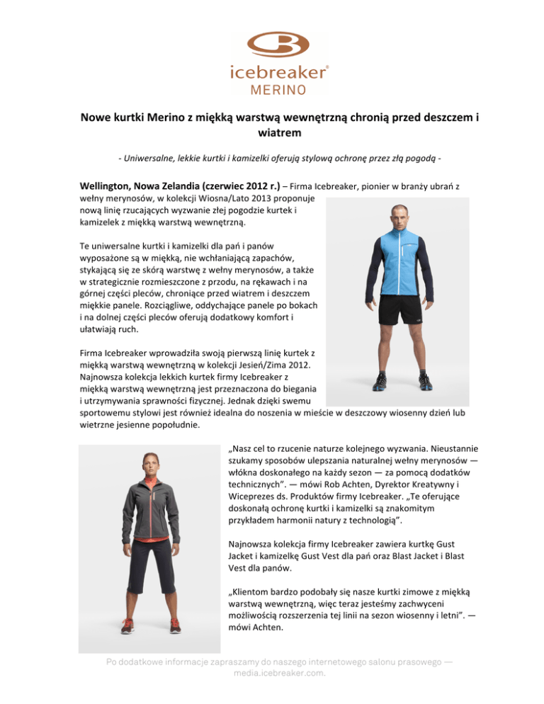 Nowe kurtki Merino z miękką warstwą wewnętrzną chronią przed deszczem i wiatrem -‐ Uniwersalne, lekkie kurtki i kamizelki oferują stylową ochronę przez złą pogodą -‐ Wellington, Nowa Zelandia (czerwiec 2012 r.) – Firma Icebreaker, pionier w branży ubrań z wełny merynosów, w kolekcji Wiosna/Lato 2013 proponuje nową linię rzucających wyzwanie złej pogodzie kurtek i kamizelek z miękką warstwą wewnętrzną. Te uniwersalne kurtki i kamizelki dla pań i panów wyposażone są w miękką, nie wchłaniającą zapachów, stykającą się ze skórą warstwę z wełny merynosów, a także w strategicznie rozmieszczone z przodu, na rękawach i na górnej części pleców, chroniące przed wiatrem i deszczem miękkie panele. Rozciągliwe, oddychające panele po bokach i na dolnej części pleców oferują dodatkowy komfort i ułatwiają ruch. Firma Icebreaker wprowadziła swoją pierwszą linię kurtek z miękką warstwą wewnętrzną w kolekcji Jesień/Zima 2012. Najnowsza kolekcja lekkich kurtek firmy Icebreaker z miękką warstwą wewnętrzną jest przeznaczona do biegania i utrzymywania sprawności fizycznej. Jednak dzięki swemu sportowemu stylowi jest również idealna do noszenia w mieście w deszczowy wiosenny dzień lub wietrzne jesienne popołudnie. „Nasz cel to rzucenie naturze kolejnego wyzwania. Nieustannie szukamy sposobów ulepszania naturalnej wełny merynosów — włókna doskonałego na każdy sezon — za pomocą dodatków technicznych”. — mówi Rob Achten, Dyrektor Kreatywny i Wiceprezes ds. Produktów firmy Icebreaker. „Te oferujące doskonałą ochronę kurtki i kamizelki są znakomitym przykładem harmonii natury z technologią”. Najnowsza kolekcja firmy Icebreaker zawiera kurtkę Gust Jacket i kamizelkę Gust Vest dla pań oraz Blast Jacket i Blast Vest dla panów. „Klientom bardzo podobały się nasze kurtki zimowe z miękką warstwą wewnętrzną, więc teraz jesteśmy zachwyceni możliwością rozszerzenia tej linii na sezon wiosenny i letni”. — mówi Achten. Po dodatkowe informacje zapraszamy do naszego internetowego salonu prasowego — media.icebreaker.com. Uwaga redakcyjna: Ilustracje produktów z kolekcji Wiosna/Lato 2013 są dostępne do wykorzystania tutaj. Więcej informacji na temat produktów na ten sezon można znaleźć w kompletnych informacjach prasowych, które są dostępne tutaj. Chętnie udzielimy wszelkiej dodatkowej pomocy. Jeśli potrzebują Państwo dodatkowych informacji, ilustracji lub próbek odzieży, prosimy zwrócić się do osoby kontaktowej odpowiedzialnej za PR firmy Icebreaker w danym kraju. Informacje o firmie Icebreaker Założona w roku 1994 firma Icebreaker jako pierwszy na świecie producent odzieży opracowała warstwowy system ubrań z włókien wełny merynosów przeznaczony do noszenia na dworze. W roku 1997, również jako pierwszy na świecie producent odzieży zewnętrznej, firma Icebreaker rozpoczęła pozyskiwanie wełny merynosów bezpośrednio od hodowców. Oferty ubrań z wełny merynosów firmy Icebreaker do noszenia na dworze, odzieży techniczno-‐sportowej i codziennej obejmują bieliznę, warstwę pośrednią ubrań, warstwę wierzchnią, skarpety i akcesoria dla mężczyzn, kobiet i dzieci. Siedziba firmy Icebreaker mieści się w Wellington (Nowa Zelandia), a produkty tej marki sprzedawane są w ponad 3000 sklepów w 43 krajach. Dalsze informacje na temat firmy Icebreaker znaleźć można pod adresem icebreaker.com, a na temat założyciela firmy i jej dyrektora naczelnego, Jeremy'ego Moona, pod adresem jeremymoon.me. ### Po dodatkowe informacje zapraszamy do naszego internetowego salonu prasowego — media.icebreaker.com.