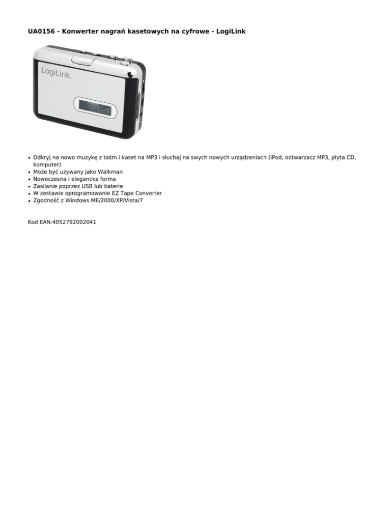 UA0156 - Konwerter nagrań kasetowych na cyfrowe - LogiLink ● ● ● ● ● ● Odkryj na nowo muzykę z taśm i kaset na MP3 i słuchaj na swych nowych urządzeniach (iPod, odtwarzacz MP3, płyta CD, komputer) Może być uzywany jako Walkman Nowoczesna i elegancka forma Zasilanie poprzez USB lub baterie W zestawie oprogramowanie EZ Tape Converter Zgodność z Windows ME/2000/XP/Vista/7 Kod EAN:4052792002041