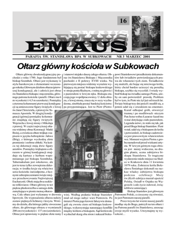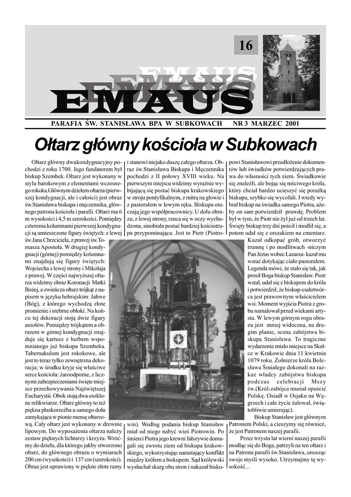 1 16 PARAFIA ŚW. STANISŁAWA BPA W SUBKOWACH NR 3 MARZEC 2001 Ołtarz główny kościoła w Subkowach Ołtarz główny dwukondygnacyjny pochodzi z roku 1700. Jego fundatorem był biskup Szembek. Ołtarz jest wykonany w stylu barokowym z elementami wczesnego rokoka.Głównym dziełem ołtarza (pierwszej kondygnacji, ale i całości) jest obraz św.Stanisława biskupa i męczennika, głównego patrona kościoła i parafii. Ołtarz ma 6 m wysokości i 4,5 m szerokości. Pomiędzy czterema kolumnami pierwszej kondygnacji są umieszczone figury świętych: z lewej św.Jana Chrzciciela, z prawej św.Tomasza Apostoła. W drugiej kondygnacji (górnej) pomiędzy kolumnami znajdują się figury świętych: Wojciecha z lewej strony i Mikołaja z prawej. W części najwyższej ołtarza widzimy obraz Koronacji Matki Bożej, a zwieńcza ołtarz trójkąt z napisem w języku hebrajskim: Jahwe (Bóg), z którego wychodzą złote promienie i srebrne obłoki. Na końcu tej dekoracji stoją dwie figury aniołów. Pomiędzy trójkątem a obrazem w górnej kondygnacji znajduje się kartusz z herbem wspomnianego już biskupa Szembeka. Tabernakulum jest rokokowe, ale jest to teraz tylko zewnętrzna dekoracja; w środku kryje się właściwe serce kościoła: żaroodporne, z licznymi zabezpieczeniami święte miejsce przechowywania Najświętszej Eucharystii. Obok stoją dwa oszklone relikwiarze. Ołtarz główny to też piękna płaskorzeźba u samego dołu zamykająca w pionie mensę ołtarzową. Cały ołtarz jest wykonany w drewnie lipowym. Do wyposażenia ołtarza należy zestaw pięknych lichtarzy i krzyża. Wróćmy do dzieła, dla którego jakby stworzono ołtarz, do głównego obrazu o wymiarach 200 cm (wysokości) i 137 cm (szerokości). Obraz jest oprawiony w piękne złote ramy i stanowi niejako duszę całego ołtarza. Obraz św.Stanisława Biskupa i Męczennika pochodzi z II połowy XVIII wieku. Na pierwszym miejscu widzimy wyraźnie wybijającą się postać biskupa krakowskiego w stroju pontyfikalnym, z mitrą na głowie i z pastorałem w lewym ręku. Biskupa otaczają jego współpracownicy. U dołu obrazu, z lewej strony, rzuca się w oczy wychudzona, sinobiała postać bardziej kościotrupa przypominająca. Jest to Piotr (Piotro- win). Według podania biskup Stanisław miał od niego nabyć wieś Piotrowin. Po śmierci Piotra jego krewni fałszywie domagali się zwrotu ziem od biskupa krakowskiego, wykorzystując narastający konflikt między królem a biskupem. Sąd królewski wysłuchał skarg obu stron i nakazał bisku- powi Stanisławowi przedłożenie dokumentów lub świadków potwierdzających prawa do własności tych ziem. Świadkowie się znaleźli, ale bojąc się mściwego króla, który chciał bardzo ucieszyć się porażką biskupa, szybko się wycofali. I wtedy wybrał biskup na świadka samego Piotra, ażeby on sam potwierdził prawdę. Problem był w tym, że Piotr nie żył już od trzech lat. Święty biskup trzy dni pościł i modlił się, a potem udał się z orszakiem na cmentarz. Kazał odkopać grób, otworzyć trumnę i po modlitwach -niczym Pan Jezus wobec Łazarza- kazał mu wstać dotykając ciało pastorałem. Legenda mówi, że stało się tak, jak prosił Boga biskup Stanisław. Piotr wstał, udał się z biskupem do króla i potwierdził, że biskup-cudotwórca jest prawowitym właścicielem wsi. Moment wyjścia Piotra z grobu namalował przed wiekami artysta. W lewym górnym rogu obrazu jest mniej widoczna, na drugim planie, scena zabójstwa biskupa Stanisława. To tragiczne wydarzenie miało miejsce na Skałce w Krakowie dnia 11 kwietnia 1079 roku. Żołnierze króla Bolesława Śmiałego dokonali na razkaz władcy zabójstwa biskupa podczas celebracji Mszy św.(Król-zabójca musiał opuścić Polskę. Osiadł w Osjaku na Węgrzech i całe życie żałował, świątobliwie umierając). Biskup Stanisław jest głównym Patronem Polski, a cieszymy się również, że jest Patronem naszej parafii. Przez trzysta lat wierni naszej parafii modląc się do Boga, patrzyli na ten ołtarz i na Patrona parafii św.Stanisława, unosząc swoje myśli wysoko. Utrzymajmy tę wysokość... 2 Z rozmów prowadzonych ze znajomymi wnioskuję, że na ogół mało orientujemy się w kompetencjach i strukturze powiatu. Proszę chociaż skrótowo przybliżyć czytelnikom ten temat. To prawda, że społeczeństwo słabo orientuje się w kompetencjach i strukturze powiatu. Potwierdzają to nie tylko moje doświadczenia wyniesione najczęściej z rozmów z różnymi ludźmi, ale dowodzą tego też profesjonalne badania przeprowadzone przez wyspecjalizowane jednostki np. CBOS. Oznacza to nie tylko brak dostatecznego zainteresowania tą tematyką w społecznościach lokalnych, ale przede wszystkim dowodzi, jak wiele jeszcze do zrobienia mają władze powiatowe jak i władze centralne oraz media w zakresie skutecznego informowania o celach i skutkach reformy samorządowej. Na wstępie swojej wypowiedzi pragnę podkreślić, że powiat nie jest jednostką nadrzędną wobec gminy, nie kontroluje jej poczynań, a raczej je uzupełnia. Zadaniem powiatu jest zarządzanie tymi sprawami, które przekraczają finansowe i organizacyjne możliwości gmin. Powiatem, tak jak gminą, kierują jego mieszkańcy poprzez swoich przedstawicieli wyłonionych w wyborach, czyli radnych. Swoje zadania powiat wykonuje za pomocą Starostwa Powiatowego (na czele którego stoi Starosta) i powiatowych jednostek organizacyjnych. Jako najważniejsze kompetencje powiatu można wymienić sprawowanie nadzoru właścicielskiego w dziedzinie ochrony zdrowia-jest właścicielem SP ZOZ (Samodzielnego Publicznego Zakładu Opieki Zdrowotnej), a także szkolnictwa ponadpodstawowego i specjalnego. Powiat jest też właścicielem wielu dróg, do których często mamy uwagi. W ramach zespolonej administracji powiatowej działają: Komenda Powiatowa Państwowej Straży Pożarnej, Komenda Powiatowa Policji, Powiatowy Inspektora
