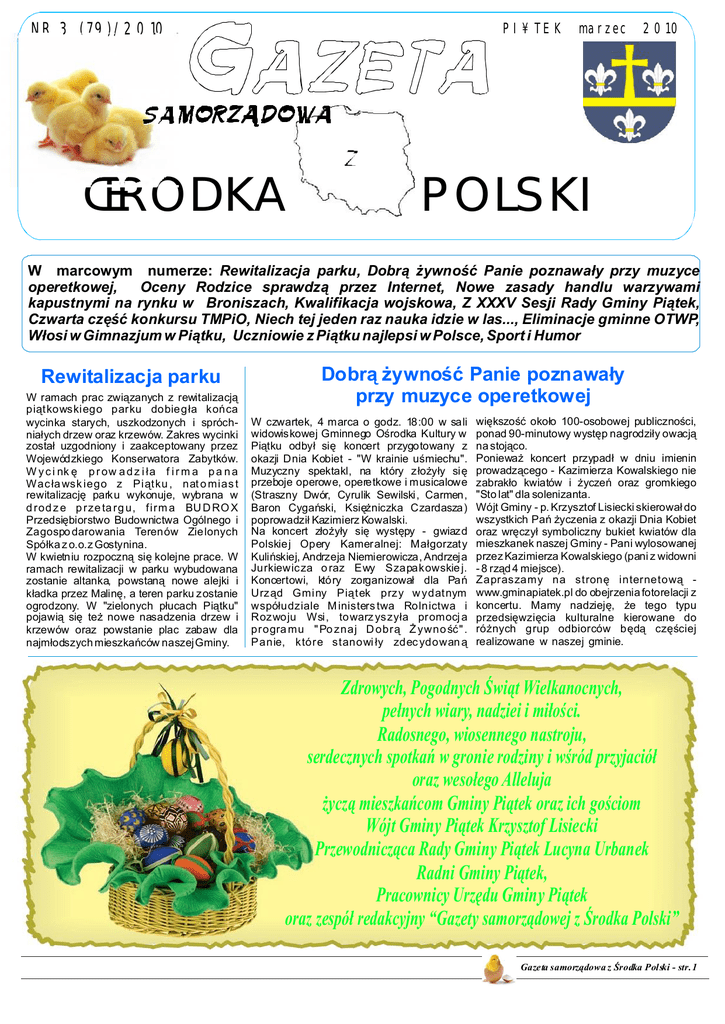 NR 3 (79)/2010 PI¥TEK ŒRODKA z marzec 2010 POLSKI W marcowym numerze: Rewitalizacja parku, Dobr ywno Panie poznawa y przy muzyce operetkowej, Oceny Rodzice sprawdz przez Internet, Nowe zasady handlu warzywami kapustnymi na rynku w Broniszach, Kwalifikacja wojskowa, Z XXXV Sesji Rady Gminy Pi tek, Czwarta cz konkursu TMPiO, Niech tej jeden raz nauka idzie w las..., Eliminacje gminne OTWP, osi w Gimnazjum w Pi tku, Uczniowie z Pi tku najlepsi w Polsce, Sport i Humor Rewitalizacja parku W ramach prac zwi zanych z rewitalizacj pi tkowskiego parku dobieg a ko ca wycinka starych, uszkodzonych i spróchnia ych drzew oraz krzewów. Zakres wycinki zosta uzgodniony i zaakceptowany przez Wojewódzkiego Konserwatora Zabytków. W y c i nk p r ow a d z i a f i r m a p a n a Wac a wsk iego z Pi tku , nat o mias t rewitalizacj parku wykonuje, wybrana w d rod z e p rze ta rg u, firm a BU D RO X Przedsi biorstwo Budownictwa Ogólnego i Zagospo darowania Terenów Zielonych Spó ka z o.o.z Gostynina. W kwietniu rozpoczn si kolejne prace. W ramach rewitalizacji w parku wybudowana zostanie altanka, powstan nowe alejki i adka przez Malin , a teren parku zostanie ogrodzony. W "zielonych p ucach Pi tku" pojawi si te nowe nasadzenia drzew i krzewów oraz powstanie plac zabaw dla najm odszych mieszka ców naszejGminy. Dobr ywno Panie poznawa y przy muzyce operetkowej W czwartek, 4 marca o godz. 18:00 w sali widowiskowej Gminnego O rodka Kultury w Pi tku odby si koncert przygotowany z okazji Dnia Kobiet - "W krainie u miechu". Muzyczny spektakl, na który z y si przeboje operowe, operetkowe i musicalowe (Straszny Dwór, Cyrulik Sewilski, Carmen, Baron Cyga ski, Ksi niczka Czardasza) poprowadzi Kazimierz Kowalski. Na koncert z y si wyst py - gwiazd Polskiej Opery Kameralnej: Ma gorzaty Kuli skiej, Andrzeja Niemierowicza, Andrzeja Jurkiewicza o raz Ewy Szapakowskie j. Koncertowi, który zorganizowa dla Pa Urz d Gminy Pi tek przy w ydatnym wspó udziale M inisters twa Rolnictwa i Rozwoju Wsi, towarz yszy a promocj a progra mu " Po znaj D obr ywno " . Panie, które stanowi y zdec ydowan wi kszo oko o 100-osobowej publiczno ci, ponad 90-minutowy wyst p nagrodzi y owacj na stoj co. Poniewa koncert przypad w dniu imienin prowadz cego - Kazimierza Kowalskiego nie zabrak o kwiatów i ycze oraz gromkiego "Sto lat" dla solenizanta. Wójt Gminy - p. Krzysztof Lisiecki skierowa do wszystkich Pa yczenia z okazji Dnia Kobiet oraz wr czy symboliczny bukiet kwiatów dla mieszkanek naszej Gminy - Pani wylosowanej przez Kazimierza Kowalskiego (pani z widowni - 8 rz d 4 miejsce). Zapraszamy na stron internetow www.gminapiatek.pl do obejrzenia fotorelacji z koncertu. Mamy nadziej e tego typu przedsi wzi cia kulturalne kierowane do ró nych grup odbiorców b cz ciej realizowane w naszej gminie. Zdrowych, Pogodnych wi t Wielkanocnych, pe nych wiary, nadziei i mi ci. Radosnego, wiosennego nastroju, serdecznych spotka w gronie rodziny i w ród przyjació oraz weso ego Alleluja ycz mieszka com Gminy Pi tek oraz ich go ciom Wójt Gminy Pi tek Krzysztof Lisiecki Przewodnicz ca Rady Gminy Pi tek Lucyna Urbanek Radni Gminy Pi tek, Pracownicy Urz du Gminy Pi tek oraz zespó redakcyjny “Gazety samorz dowej z rodka Polski” Gazeta samorz dowa z rodka Polski - str. 1