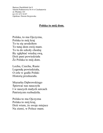 Bartosz Duchliński lat 8 Szkoła Podstawowa Nr 4 w Ciechanowie ul. Płońska 143 tel./23/ 672 54 87 Opiekun: Dorota Stryjewska Polska to mój dom. Polska, to ma Ojczyzna, Polska to mój kraj To tu się urodziłem To tutaj dom swój mam. To tu do szkoły chodzę By zgłębiać wiedzę swą, Dziś pani powiedziała Że Polska to mój dom. Lechu, Czechu, Rusie Legendę powiedziała, O orle w godle Polski Historię przekazała. Mazurka Dąbrowskiego Śpiewać nas nauczyła I w naszych małych sercach Patriotyzm rozbudziła. Polska to ma Ojczyzna Polska to mój kraj, Dziś wiem, że swoje miejsce Na ziemi, w Polsce mam.