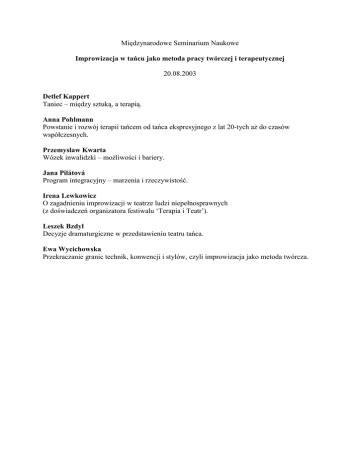 Międzynarodowe Seminarium Naukowe Improwizacja w tańcu jako metoda pracy twórczej i terapeutycznej 20.08.2003 Detlef Kappert Taniec – między sztuką, a terapią. Anna Pohlmann Powstanie i rozwój terapii tańcem od tańca ekspresyjnego z lat 20-tych aŜ do czasów współczesnych. Przemysław Kwarta Wózek inwalidzki – moŜliwości i bariery. Jana Pilátová Program integracyjny – marzenia i rzeczywistość. Irena Lewkowicz O zagadnieniu improwizacji w teatrze ludzi niepełnosprawnych (z doświadczeń organizatora festiwalu ‘Terapia i Teatr’). Leszek Bzdyl Decyzje dramaturgiczne w przedstawieniu teatru tańca. Ewa Wycichowska Przekraczanie granic technik, konwencji i stylów, czyli improwizacja jako metoda twórcza.