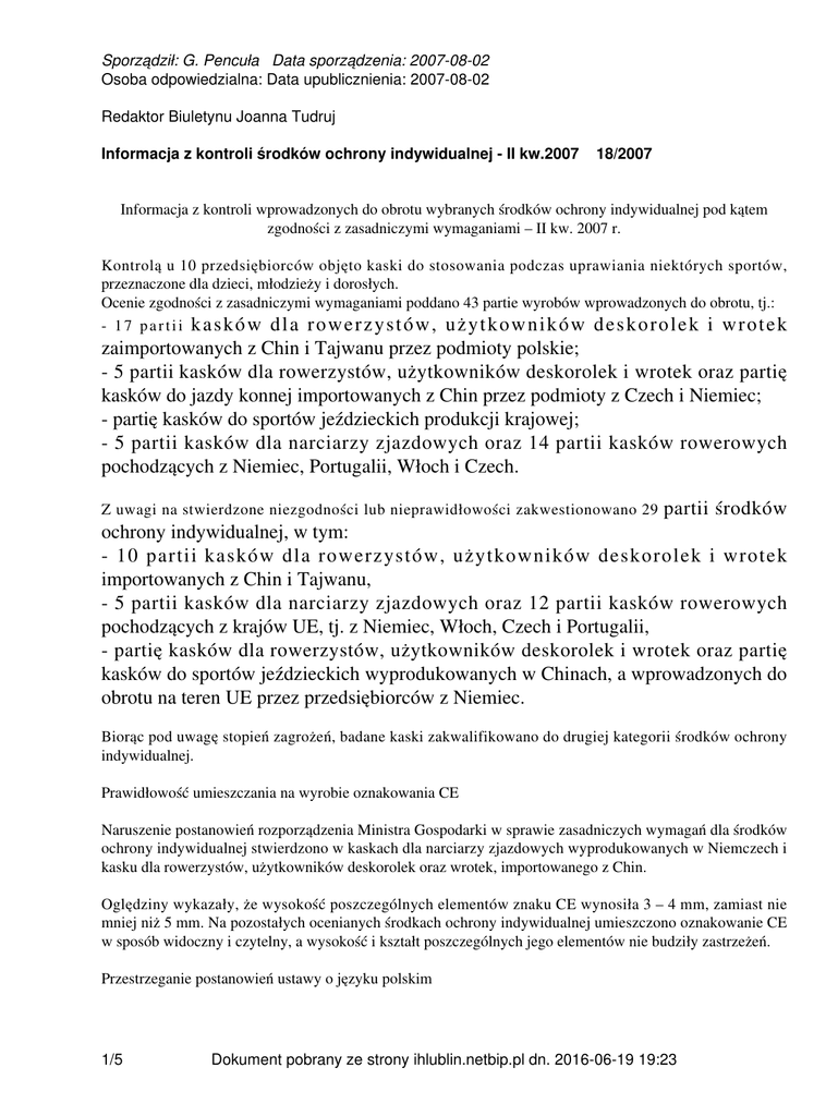 Sporządził: G. Pencuła Data sporządzenia: 2007-08-02 Osoba odpowiedzialna: Data upublicznienia: 2007-08-02 Redaktor Biuletynu Joanna Tudruj Informacja z kontroli środków ochrony indywidualnej - II kw.2007 18/2007 Informacja z kontroli wprowadzonych do obrotu wybranych środków ochrony indywidualnej pod kątem zgodności z zasadniczymi wymaganiami – II kw. 2007 r. Kontrolą u 10 przedsiębiorców objęto kaski do stosowania podczas uprawiania niektórych sportów, przeznaczone dla dzieci, młodzieży i dorosłych. Ocenie zgodności z zasadniczymi wymaganiami poddano 43 partie wyrobów wprowadzonych do obrotu, tj.: - 17 partii kasków dla rowerzystów, użytkowników deskorolek i wrotek zaimportowanych z Chin i Tajwanu przez podmioty polskie; - 5 partii kasków dla rowerzystów, użytkowników deskorolek i wrotek oraz partię kasków do jazdy konnej importowanych z Chin przez podmioty z Czech i Niemiec; - partię kasków do sportów jeździeckich produkcji krajowej; - 5 partii kasków dla narciarzy zjazdowych oraz 14 partii kasków rowerowych pochodzących z Niemiec, Portugalii, Włoch i Czech. Z uwagi na stwierdzone niezgodności lub nieprawidłowości zakwestionowano 29 partii środków ochrony indywidualnej, w tym: - 10 partii kasków dla rowerzystów, użytkowników deskorolek i wrotek importowanych z Chin i Tajwanu, - 5 partii kasków dla narciarzy zjazdowych oraz 12 partii kasków rowerowych pochodzących z krajów UE, tj. z Niemiec, Włoch, Czech i Portugalii, - partię kasków dla rowerzystów, użytkowników deskorolek i wrotek oraz partię kasków do sportów jeździeckich wyprodukowanych w Chinach, a wprowadzonych do obrotu na teren UE przez przedsiębiorców z Niemiec. Biorąc pod uwagę stopień zagrożeń, badane kaski zakwalifikowano do drugiej kategorii środków ochrony indywidualnej. Prawidłowość umieszczania na wyrobie oznakowania CE Naruszenie postanowień rozporządzenia Ministra Gospodarki w sprawie zasadniczych wymagań dla środków ochrony indywidualnej stwierdzono w kaskach dla narciarzy zjazdowych wyprodukowanych w Niemczech i kasku dla rowerzystów, użytkowników deskorolek oraz wrotek, importowanego z Chin. Oględziny wykazały, że wysokość poszczególnych elementów znaku CE wynosiła 3 – 4 mm, zamiast nie mniej niż 5 mm. Na pozostałych ocenianych środkach ochrony indywidualnej umieszczono oznakowanie CE w sposób widoczny i czytelny, a wysokość i kształt poszczególnych jego elementów nie budziły zastrzeżeń. Przestrzeganie postanowień ustawy o języku polskim 1/5 Dokument pobrany ze strony ihlublin.netbip.pl dn. 2016-06-19 19:23 Naruszenie przepisów ustawy o języku polskim stwierdzono podczas oględzin kasków dla rowerzystów, użytkowników deskorolek oraz wrotek z Chin, Czech, Niemiec i Portugalii. Oznakowanie trwałe (etykiety samoprzylepne zawierające informacje o wyrobie i ostrzeżenia) umieszczone na kaskach oraz dołączona do niektórych modeli kasków instrukcja użytkowania, sporządzone były w języku obcym, bez polskiej wersji językowej. Instrukcje użytkowania sporządzone wyłącznie w wersji obcojęzycznej stwierdzono także podczas oględzin kasków do sportów jeździeckich z Chin, kasków dla rowerzystów, użytkowników deskorolek oraz wrotek importowanych z Chin i Niemiec. Dystrybutorzy, podjęli natychmiastowe działania naprawcze zmierzające do ich usunięcia - przesłali wzory ulotek i instrukcji sporządzonych w języku polskim, które jak oświadczyli, dostarczyli także do jednostek kontrolowanych i innych odbiorców. Ponadto dołączone do kasków z Portugalii oraz kasku importowanego z Chin, instrukcje użytkowania sporządzone były niepoprawnie językowo (w słowach brak było poszczególnych liter) - przedsiębiorcy przesłali instrukcje sporządzone poprawnie i zrozumiale w języku polskim. Sprawdzenie zgodności z zasadniczymi wymaganiami a) instrukcje użytkowania W toku kontroli sprawdzono, czy instrukcje użytkowania sporządzone zostały zgodnie z postanowieniami rozporządzenia MG w sprawie zasadniczych wymagań dla środków ochrony indywidualnej. Stwierdzono, że 21 partii kasków dla rowerzystów, użytkowników deskorolek i wrotek oraz kasków do sportów jeździeckich nie spełnia wymagań zasadniczych określonych w rozporządzeniu MG w sprawie zasadniczych wymagań dla środków ochrony indywidualnej z uwagi na: - brak instrukcji użytkowania (1 partia), - brak niektórych elementów w instrukcji użytkowania (9 partii), - sporządzenie instrukcji użytkowania niezrozumiale w języku polskim lub sporządzenie jej wyłącznie w wersji obcojęzycznej (11 partii). Importerzy i dystrybutorzy kasków przesłali do kontrolowanych jednostek oraz odbiorców prawidłowo sporządzone instrukcje użytkowania. b) badania laboratoryjne Ponieważ podczas oględzin nie stwierdzono widocznych wad technicznych lub uszkodzeń kasków, nie pobrano prób do badań laboratoryjnych. Poza tym do przeprowadzenia pełnych badań należy przekazać 4 kaski tego samego modelu i rozmiaru, a kontrolowane placówki oferowały do sprzedaży różnorodne modele kasków w pojedynczych egzemplarzach. Oznakowanie środków ochrony indywidualnej Oznakowanie środków ochrony indywidualnej sprawdzono w oparciu o zadeklarowane przez producentów na wyrobach lub opakowaniach normy. Oględziny wykazały, że w oznakowaniu środków ochrony indywidualnej: - z Czech ( 2/5 Dokument pobrany ze strony ihlublin.netbip.pl dn. 2016-06-19 19:23 kaski dla rowerzystów, użytkowników deskorolek oraz wrotek) - brak było informacji o przeznaczeniu wyrobu „kask dla rowerzystów, użytkowników deskorolek oraz wrotek” i ostrzeżeń, np.: kask nie powinien być używany przez dzieci podczas wspinaczki lub innych działań, przy których istnieje ryzyko powieszenia, gdy dziecko zatrzaśnie się w kasku, - z Chin wewnątrz kasku rowerowego brak było danych o wyrobie, tj. masy kasku, daty produkcji (kwartał i rok) oraz nazwy lub 
