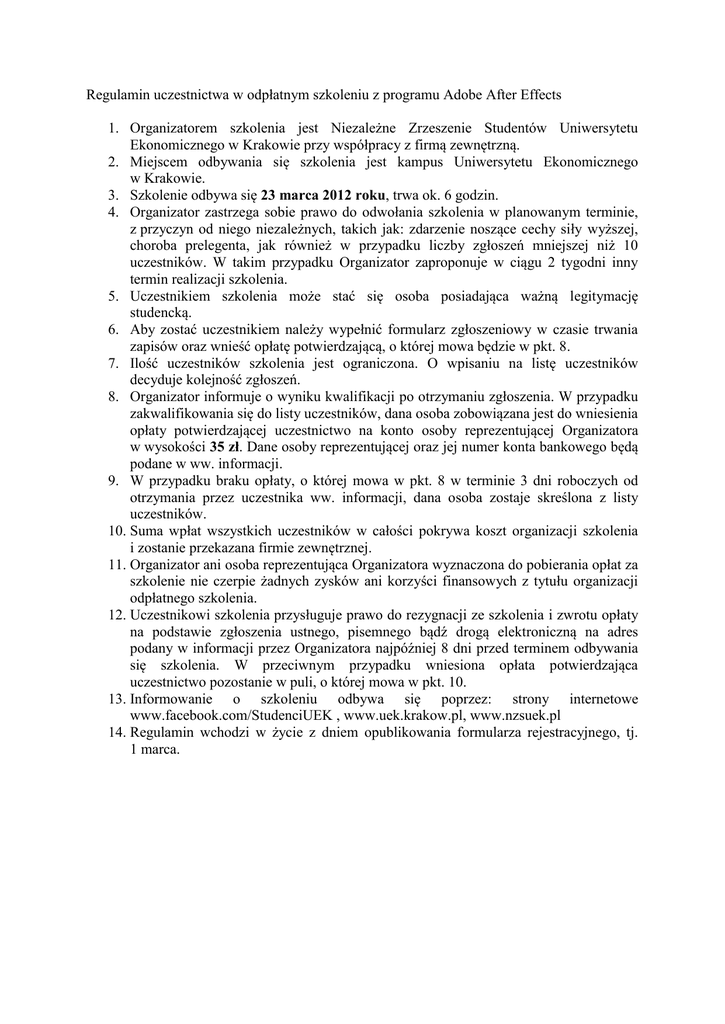 Regulamin uczestnictwa w odpłatnym szkoleniu z programu Adobe After Effects 1. Organizatorem szkolenia jest Niezależne Zrzeszenie Studentów Uniwersytetu Ekonomicznego w Krakowie przy współpracy z firmą zewnętrzną. 2. Miejscem odbywania się szkolenia jest kampus Uniwersytetu Ekonomicznego w Krakowie. 3. Szkolenie odbywa się 23 marca 2012 roku, trwa ok. 6 godzin. 4. Organizator zastrzega sobie prawo do odwołania szkolenia w planowanym terminie, z przyczyn od niego niezależnych, takich jak: zdarzenie noszące cechy siły wyższej, choroba prelegenta, jak również w przypadku liczby zgłoszeń mniejszej niż 10 uczestników. W takim przypadku Organizator zaproponuje w ciągu 2 tygodni inny termin realizacji szkolenia. 5. Uczestnikiem szkolenia może stać się osoba posiadająca ważną legitymację studencką. 6. Aby zostać uczestnikiem należy wypełnić formularz zgłoszeniowy w czasie trwania zapisów oraz wnieść opłatę potwierdzającą, o której mowa będzie w pkt. 8. 7. Ilość uczestników szkolenia jest ograniczona. O wpisaniu na listę uczestników decyduje kolejność zgłoszeń. 8. Organizator informuje o wyniku kwalifikacji po otrzymaniu zgłoszenia. W przypadku zakwalifikowania się do listy uczestników, dana osoba zobowiązana jest do wniesienia opłaty potwierdzającej uczestnictwo na konto osoby reprezentującej Organizatora w wysokości 35 zł. Dane osoby reprezentującej oraz jej numer konta bankowego będą podane w ww. informacji. 9. W przypadku braku opłaty, o której mowa w pkt. 8 w terminie 3 dni roboczych od otrzymania przez uczestnika ww. informacji, dana osoba zostaje skreślona z listy uczestników. 10. Suma wpłat wszystkich uczestników w całości pokrywa koszt organizacji szkolenia i zostanie przekazana firmie zewnętrznej. 11. Organizator ani osoba reprezentująca Organizatora wyznaczona do pobierania opłat za szkolenie nie czerpie żadnych zysków ani korzyści finansowych z tytułu organizacji odpłatnego szkolenia. 12. Uczestnikowi szkolenia przysługuje prawo do rezygnacji ze szkolenia i zwrotu opłaty na podstawie zgłoszenia ustnego, pisemnego bądź drogą elektroniczną na adres podany w informacji przez Organizatora najpóźniej 8 dni przed terminem odbywania się szkolenia. W przeciwnym przypadku wniesiona opłata potwierdzająca uczestnictwo pozostanie w puli, o której mowa w pkt. 10. 13. Informowanie o szkoleniu odbywa się poprzez: strony internetowe www.facebook.com/StudenciUEK , www.uek.krakow.pl, www.nzsuek.pl 14. Regulamin wchodzi w życie z dniem opublikowania formularza rejestracyjnego, tj. 1 marca.