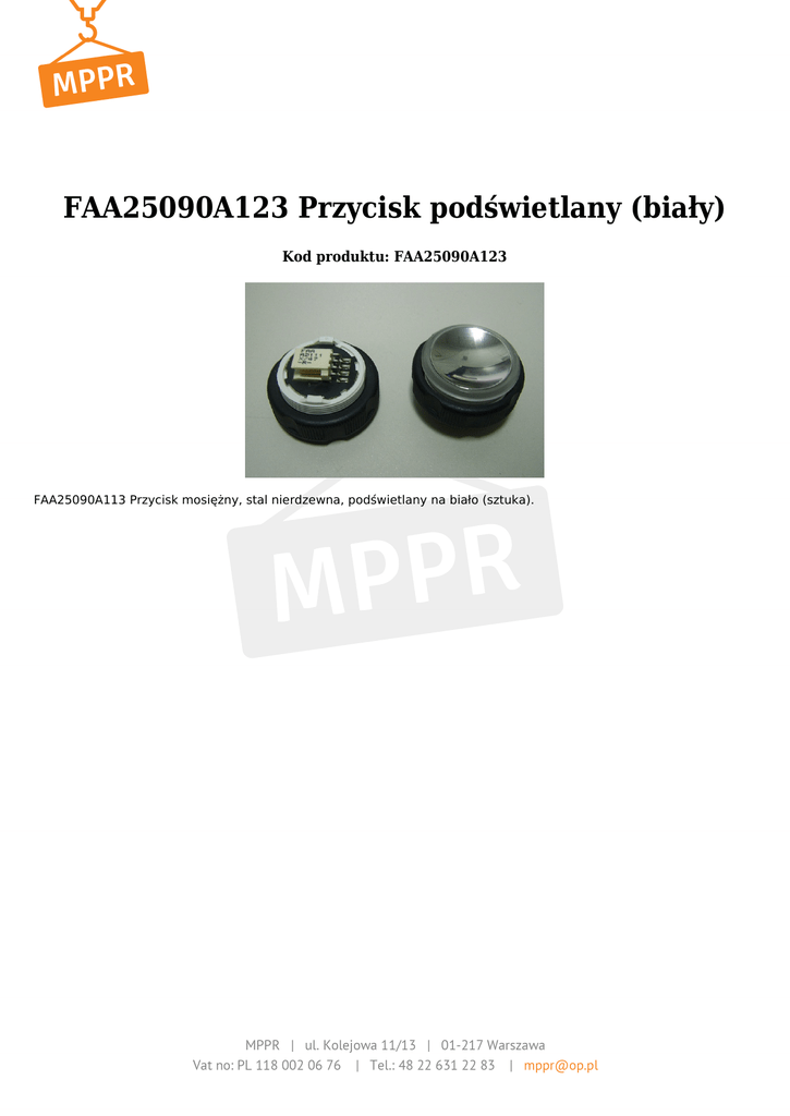 FAA25090A123 Przycisk podświetlany (biały) Kod produktu: FAA25090A123 FAA25090A113 Przycisk mosiężny, stal nierdzewna, podświetlany na biało (sztuka).