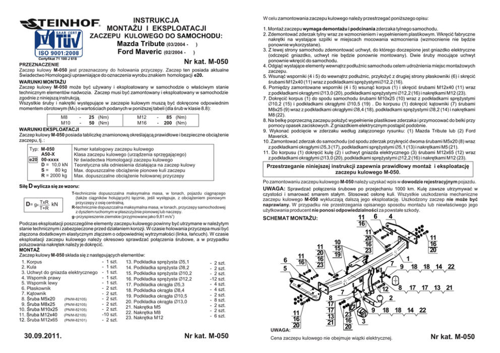 INSTRUKCJA MONTA¯U I EKSPLOATACJI ZACZEPU KULOWEGO DO SAMOCHODU: Mazda Tribute (03/2004 - ®) Ford Maveric (02/2004 - ®) Certyfikat 71 100 J 618 Nr kat. M-050 PRZEZNACZENIE Zaczep kulowy M-050 jest przeznaczony do holowania przyczepy. Zaczep ten posiada aktualne Œwiadectwo Homologacji uprawniaj¹ce do oznaczenia wyrobu znakiem homologacji e20. WARUNKI MONTA¯U Zaczep kulowy M-050 mo¿e byæ u¿ywany i eksploatowany w samochodzie o w³aœciwym stanie technicznym elementów nadwozia. Zaczep musi byæ zamontowany i eksploatowany w samochodzie zgodnie z niniejsz¹ instrukcj¹. Wszystkie œruby i nakrêtki wystêpuj¹ce w zaczepie kulowym musz¹ byæ dokrêcone odpowiednim momentem obrotowym (Mo) o wartoœciach podanych w poni¿szej tabeli (dla œrub w klasie 8.8): M8 25 (Nm) M12 85 (Nm) M10 50 (Nm) M16 - 200 (Nm) WARUNKI EKSPLOATACJI Zaczep kulowy M-050 posiada tabliczkê znamionow¹ okreœlaj¹c¹ prawid³owe i bezpieczne obci¹¿enie zaczepu, tj. : Typ: M-050 A50-X e20 00-xxxx D = 10,0 kN S = 80 kg R = 2000 kg Numer katalogowy zaczepu kulowego Klasa zaczepu kulowego (urz¹dzenia sprzêgaj¹cego) Nr œwiadectwa Homologacji zaczepu kulowego Teoretyczna si³a odniesienia dzia³aj¹ca na zaczep kulowy Max. dopuszczalne obci¹¿enie pionowe kuli zaczepu Max. dopuszczalne obci¹¿enie holowanej przyczepy T+R 1. Monta¿ zaczepu wymaga demonta¿u i podcinania zderzaka tylnego samochodu. 2. Zdemontowaæ zderzak tylny wraz ze wzmocnieniem i wype³nieniem plastikowym. Wkrêciæ fabryczne nakrêtki na wystaj¹ce szpilki w miejscach mocowania wzmocnienia (wzmocnienie nie bêdzie ponownie wykorzystane). 3. Z lewej strony samochodu zdemontowaæ uchwyt, do którego doczepione jest gniazdko elektryczne (odczepiæ gniazdko, uchwyt nie bêdzie ponownie montowany). Dwie œruby mocuj¹ce uchwyt ponownie wkrêciæ do samochodu. 4. Odgi¹æ wystaj¹ce elementy wewn¹trz pod³u¿nic samochodu celem udro¿nienia miejsc monta¿owych zaczepu. 5. Wsun¹æ wsporniki (4 i 5) do wewn¹trz pod³u¿nic, przy³o¿yæ z drugiej strony p³askowniki (6) i skrêciæ œrubami M12x40 (11) wraz z podk³adkami sprê¿ystymi Ø12,2 (16). 6. Pomiêdzy zamontowane wsporniki (4 i 5) wsun¹æ korpus (1) i skrêciæ œrubami M12x40 (11) wraz z podk³adkami okr¹g³ymi Ø13,0 (20), podk³adkami sprê¿ystymi Ø12,2 (16) i nakrêtkami M12 (23). 7. Dokrêciæ korpus (1) do spodu samochodu œrubami M10x25 (10) wraz z podk³adkami sprê¿ystymi Ø10,2 (15) i podk³adkami okr¹g³ymi Ø10,5 (19) . Do korpusu (1) dokrêciæ k¹towniki (7) œrubami M8x25 (9) wraz z podk³adkami okr¹g³ymi Ø8,4 (18), podk³adkami sprê¿ystymi Ø8,2 (14) i nakrêtkami M8 (22). 8. Na belkê poprzeczn¹ zaczepu po³o¿yæ wype³nienie plastikowe zderzaka i przymocowaæ do belki przy pomocy opasek zaciskowych. Z gniazdkiem elektrycznym post¹piæ podobnie. 9. Wykonaæ podciêcie w zderzaku wed³ug za³¹czonego rysunku: (1) Mazda Tribute lub (2) Ford Maverick. 10. Zamontowaæ zderzak do samochodu (od spodu zderzak przykrêciæ dwoma œrubami M5x20 (8) wraz z podk³adkami okr¹g³ymi Ø5,3 (17), podk³adkami sprê¿ystymi Ø5,1 (13) i nakrêtkami M5 (21). 11. Do korpusu (1) dokrêciæ kulê (2) i uchwyt gniazda elektrycznego (3) œrubami M12x65 (12) wraz z podk³adkami okr¹g³ymi Ø13,0 (20), podk³adkami sprê¿ystymi Ø12,2 (16) i nakrêtkami M12 (23). Przestrzeganie niniejszej instrukcji zapewnia prawid³owy monta¿ i eksploatacjê zaczepu kulowego M-050. Po zamontowaniu zaczepu kulowego M-050 nale¿y uzyskaæ wpis w dowodzie rejestracyjnym pojazdu. Si³ê D wylicza siê ze wzoru: D= gx TxR kN W celu zamontowania zaczepu kulowego nale¿y przestrzegaæ poni¿szego opisu: UWAGA: Sprawdzaæ po³¹czenia œrubowe po przejechaniu 1000 km. Kulê zawsze utrzymywaæ w T-technicznie dopuszczalna maksymalna masa, w tonach, pojazdu ci¹gn¹cego (tak¿e ci¹gników holuj¹cych) ³¹cznie, jeœli wystêpuje, z obci¹¿eniem pionowym przyczepy z osiê centraln¹. R-technicznie dopuszczalna maksymalna masa, w tonach, przyczepy samochodowej z dyszlem ruchomym w p³aszczyŸnie pionowej lub naczepy. g- przyspieszenie ziemskie (przyjmowane jako 9,81 m/s2) Podczas eksploatacji poszczególne elementy zaczepu kulowego powinny byæ utrzymane w nale¿ytym stanie technicznym i zabezpieczone przed dzia³aniem korozji. W czasie holowania przyczepa musi byæ z³¹czona dodatkowym elastycznym z³¹czem o odpowiedniej wytrzyma³oœci (linka, ³añcuch). W czasie eksploatacji zaczepu kulowego nale¿y okresowo sprawdzaæ po³¹czenia œrubowe, a w przypadku poluzowania nakrêtek nale¿y je dokrêciæ. MONTA¯ Zaczep kulowy M-050 sk³ada siê z nastêpuj¹cych elementów: - 1 szt. 1. Korpus 13. Podk³adka sprê¿ysta Ø5,1 - 2 szt. - 1 szt. 2. Kula 14. Podk³adka sprê¿ysta Ø8,2 - 2 szt. 3. Uchwyt do gniazda elektrycznego - 1 szt. 15. Podk³adka sprê¿ysta Ø10,2 - 2 szt. - 1 szt. 4. Wspornik prawy -12 szt. 16. Podk³adka sprê¿ysta Ø12,2 - 1 szt. 5. Wspornik lewy - 4 szt. 17. Podk³adka okr¹g³a Ø5,3 - 2 szt. 6. P³askownik - 4 szt. 18. Podk³adka okr¹g³a Ø8,4 - 2 szt. 7. K¹townik - 2 szt. 19. Podk³adka okr¹g³a Ø10,5 - 2 szt. 8. Œruba M5x20 (PN/M-82105) - 8 szt. 20. Podk³adka okr¹g³a Ø13,0 - 2 szt. 9. Œruba M8x25 (PN/M-82105) - 2 szt. 21. Nakrêtka M5 - 2 szt. 10. Œruba M10x25 (PN/M-82105) - 2 szt. 22. Nakrêtka M8 -10 szt. 11. Œruba M12x40 (PN/M-82105) - 6 szt. 23. Nakrêtka M12 - 2 szt. 12. Œruba M12x65 (PN/M-82101) czystoœci i smarowaæ smarem sta³ym. Stosowaæ os³onê kuli. Wszystkie uszkodzenia mechaniczne zaczepu kulowego M-050 wykluczaj¹ dalsz¹ jego eksploatacjê. Uszkodzony zaczep nie mo¿e byæ naprawiany. W przypadku nie przestrzegania opisanego sposobu monta¿u lub niew³aœciwego jego u¿ytkowania producent nie ponosi odpowiedzialnoœci za powsta³e szkody. 6 5 UWAGA: 30.09.2011. Nr kat. M-050 11 16 11 16 20 11 20 16 23 10 15 19 11 20 16 23 4 6 11 16 SCHEMAT MONTA¯U: 11 16 20 7 9 8 17 17 13 21 8 12 7 1 18 18 14 22 17 17 13 21 2 23 16 20 9 18 18 14