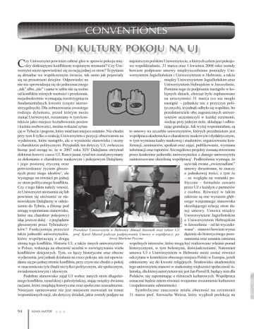 DNI KULTURY POKOJU NA UJ C A. Wojnar zy Uniwersytet powinien zabrać głos w sprawie pokoju mię- najstarszym polskim Uniwersytecie, a których celem jest pokojodzy dotkniętymi konfliktem wojennym stronami? Czy Uni- we współdziałanie. 31 marca oraz 1 kwietnia 2008 roku zostały wersytet może opowiedzieć się za racją jednej ze stron? Te pytania bowiem podpisane umowy międzyuczelniane pomiędzy Unisą aktualne we współczesnym świecie, tak samo jak pojawiały wersytetem Jagiellońskim i Uniwersytetem w Hebronie, a także się na przestrzeni dziejów. Odpowiedzi na między Uniwersytetem Jagiellońskim oraz 1 nie nie sprowadzają się do jednoznacznego Uniwersytetem Hebrajskim w Jerozolimie. „tak” albo „nie” i same w sobie nie są wolne Pomimo tego że podpisanie nastąpiło w kood konfliktu różnych wartości i przekonań, lejnych dniach, chociaż było zaplanowane niejednokrotnie wymagają rozstrzygnięcia na uroczystości 31 marca (co nie mogło fundamentalnych kwestii (często nieroznastąpić – jednakże nie z przyczyn polistrzygalnych). Dla zobrazowania swoistego tycznych), to jednak odbyło się wspólnie, bo rodzaju dylematu, przed którym może przedstawiciele obu zagranicznych uniwerstanąć Uniwersytet, rozumiany w tym konsytetów uczestniczyli w każdej ceremonii, tekście jako miejsce kształtowania postaw siedząc przy jednym stole, składając i odbiei kuźnia osobowości, można wskazać sytuarając gratulacje. Jak wyżej wspomniałam, są cję w Tybecie i pogrom, który miał tam miejsce ostatnio. Nie chodzi to umowy na szczeblu uniwersytetów, których przedmiotem jest przy tym li tylko o reakcję Uniwersytetu z pozycji obserwatora na współpraca akademicka o charakterze naukowym i dydaktycznym, wydarzenie, które nastąpiło, ale o wyrażenie stanowiska i oceny w tym wymiana kadry naukowej i studentów, organizowanie kono charakterze politycznym. Przypadek ten dotyczy UJ, zwłaszcza ferencji, seminariów, spotkań oraz zajęć, publikowanie, wymiana biorąc pod uwagę to, że w 2007 roku XIV Dalajlama otrzymał informacji oraz raportów. Szczegółowe projekty zostaną stworzone doktorat honoris causa UJ. Rzecz jasna, tytuł ten został przyznany przez konkretne jednostki uniwersyteckie z danego uniwersytetu za dokonania o charakterze naukowym i pokojowym Dalajlamy zainteresowane określoną współpracą3. Podkreślenia wymaga, że i jego postawę etyczną oraz są to tak zwane „zwierciadlane” potwierdzanie życiem głoszoumowy dwustronne, to znaczy nych przez niego ideałów2, ale o jednakowej treści, z tym że występuje on również po jednej – ze względu na warunki poze stron politycznego konfliktu. lityczne – formalnie zawarte Czy z tego faktu należy wnosić, przez UJ z każdym z partnerów że Uniwersytet utożsamia się lub z osobna. Również w takim powinien się utożsamić ze stazakresie są one wyrazem głębnowiskiem Dalajlamy w odnieszego wzajemnego stanowiska sieniu do Tybetu, a (biorąc pod określającego relację stron dauwagę wspomniane stanowisko, nej umowy. Umowa między które ma charakter pokojowy) Uniwersytetem Jagiellońskim idąc jeszcze dalej – z poglądami a Uniwersytetem Hebrajskim głoszonymi przez Tybetańczyw Jerozolimie – od lat wyczekików? Funkcjonują przecież Prorektor Uniwersytetu w Hebronie Ahmad Atawneh oraz rektor UJ wana4 – stanowi bowiem wyraz także jednostki uniwersyteckie, prof. Karol Musioł podczas podpisywania Umowy o współpracy; po dążenia do historycznego porolewej Marlena Pecyna które współpracują z drugą zumienia oraz uznania istnienia stroną tego konfliktu. Historia UJ, a także innych uniwersytetów wspólnych interesów, które mogą być realizowane właśnie ponad w Polsce, wskazuje na obecność uczelni w rozwiązywaniu wielu historycznymi, w tym bolesnymi, doświadczeniami. Natomiast konfliktów dziejowych. Tym, co łączy historyczne oraz obecne umowa UJ z Uniwersytetem w Hebronie może zostać również wydarzenia, jest jednak działanie na rzecz pokoju, nie zaś opowia- odczytana w kontekście obecnego miejsca Polski w Europie, jeżeli danie się po jednej stronie konfliktu, przy czym nie chodzi o pokój odniesiemy się do kwestii religijnych. Środowisko akademickie w znaczeniu nie tyle (bądź nie tylko) politycznym, ale społecznym, tego uniwersytetu stanowi w znakomitej większości społeczność isświadomościowym i ideowym. lamską, dla której autorytetem nie jest Jan Paweł II, będący nim dla Podobne stanowisko zajął UJ wobec innych stron długolet- Polaków, nie zapominając o różnicach kulturowych. Współpraca niego konfliktu, izraelskiej i palestyńskiej, stając między dwiema oznaczać będzie zatem również wzajemne zrozumienie kulturowe racjami, które znajdują historyczne oraz społeczne uzasadnienie. i respektowanie odmienności. Niniejsze opracowanie nie jest miejscem rozważań na temat Symboliczne znaczenie miała obecność na ceremonii wspomnianych racji, ale dotyczy działań, jakie zostały podjęte na 31 marca prof. Szewacha Weissa, który wygłosił prelekcję na 94 ALMA MATER sferami zainteresowania. Oczywiście, dyskusja ta oraz jej efekty muszą teraz zostać zamienione w konkretne działania podjęte na każdym z uniwersytetów (oraz instytucji pozaakademickich, które również były reprezentowane), ale wola wdrożenia w życie zaprezentowanych pomysłów jest bardzo silna, a przede wszystkim została wyrażona w atmosferze wzajemnego zaufania, co w takich warunkach jest bezcennym rezultatem spotkania. Z jednej zatem strony podpisane umowy stanowią zakoń- A. Wojnar A. Wojnar temat Czy istnieją szanse na pokój?. Profesor Weiss analizował obecną sytuację z perspektywy historycznej, procesów pokojowych, ich osiągnięć i dotychczasowego fiaska. Z perspektywy swojego doświadczenia wypowiadał się jednak za zrozumieniem dla każdej ze stron konfliktu, dostrzegając ich dramat pojedynczy oraz wspólny. Zakończy