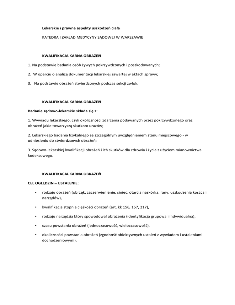 Lekarskieiprawneaspektyuszkodzeńciała KATEDRAIZAKŁADMEDYCYNYSĄDOWEJWWARSZAWIE KWALIFIKACJAKARNAOBRAŻEŃ 1.Napodstawiebadaniaosóbżywychpokrzywdzonychiposzkodowanych; 2.Woparciuoanalizędokumentacjilekarskiejzawartejwaktachsprawy; 3.Napodstawieobrażeństwierdzonychpodczassekcjizwłok. KWALIFIKACJAKARNAOBRAŻEŃ Badaniesądowo-lekarskieskładasięz: 1.Wywiadulekarskiego,czyliokolicznościzdarzeniapodawanychprzezpokrzywdzonegooraz obrażeńjakietowarzysząskutkomurazów; 2.Lekarskiegobadaniafizykalnegozeszczególnymuwzględnieniemstanumiejscowego-w odniesieniudostwierdzanychobrażeń; 3.Sądowo-lekarskiejkwalifikacjiobrażeńiichskutkówdlazdrowiaiżyciazużyciemmianownictwa kodeksowego. KWALIFIKACJAKARNAOBRAŻEŃ CELOGLĘDZIN–USTALENIE: • rodzajuobrażeń(obrzęk,zaczerwienienie,siniec,otarcianaskórka,rany,uszkodzeniakośćcai narządów), • kwalifikacjastopniaciężkościobrażeń(art.kk156,157,217), • rodzajunarzędziaktóryspowodowałobrażenia(identyfikacjagrupowaiindywidualna), • czasupowstaniaobrażeń(jednoczasowość,wieloczasowość), • okolicznościpowstaniaobrażeń(zgodnośćobiektywnychustaleńzwywiademiustaleniami dochodzeniowymi), KWALIFIKACJAKARNAOBRAŻEŃ Art.156.kk - §1Ktopowodujeciężkiuszczerbeknazdrowiuwpostaci: - 1)pozbawieniaczłowiekawzroku,słuchu,mowy,zdolnościpłodzenia, - 2)innegociężkiegokalectwa,ciężkiejchorobynieuleczalnejlubdługotrwałej, chorobyrealniezagrażającejżyciu,trwałejchorobypsychicznej,całkowitej lubznacznejtrwałejniezdolnościdopracywzawodzielubtrwałego, istotnegozeszpecenialubzniekształceniaciała,podlegakarzepozbawienia wolnościodrokudolat10. - §2.Jeżelisprawcadziałanieumyślnie,podlegakarzepozbawieniawolnościdolat3. - §3.Jeżelinastępstwemczynuokreślonegow§1jestśmierćczłowieka,sprawcapodlega karzepozbawieniawolnościodlat2do12. KWALIFIKACJAKARNAOBRAŻEŃ pozbawieniewzroku • pełnaślepotazezniesieniempoczuciaświatłalub • tzw.praktycznaślepota-dostrzeganietylko„cienia”przedmiotulubkrańcoweograniczenie polawidzenia-„widzenielunetowe”(ograniczeniewidzeniado0,02normypokorekcie szkłami), • utratajednegookauosobywcześniejjednoocznej KWALIFIKACJAKARNAOBRAŻEŃ pozbawieniesłuchu-całkowitagłuchotaczylicałkowitezniesienieodbiorudźwięków pozbawieniemowy-zwyklejestjednymzelementówciężkiegokalectwa(pochodzeniacentralnego), wyłącznautratamowy(utratazdolnościwypowiadaniaatrykułowanychidającychsięzrozumieć słów)jakowynikzniszczeniakrtaniczystrungłosowych KWALIFIKACJAKARNAOBRAŻEŃ pozbawieniezdolnościpłodzenia • ukobietwokresierozrodczymjesttoniezdolnośćzajściawciążę,donoszenia,urodzenia drogaminaturalnymiiwykarmieniadziecka,(dwaostatniesątokryteriawzględne) • umężczyzn-niezależnieodwieku-niezdolnośćdozapłodnieniaiodbywaniastosunków płciowych KWALIFIKACJAKARNAOBRAŻEŃ 2)inneciężkiekalectwo-trwałe,poważnenaruszenieczynnościlubutrataważnegonarządunp. ślepotajednooczna,utrataconajmniejczęścikończyny,utratanarząduparzystego(płuco,nerka), usztywnieniewniekorzystnejpozycjijednegozdużychstawów(barkowego,łokciowego, biodrowego,kolanowego,skokowego),zniesieniezdolnościchwytnejręki,utrata2-3palcówz kciukiemlubczterechpalców,porażenielubniedowładjednejkończyny KWALIFIKACJAKARNAOBRAŻEŃ ciężkachorobanieuleczalna-chorobaktóranierokujewyleczeniaprzyobecnychmożliwościach medycynynp.NKOspowodowanapourazowymuszkodzeniemklatkipiersiowej, ciężkachorobadługotrwała-tożsamazchorobąobłożną,któraustępujepopewnymczasienie pozostawiającpoważnychnastępstw(6m-cy) KWALIFIKACJAKARNAOBRAŻEŃ chorobarealniezagrażającażyciu–stan,wktórymnastępujepoważnezaburzeniepodstawowych czynnościniezbędnychdlażyciaukładównarządów,np.OUN,układuoddechowegolubkrążenia,z powoduktóregowkażdejchwilimożnaspodziewaćsięzahamowaniaiustaniaichczynności,azatem zgonu(np.:masywnykrwotokzwtórnierozwiniętymwstrząsem,obrażeniaśródczaszkowez wtórnymobrzękiemmózgu,ranysercaztamponadąworkaosierdziowego,ranybrzuchazwtórnym zapaleniemotrzewnej. trwałachorobapsychiczna-pourazowezaburzeniapsychicznepociężkichobrażeniachczaszkowomózgowych. KWALIFIKACJAKARNAOBRAŻEŃ całkowitalubtrwałaniezdolnośćdopracywzawodzie-zwykletożsamazciężkimkalectwem, główniedotoczyprzypadków,wktórychobrażeniasąśredniociężkie,aledlakonkretnejosobybyły poważne trwałeistotnezeszpecenielubzniekształcenieciała-zeszpeceniepodlegaocenieestetycznej, zniekształcenie-widocznyubyteklubzmianawyglądunarządubezupośledzeniajegoczynności. KWALIFIKACJAKARNAOBRAŻEŃ Art.157.kk - §1.Ktopowodujenaruszenieczynnościnarząduciałalubrozstrójzdrowia,innyniżokreślony wart.156§1,podlegakarzepozbawieniawolnościod3miesięcydolat5. - §2.Ktopowodujenaruszenieczynnościnarząduciałalubrozstrójzdrowiatrwającyniedłużej niż7dni,podlegagrzywnie,karzeograniczeniawolnościalbopozbawieniawolnościdolat2. - §3.Jeżelisprawcaczynuokreślonegow§1lub2działanieumyślnie,podlegagrzywnie,karze ograniczeniawolnościalbopozbawieniawolnościdoroku. - §4.Ściganieprzestępstwaokreślonegow§2lub3,jeżelinaruszenieczynnościnarząduciała lubrozstrójzdrowianietrwałdłużejniż7dni,odbywasięzoskarżeniaprywatnego. - §5.Jeżelinaruszenieczynnościnarząduciałalubrozstrójzdrowiatrwałdłużejniż7dni,a pokrzywdzonymjestosobanajbliższa,ściganieprzestępstwaokreślonegow§3następujena jejwniosek. KWALIFIKACJAKARNAOBRAŻEŃ Art.157§1–przykłady: - złamaniakości, - zwichnięciastawów, - uszkodzenienarządówwewnętrznych, - trwałeupośledzeniewzroku, - jednostronnagłuchota, - udokumentowanewstrząśnieniemózgu, - wstrząśnieniesiatkówkiibłędnika, - wybicieconajmniejjednego,zdrowegozęba. KWALIFIKACJAKARNAOBRAŻEŃ Art.157§2–przykłady: - stłuczeniaizranieniapowłokskórnych, - urazygłowy, - wylewykrwawepodspojówkowe, - złamaniekościnosabezprzemieszczeniaodłamów, - wybiciedo2-3zębówniepełnowartościowych, - złamaniejednegożebrabezprzemiesz