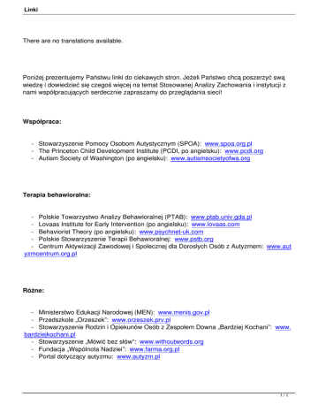 Linki There are no translations available. Poniżej prezentujemy Państwu linki do ciekawych stron. Jeżeli Państwo chcą poszerzyć swą wiedzę i dowiedzieć się czegoś więcej na temat Stosowanej Analizy Zachowania i instytucji z nami współpracujących serdecznie zapraszamy do przeglądania sieci! Współpraca: - Stowarzyszenie Pomocy Osobom Autystycznym (SPOA): www.spoa.org.pl - The Princeton Child Development Institute (PCDI, po angielsku): www.pcdi.org - Autism Society of Washington (po angielsku): www.autismsocietyofwa.org Terapia behawioralna: - Polskie Towarzystwo Analizy Behawioralnej (PTAB): www.ptab.univ.gda.pl - Lovaas Institute for Early Intervention (po angielsku): www.lovaas.com - Behaviorist Theory (po angielsku): www.psychnet-uk.com - Polskie Stowarzyszenie Terapii Behawioralnej: www.pstb.org - Centrum Aktywizacji Zawodowej i Społecznej dla Dorosłych Osób z Autyzmem: www.aut yzmcentrum.org.pl Różne: - Ministerstwo Edukacji Narodowej (MEN): www.menis.gov.pl - Przedszkole „Orzeszek”: www.orzeszek.prv.pl - Stowarzyszenie Rodzin i Opiekunów Osób z Zespołem Downa „Bardziej Kochani”: www. bardziejkochani.pl - Stowarzyszenie „Mówić bez słów”: www.withoutwords.org - Fundacja „Wspólnota Nadziei”: www.farma.org.pl - Portal dotyczący autyzmu: www.autyzm.pl 1/1