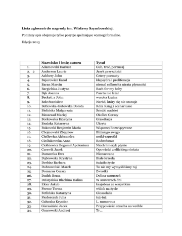 Lista zgłoszeń do nagrody im. Wisławy Szymborskiej. Poniższy spis obejmuje tylko pozycje spełniające wymogi formalne. Edycja 2013 1. 2. 2 3. 4. 5. 6. 7. 8. 9. 10. 11. 12. 13. 14. 15. 16. 17. 18. 19. 20. 21. 22. 23. 24. 25. 26. 27. 28. 29. 30. 31. 32. 33. 34. Nazwisko i imię autora Adamowski Dariusz Anderson Laurie Ashbery John Bajorowicz Karol Baran Marcin Bargielska Justyna Bąk Joanna Beckett a John Bełz Stanisław Betlewska-Gutowska Dorota Bielińska Małgorzata Bieszczad Maciej Borkowska Krystyna Brzózka Katarzyna Bukowski Benjamin Maria Chojnowski Zbigniew Cieślewicz Aleksandra Cieślukowska Anna Ciołkiewicz Bogumił Apoloniusz Czerwik Jacek Damentka Ewa Dąbrowska Krystyna Derbisz Barbara Dobrowolski Marek Domarus Cezary Dudek Beata Dziszyńska Błachino Halina Ekier Jakub Ferenc Teresa Fetlińska Katarzyna Fiedorczuk Julia Gałuszka Krystian Gierasiński Jacek Gnarowski Andrzej Tytuł Gub, trać, porzucaj Język przyszłości Cztery poematy klepsydra i proliferacja niemal całkowita utrata płynności Bach for my baby Pan tu nie leżał wysoka kraina Naród, który się nie szanuje Róża Ksiąg i scenariusze Ścieżki nadziei Okolice Gerazy Grawitacja Ukryte Wiązane/Rozwiązywane Bliźniego swego notki-szprotki Rodzeństwo Niech limeryk płynie Opowieści z elfickiego świata Nienazwane Białe krzesła światło życie To nie my wymyśliliśmy raj Zwrotki Dolina wzruszeń W szuwarach dni krajobraz ze wszystkim widok na życie Glossolalia tuż-tuż L. numerous Przypowieści stracha na wróble Ty… 35. 36. 37. 38. 39. 40. 41. 42. 43. 44. 45. 46. 47. 48. 49. 50. 51. 52. 53. 54. 55. 56. 57. 58. 59. 60. 61. 62. 63. 64. 65. 66. 67. 68. 69. 70. 71. 72. 73. 74. 75. 76. 77. 78. 79. Gordziej Zbigniew Góra Konrad Grobliński Piotr Grupa poetycka Rebjata Grupa poetycka Rebjata Gruszka-Zych Barbara Gustafsson Lars Iwańczuk Izabela Jakubowska-Fijałkowska Janas-Dudek Barbara Jankowska Mariola Jadwiga Jarecka Jola Jarniewicz Jerzy Jarosz Łukasz Jeleń Krzysztof Jelinek Elfride Jęcek Bogumiła Jędrzejczak Witold Jusięga Grażyna Kaczmarek Sławomir Kanclerz Andrzej Karasek Krzysztof Karbowska Lidia Kern Joanna, Parma Ewa Klary Beata Patrycja Kleszcz Krzysztof Knytel Magdalena Koniusz Zbigniew Konopelski Krzysztof Kowalska Kalina (Beata Golacik) Krakowiak Konrad Kronhold Jerzy Krzyżaniak Paulina Kurek Halina Kuśmierek Dariusz Kuzora Paweł Kwiecień Małgorzata Lament Lech Lasocka Joanna Lesiński Krzysztof J. Lewestam Jerzy Lipska Ewa Łatka Katarzyna Łokociejewska Barbara Łukasik Krystyna Piórem po żebrach anatomii Siła niższa inne sprawy dla reportera III Corso i inne wiersze szara jak wróbel Dziwne drobne przedmioty Perły wieczne ze mnie robaka i z robaka inne wiersze Zakład pracy chronionej Wiosenne przebudzenie Zawieszenie Na dzień dzisiejszy Pełna krew Prosty sens człowieka Koniec/ende czarne koronki Pod abażurem nagich cieni Lunatyczka I pragniemy tak namiętnie półludzie Dziennik rozbitka niedomknięte okno wiersza Hajer Blues de-klaracje Przecieki z góry Będę dla ciebie fiołkowa Na granicy światła i ciemności obajaja krzysztofa kolumba światło Warto Epitafium dla Lucy apteka myśli dekoracje i jedwabie na przełomie tysiącleci. Wiersze wybrane W dłoniach wiatru Niedokończona runda Winowajca księżyc wiersze przedwczesne Wszechobecny nieobecny we mnie Atomy emocji Droga pani Schubert w zakamarkach twoich dłoni Dogonić zapomnienie Znowu prawda 80. 81. 82. 83. 84. 85. 86. 87. 88. 89. 90. 91. 92. 93. 94. 95. 96. 97. 98. 99. 100. 101. 102. 103. 104. 105. 106. 107. 108. 109. 110. 111. 112. 113. 114. 115. 116. 117. 118. 119. 120. 121. 122. 123. 124. Maciejczyk Monika Makowski Henryk Maliszewski Karol Malska Marta Markiewicz Grażyna Mastek Urszula Edyta Matusz Sławomir Matywiecki Piotr Mazur-Nowak Bożena Helena Mączka Jacek Mądroszkiewicz Joanna Mekla Adam Michalik Monika Mika Artur Mikołajewski Jarosław Milewska Monika Miłobędzka Krystyna Miś Adam Mitzner Piotr Moczulski Leszek Moser Jarosław Murowaniecki Michał Musiał Elżbieta Nerval Ninette Niewiadomski Andrzej Nowaczyńska Anna Nowakowska Klara Oparek Joanna Osiewicz Ewelina Osojnik Iztok Ossowska Hanna Ostrowska Ewa Pacukiewicz Marek Paruszewski Jerzy Pawlik Marcin Petrykowski Marek Piątek Piotr Pietrzak Tomasz Piliszewska Anna Pilot Marian, Waga Adam Piwkowska Anna Piwowar Sylwia Plutowicz Jerzy Płatek Sławomir Płusa Kacper Polskie drogi Płowieją słowa Ody odbite Kłamca czas Pęknięci drewniana książeczka Cisza Widownia Bilet do stacji szczęście tupot, świst, chrzęst Zielona wyspa Zwierciadło nieba Wierszydło belles lettres Na wdechu Płacz komety Dwanaście wierszy Noc i dzień W oku kuku Antologia wizja lokalna Owoce noża Na zdjęciach wciąż żyjemy Kalifornijski supermarket Dzikie lilie Bezcennik Ulica Słowiańska Czerwie Tu powiesimy wielkiego artystę Spodnie na niebie Światłoczułość echolalia Budowa autostrady Wierne rzeki bunt na jeziorach Cytrynowo Dyrygent Fal Rekordy południe o barwie marengo Obol Lustrzanka w polifonii ciszy Miasto małe jak zła awaria migawki Ze skraju i ze świata 125. 126. 127. 128. 129. 130. 131. 132. 133. 134. 135. 136. 137. 138. 139. 140. 141. 142. 143. 144. 145. 146. 147. 148. 149. 150. 151. 152. 153. 154. 155. 156. 157. 158. 159. 160. 161. 162. 163. 164. 165. 166. 167. 168. Podlipnika Paweł Podsiadło Jacek Polkowski Jan Południak Małgorzata Pompa Klaudia Pompa Klaudia Poniedzielski Andrzej Porąbka Marek Raczyńska-Kraj Janina Radwański Janusz Radzięda Antonina Raginiak Stanisław Rojek Józef Jacek Romańczuk Marzen Ewa Rossakovsky-Lloyd Frederick Roszkowski Wojciech Różewicz Tadeusz Rudowicz Teresa Ryczywolski Grzegorz Sadulski Bartosz Sadzyńska Barbara Schodowski Krzysztof, Samsel Karol Sikorski Cezary Siwczyk Krzysztof Słownik Aleksandra Smolak Piotr Sobiera Tomasz Sosnowski Andrzej Stręk Grzegorz Strzałkowska Małgorzata Suchanek Jerzy Sułek Witold Suska Dariusz Sykała Janusz Szafrańska barba