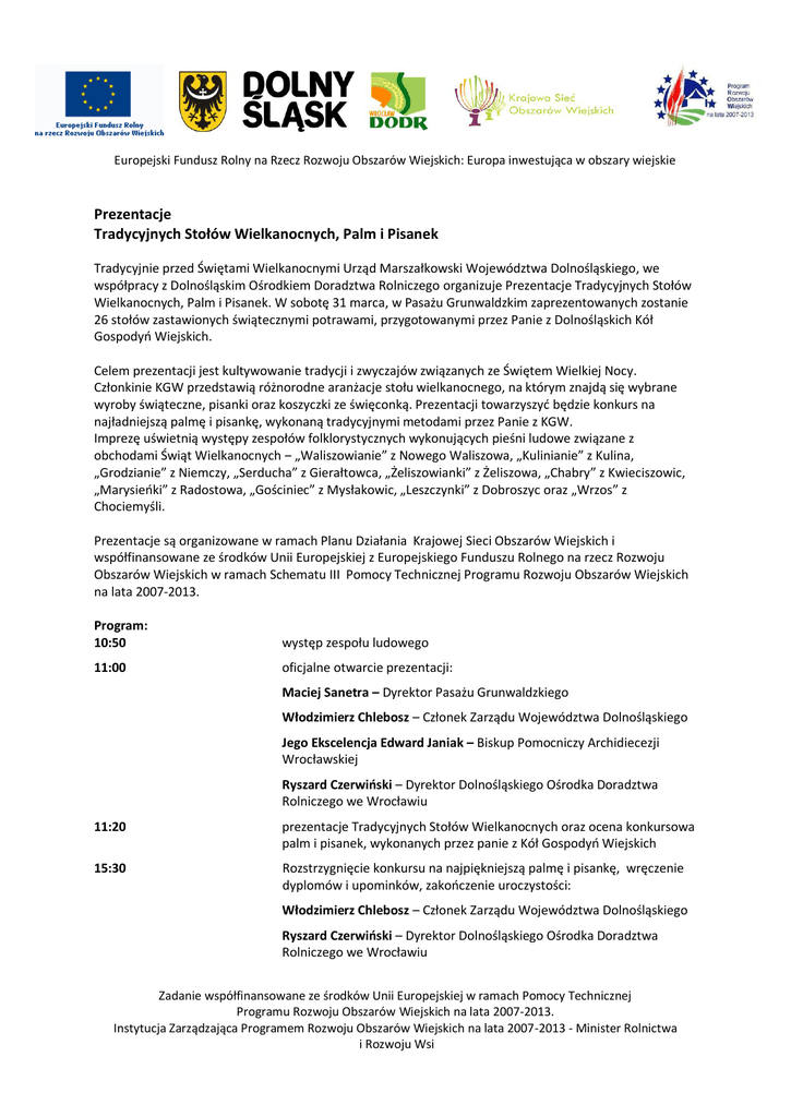 Europejski Fundusz Rolny na Rzecz Rozwoju Obszarów Wiejskich: Europa inwestująca w obszary wiejskie Prezentacje Tradycyjnych Stołów Wielkanocnych, Palm i Pisanek Tradycyjnie przed Świętami Wielkanocnymi Urząd Marszałkowski Województwa Dolnośląskiego, we współpracy z Dolnośląskim Ośrodkiem Doradztwa Rolniczego organizuje Prezentacje Tradycyjnych Stołów Wielkanocnych, Palm i Pisanek. W sobotę 31 marca, w Pasażu Grunwaldzkim zaprezentowanych zostanie 26 stołów zastawionych świątecznymi potrawami, przygotowanymi przez Panie z Dolnośląskich Kół Gospodyń Wiejskich. Celem prezentacji jest kultywowanie tradycji i zwyczajów związanych ze Świętem Wielkiej Nocy. Członkinie KGW przedstawią różnorodne aranżacje stołu wielkanocnego, na którym znajdą się wybrane wyroby świąteczne, pisanki oraz koszyczki ze święconką. Prezentacji towarzyszyć będzie konkurs na najładniejszą palmę i pisankę, wykonaną tradycyjnymi metodami przez Panie z KGW. Imprezę uświetnią występy zespołów folklorystycznych wykonujących pieśni ludowe związane z obchodami Świąt Wielkanocnych ‒ „Waliszowianie” z Nowego Waliszowa, „Kulinianie” z Kulina, „Grodzianie” z Niemczy, „Serducha” z Gierałtowca, „Żeliszowianki” z Żeliszowa, „Chabry” z Kwieciszowic, „Marysieńki” z Radostowa, „Gościniec” z Mysłakowic, „Leszczynki” z Dobroszyc oraz „Wrzos” z Chociemyśli. Prezentacje są organizowane w ramach Planu Działania Krajowej Sieci Obszarów Wiejskich i współfinansowane ze środków Unii Europejskiej z Europejskiego Funduszu Rolnego na rzecz Rozwoju Obszarów Wiejskich w ramach Schematu III Pomocy Technicznej Programu Rozwoju Obszarów Wiejskich na lata 2007-2013. Program: 10:50 występ zespołu ludowego 11:00 oficjalne otwarcie prezentacji: Maciej Sanetra – Dyrektor Pasażu Grunwaldzkiego Włodzimierz Chlebosz – Członek Zarządu Województwa Dolnośląskiego Jego Ekscelencja Edward Janiak – Biskup Pomocniczy Archidiecezji Wrocławskiej Ryszard Czerwiński – Dyrektor Dolnośląskiego Ośrodka Doradztwa Rolniczego we Wrocławiu 11:20 prezentacje Tradycyjnych Stołów Wielkanocnych oraz ocena konkursowa palm i pisanek, wykonanych przez panie z Kół Gospodyń Wiejskich 15:30 Rozstrzygnięcie konkursu na najpiękniejszą palmę i pisankę, wręczenie dyplomów i upominków, zakończenie uroczystości: Włodzimierz Chlebosz – Członek Zarządu Województwa Dolnośląskiego Ryszard Czerwiński – Dyrektor Dolnośląskiego Ośrodka Doradztwa Rolniczego we Wrocławiu Zadanie współfinansowane ze środków Unii Europejskiej w ramach Pomocy Technicznej Programu Rozwoju Obszarów Wiejskich na lata 2007-2013. Instytucja Zarządzająca Programem Rozwoju Obszarów Wiejskich na lata 2007-2013 - Minister Rolnictwa i Rozwoju Wsi
