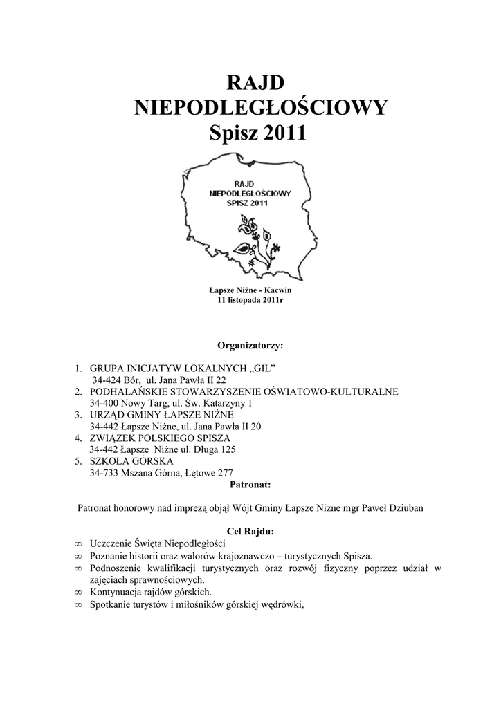 RAJD NIEPODLEGŁOŚCIOWY Spisz 2011 Łapsze Niżne - Kacwin 11 listopada 2011r Organizatorzy: 1. GRUPA INICJATYW LOKALNYCH „GIL” 34-424 Bór, ul. Jana Pawła II 22 2. PODHALAŃSKIE STOWARZYSZENIE OŚWIATOWO-KULTURALNE 34-400 Nowy Targ, ul. Św. Katarzyny 1 3. URZĄD GMINY ŁAPSZE NIŻNE 34-442 Łapsze Niżne, ul. Jana Pawła II 20 4. ZWIĄZEK POLSKIEGO SPISZA 34-442 Łapsze Niżne ul. Długa 125 5. SZKOŁA GÓRSKA 34-733 Mszana Górna, Łętowe 277 Patronat: Patronat honorowy nad imprezą objął Wójt Gminy Łapsze Niżne mgr Paweł Dziuban • • • • • Cel Rajdu: Uczczenie Święta Niepodległości Poznanie historii oraz walorów krajoznawczo – turystycznych Spisza. Podnoszenie kwalifikacji turystycznych oraz rozwój fizyczny poprzez udział w zajęciach sprawnościowych. Kontynuacja rajdów górskich. Spotkanie turystów i miłośników górskiej wędrówki, Termin Rajdu: 11 listopada 2011r. (piątek) W przypadku gwałtownego załamania pogody Organizator ma prawo odwołania Rajdu. Miejsce Rajdu: • • Łapsze Niżne - miejsce zbiórki w dniu 11 listopada 2011r: o godz. 8.50 - Kościół św. Kwiryna Trasa z Łapsz Niżnych (szlak turystyczny czerwony) z metą w Kacwinie (Remiza OSP) Przebieg Rajdu: W dniu 11.11.2011r o godz. 8.50 wszystkie grupy spotykają się w Łapszach Niżnych w kościele św. Kwiryna. O godz. 9.00 odprawiona zostanie Msza Święta i krótka uroczystość patriotyczna (mile widziana będzie znajomość i udział w śpiewaniu Roty). Po mszy grupy wyruszają z punktu startowego wg wyznaczonej kolejności szlakiem turystycznym czerwonym z Łapsz Niżnych do Kacwina. Na trasie Rajdu do pokonania będą punkty zadaniowe. O godzinie 15.00 spotkanie wszystkich grup w Remizie OSP w Kacwinie na ciepłym posiłku. W trakcie spotkanie prezentowane będą piosenki patriotyczne w wykonaniu uczestników oraz wydawane będą potwierdzenia punktów GOT i plakietki rajdowe uczestnikom Rajdu. Imprezy towarzyszące: 1. Bieg terenowy z punktami zadaniowymi:1.Bezpieczeństwo w górach – zdobycie wiedzy ; 2. Maskowanie i kamuflaż polowy; 3. „Tyrolka” - zjazd na linie z asekuracją; 4. Strzelanie w terenie przy użyciu karabinów ASG; 4. Ścianka wspinaczkowa z asekuracją. Uczestnicy podzieleni zostaną na grupy liczące do 10 osób i pod opieką wychowawcy pokonywać będę trasę. Ocenie w biegu podlegać będzie sprawność, umiejętność przyswajanie wiedzy i dobra zabawa. W rywalizacji nie decyduje czas przemarszu. Dla zwycięskich grup przewidziano nagrody. 2. Zorganizowany zostanie konkurs na najciekawsze zdjęcie wykonane podczas trwania Rajdu. Uczestnik konkursu zobowiązany jest przesłać zdjęcie na e-maila: [email protected] i złożyć oświadczenie o przekazaniu praw autorskich na Organizatora (oświadczenie będzie wydawane w trakcie Rajdu). Ogłoszenie wyników i wręczenie nagród odbędzie się po zakończeniu Rajdu w dniu 21.11.2011r Warunki uczestnictwa: 1. 2. 3. W rajdzie mogą brać udział drużyny zgłoszone przez SKKT, szkoły, organizacje społeczne i młodzieżowe wraz z opiekunami. Zgłoszenia muszą być potwierdzone przez Dyrekcję szkoły lub organizację zgłaszającą. Obowiązuje ubezpieczenie NNW we własnym zakresie. Kierownictwo rajdu nie bierze odpowiedzialności za powstałe wypadki oraz za konsekwencje z nich wynikające zarówno wobec uczestników jak i osób trzecich. Uczestnicy biorą udział w Rajdzie na własny koszt i ryzyko. 4. 5. 6. 7. Uczestnicy powinni miećć ze sobą sob strój i ekwipunek turystyczny. Przygotowanie jednej piosenki patriotycznej i zaprezentowanie jej podczas spotkania w Łapszach Niżnych. Zgłoszenia na rajd w terminie do 08 listopada 2010r należy ży dokonać dokona na kartach zgłoszenia na adres: GRUPA INICJATYW LOKALNYCH „GIL”, 34-424 34 424 Bór, ul. Jana Pawła II 22 e-mail: [email protected] . Osoba odpowiedzialna za organizację: organizacj Adam Andrzej Kustwan tel. 603 092 358. Organizator zapewnia: 1. 2. 3. 4. 5. 6. Okolicznościową naklejkęę rajdową. rajdow Potwierdzenie punktów GOT. Fachową obsługę rajdu. Ciepły poczęstunek stunek po przejściu przejś trasy górskiej. Nagrody za udział iał w konkursie fotograficznym. fotograficznym Nagrody za udział w biegu terenowym. tereno Życzymy przyjemnych wrażeń. wra Do zobaczenia na trasie. GRUPA INICJATYW LOKALNYCH „GIL” 34-424 Bór, ul. Jana Pawła II 22 URZĄD D GMINY ŁAPSZE NIŻNE NI 34-442 442 Łapsze Niżne, ul. Jana Pawła II 20 ZWIĄZEK POLSKIEGO SPISZA 34-442 Łapsze Niżne, ne, ul. Długa 125 PODHALAŃSKIE ŃSKIE STOWARZYSZENIE OŚWIATOWO-KULTURALNE KULTURALNE 34-400 400 Nowy Targ, ul. Św. Katarzyny Rajd został zorganizowany przy współudziale Podhalańskiego ńskiego Stowarzyszenia Oświatowo – Kulturalnego w Nowym Targu realizującego realizują projekt: „Akademia Oficerów - kształtowanie postaw patriotycznych, dyscypliny, tężyzny i sprawności ci umysłowej” umysłowej współfinansowany w ramach Programu Operacyjnego Fundusz Inicjatyw Obywatelskich współfinansowany za pośrednictwem Ministerstwa Pracy i Polityki Społecznej w Warszawie.