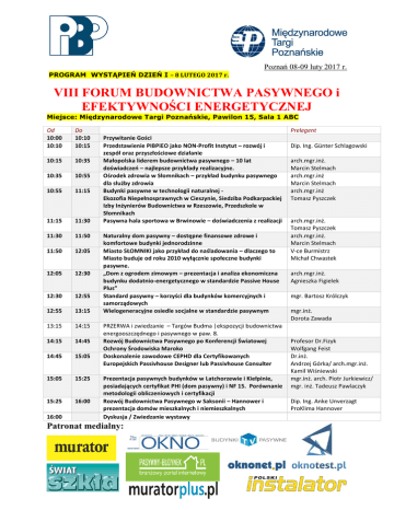 Poznań 08-09 luty 2017 r. PROGRAM WYSTĄPIEŃ DZIEŃ I – 8 LUTEGO 2017 r. VIII FORUM BUDOWNICTWA PASYWNEGO i EFEKTYWNOŚCI ENERGETYCZNEJ Miejsce: Międzynarodowe Targi Poznańskie, Pawilon 15, Sala 1 ABC Od 10:00 10:10 Do 10:10 10:15 10:15 10:35 10:35 10:55 10:55 11:15 11:15 11:30 11:30 11:50 11:50 12:05 12:05 12:30 12:30 12:55 12:55 13:15 13:15 14:15 14:15 14:45 14:45 15:05 15:05 15:25 15:25 16:00 16:00 Prelegent Przywitanie Gości Przedstawienie PIBPiEO jako NON-Profit Instytut – rozwój i zespół oraz przyszłościowe działanie Małopolska liderem budownictwa pasywnego – 10 lat doświadczeń – najlepsze przykłady realizacyjne. Ośrodek zdrowia w Słomnikach – przykład budynku pasywnego dla służby zdrowia Budynki pasywne w technologii naturalnej Ekozofia Niepełnosprawnych w Cieszynie, Siedziba Podkarpackiej Izby Inżynierów Budownictwa w Rzeszowie, Przedszkole w Słomnikach Pasywna hala sportowa w Brwinowie – doświadczenia z realizacji Naturalny dom pasywny – dostępne finansowe zdrowe i komfortowe budynki jednorodzinne Miasto SŁOMNIKI jako przykład do naśladowania – dlaczego to Miasto buduje od roku 2010 wyłącznie społeczne budynki pasywne. „Dom z ogrodem zimowym – prezentacja i analiza ekonomiczna budynku dodatnio-energetycznego w standardzie Passive House Plus” Standard pasywny – korzyści dla budynków komercyjnych i samorządowych Wielogeneracyjne osiedle socjalne w standardzie pasywnym PRZERWA i zwiedzanie – Targów Budma |ekspozycji budownictwa energooszczędnego i pasywnego w paw. 8. Rozwój Budownictwa Pasywnego po Konferencji Światowej Ochrony Środowiska Maroko Doskonalenie zawodowe CEPHD dla Certyfikowanych Europejskich Passivhouse Designer lub Passivhouse Consulter Prezentacja pasywnych budynków w Latchorzewie i Kiełpinie, posiadających certyfikat PHI (dom pasywny) i NF 15. Porównanie metodologii obliczeniowych i certyfikacji Rozwój Budownictwa Pasywnego w Saksonii – Hannower i prezentacja domów mieszkalnych i niemieszkalnych Dyskusja / Zwiedzanie wystawy Patronat medialny: Dip. Ing. Günter Schlagowski arch.mgr.inż. Marcin Stelmach arch.mgr.inż Marcin Stelmach arch.mgr.inż Tomasz Pyszczek arch.mgr.inż. Tomasz Pyszczek arch.mgr.inż. Marcin Stelmach V-ce Burmistrz Michał Chwastek arch.mgr.inż. Agnieszka Figielek mgr. Bartosz Królczyk mgr.inż. Dorota Zawada Profesor Dr.Fizyk Wolfgang Feist Dr.inż. Andrzej Górka/ arch.mgr.inż. Kamil Wiśniewski mgr.inż. arch. Piotr Jurkiewicz/ mgr. inż. Tadeusz Pawlaczyk Dip. Ing. Anke Unverzagt ProKlima Hannover PROGRAM WYSTĄPIEŃ DZIEŃ II – 9 LUTEGO 2017 r. VIII FORUM BUDOWNICTWA PASYWNEGO i EFEKTYWNOŚCI ENERGETYCZNEJ Miejsce: Międzynarodowe Targi Poznańskie, Pawilon 15, Sala 1 ABC, Od 09:30 09:35 Do 09:35 10:20 10:20 10:45 10:45 11:30 11:30 11:55 11:55 12:20 12:20 13:00 13:00 13:40 13:40 14:20 14:20 14:40 14:40 15:20 15:20 15:40 15:40 16:00 16:00 Prelegent Przywitanie gości Rozwój budownictwa pasywnego w Europie i na Świecie z termomodernizacją Zdrowe budynki dla wszystkich. Mieszkaj, pracuj i inwestuj w budynki w standardzie pasywnym – stare poddane termomodernizacji lub nowe Rozwój Budownictwa Pasywnego i lepszego z wizją Dom od (nowa) – przykład głębokiej termomodernizacji dwóch budynków do standardu pasywnego Interdyscyplinarne szkolenie z Europejskim Certyfikatem i wpisem na Europejską Listę Specjalistów Instytutu Budownictwa Pasywnego – zostań liderem i oprzyj swój biznes na budownictwie pasywnym PRZERWA i zwiedzanie – Targów Budma |ekspozycji budownictwa energooszczędnego i pasywnego w paw. 8. Termomodernizacja – droga do budynku pasywnego krok po kroku. Kiedy montować okna pasywne. Nie ma innej możliwej drogi niż budownictwo pasywne – w obiektach nowych czy termomodernizowanych (ekonomiczne zasady i doświadczenie) Design – PH nowe narzędzia do ułatwienia opracowań koncepcji budynków pasywnych i te narzędzia z PHPP jako kompleksowe narzędzia używać dla termomodernizacji i nowych budynków „proKilma- enercity” jako przykład rozwoju regionalnego dla popierania Budownictwa Pasywnego i energii odnawialnej – poprzez regionalną działalność i organizację w termomodernizacji przykłady Okna pasywne dla wszelkich budynków jako standard. Pomoc dla każdego producenta okien dla badan i produkcji takich okien – przede wszystkim dla termomomodernizacji Długotrwała ochrona klimatu nie jest możliwa bez wykorzystania efektywności budownictwa pasywnego przy termomodernizacji starego Budownictwa – „Przykłady” Dyskusja i PODSUMOWANIE konferencji Patronat medialny: Profesor Arch.Dipl.Ing. Ludwig Rongen arch.mgr.inż. Kamil Wiśniewski Profesor Arch.Dipl.Ing. Ludwig Rongen arch.mgr.inż. Agnieszka Figielek arch.mgr.inż. Kamil Wiśniewski Dr. fizyk Benjamin Krick PHI Darmstadt Prezes Frank Junker ABG Holding-Frankfurt/M arch.mgr.inż. Piotr Jurkiewicz Dipl.Ing.arch Mathias Wohlfahrt-ProKlima Hannover Inż. Sławomir Tomasz Kwiatkowski członek zespołu PIBPiEO Dipl.Ing. Gunter Schlagowski