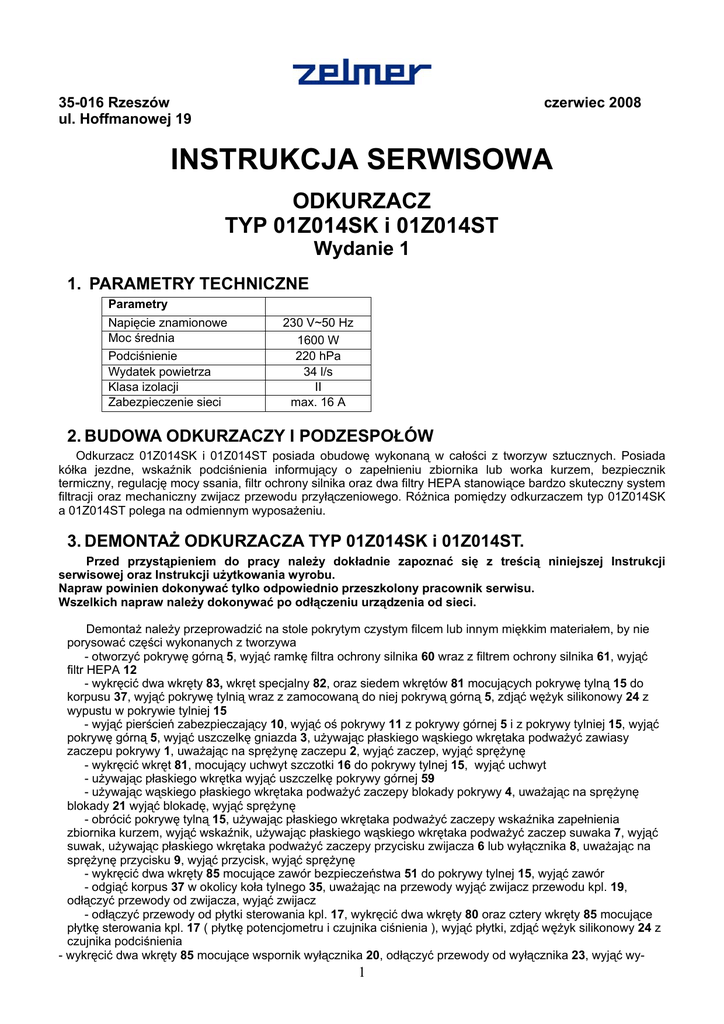 35-016 Rzeszów ul. Hoffmanowej 19 czerwiec 2008 INSTRUKCJA SERWISOWA ODKURZACZ TYP 01Z014SK i 01Z014ST Wydanie 1 1. PARAMETRY TECHNICZNE Parametry Napięcie znamionowe Moc średnia Podciśnienie Wydatek powietrza Klasa izolacji Zabezpieczenie sieci 230 V~50 Hz 1600 W 220 hPa 34 l/s II max. 16 A 2. BUDOWA ODKURZACZY I PODZESPOŁÓW Odkurzacz 01Z014SK i 01Z014ST posiada obudowę wykonaną w całości z tworzyw sztucznych. Posiada kółka jezdne, wskaźnik podciśnienia informujący o zapełnieniu zbiornika lub worka kurzem, bezpiecznik termiczny, regulację mocy ssania, filtr ochrony silnika oraz dwa filtry HEPA stanowiące bardzo skuteczny system filtracji oraz mechaniczny zwijacz przewodu przyłączeniowego. Różnica pomiędzy odkurzaczem typ 01Z014SK a 01Z014ST polega na odmiennym wyposażeniu. 3. DEMONTAŻ ODKURZACZA TYP 01Z014SK i 01Z014ST. Przed przystąpieniem do pracy należy dokładnie zapoznać się z treścią niniejszej Instrukcji serwisowej oraz Instrukcji użytkowania wyrobu. Napraw powinien dokonywać tylko odpowiednio przeszkolony pracownik serwisu. Wszelkich napraw należy dokonywać po odłączeniu urządzenia od sieci. Demontaż należy przeprowadzić na stole pokrytym czystym filcem lub innym miękkim materiałem, by nie porysować części wykonanych z tworzywa - otworzyć pokrywę górną 5, wyjąć ramkę filtra ochrony silnika 60 wraz z filtrem ochrony silnika 61, wyjąć filtr HEPA 12 - wykręcić dwa wkręty 83, wkręt specjalny 82, oraz siedem wkrętów 81 mocujących pokrywę tylną 15 do korpusu 37, wyjąć pokrywę tylnią wraz z zamocowaną do niej pokrywą górną 5, zdjąć wężyk silikonowy 24 z wypustu w pokrywie tylniej 15 - wyjąć pierścień zabezpieczający 10, wyjąć oś pokrywy 11 z pokrywy górnej 5 i z pokrywy tylniej 15, wyjąć pokrywę górną 5, wyjąć uszczelkę gniazda 3, używając płaskiego wąskiego wkrętaka podważyć zawiasy zaczepu pokrywy 1, uważając na sprężynę zaczepu 2, wyjąć zaczep, wyjąć sprężynę - wykręcić wkręt 81, mocujący uchwyt szczotki 16 do pokrywy tylnej 15, wyjąć uchwyt - używając płaskiego wkrętka wyjąć uszczelkę pokrywy górnej 59 - używając wąskiego płaskiego wkrętaka podważyć zaczepy blokady pokrywy 4, uważając na sprężynę blokady 21 wyjąć blokadę, wyjąć sprężynę - obrócić pokrywę tylną 15, używając płaskiego wkrętaka podważyć zaczepy wskaźnika zapełnienia zbiornika kurzem, wyjąć wskaźnik, używając płaskiego wąskiego wkrętaka podważyć zaczep suwaka 7, wyjąć suwak, używając płaskiego wkrętaka podważyć zaczepy przycisku zwijacza 6 lub wyłącznika 8, uważając na sprężynę przycisku 9, wyjąć przycisk, wyjąć sprężynę - wykręcić dwa wkręty 85 mocujące zawór bezpieczeństwa 51 do pokrywy tylnej 15, wyjąć zawór - odgiąć korpus 37 w okolicy koła tylnego 35, uważając na przewody wyjąć zwijacz przewodu kpl. 19, odłączyć przewody od zwijacza, wyjąć zwijacz - odłączyć przewody od płytki sterowania kpl. 17, wykręcić dwa wkręty 80 oraz cztery wkręty 85 mocujące płytkę sterowania kpl. 17 ( płytkę potencjometru i czujnika ciśnienia ), wyjąć płytki, zdjąć wężyk silikonowy 24 z czujnika podciśnienia - wykręcić dwa wkręty 85 mocujące wspornik wyłącznika 20, odłączyć przewody od wyłącznika 23, wyjąć wy- 1 łącznik 23 - wykręcić cztery wkręty 84 mocujące osłonę górną agregatu 46 do korpusu 37, wyjąć osłonę - uważając na przewody wyjąć agregat ssący 29, wraz z osłoną tylną agregatu 26 i osłoną przednią agregatu 30, oraz z amortyzatorem agregatu 31 i wspornikiem amortyzatora tylnego 25, wyjąć wspornik amortyzatora tylnego 25, wyjąć amortyzator agregatu 31, wykręcić trzy wkręty 84 i wyjąć osłonę przednią agregatu 30, wyjąć uszczelkę agregatu 32, unieść na niewielką wysokość osłonę tylną agregatu 26 i odłączyć przewody od agregatu ssącego 29 oraz wyłącznika termicznego 52, wyjąć wkładkę wyciszająca agregatu 28, wyjąć osłonę tylna agregatu 26, wyjąć amortyzator tylny 27 - używając dwóch płaskich wkrętaków podważyć dwa zaczepy koła tylnego kpl. 35, wypchnąć koło w kierunku od odkurzacza, wyjąć koło - podważyć płaskim szerokim wkrętakiem koło przednie we wsporniku kółka przedniego kpl 38, wyjąć koło wraz z ośką, wykręcić dwa wkręty 86 mocujące wspornik koła przedniego kpl 38, wyjąć wspornik koła kpl - używając płaskiego wąskiego wkrętaka podważyć oś rolki 34 wraz z rolką 33, wyjąć rolkę - palcem wskazującym wypchnąć na zewnątrz zaślepkę gniazda elektroszczotki 39 - odkleić wkładki wyciszające 40, 41, 42 Demontaż segmentu zbiornika kurzu 44 - opróżnić zbiornik kurzu - wyjąć filtr główny „HEPA” - wlotowy 70 zgodnie z instrukcją użytkowania, oczyścić komorę W przypadku wykrycia uszkodzenia (pęknięcia, zniszczenia) którejkolwiek z części segmentu zbiornika kurzu, należy wymienić cały segment zbiornika kurzu 70 na nowy, a w przypadku stwierdzenia nadmiernego zabrudzenia filtra głównego „HEPA” - wlotowego 70 należy go wymyć. 4. -MONTAŻ ODKURZACZA TYP 01Z014SK i 01Z014ST Montaż odkurzaczy przebiega zasadniczo w odwrotnej kolejności niż demontaż, należy jednak zwrócić szczególną uwagę na prawidłowe wykonanie niektórych czynności: 4.1. Montując obudowę agregatu ssącego należy zwrócić uwagę na: - prawidłowe zamocowanie agregatu ssącego, - prawidłowe przyleganie amortyzatorów korpusu, - prawidłowe przeprowadzenie przewodów przez wgłębienie w obudowie. 4.2. Połączenia elektryczne należy wykonać ściśle wg schematu połączeń elektrycznych. Przewody elektryczne należy prowadzić tak, aby nie stykały się z ruchomymi częściami zwijacza i ostrymi krawędziami. 4.3. Nakładając osłonę górną agregatu 46 należy zwracać uwagę na prawidłowe podłączenie ułożenie i poprowadzenie przewodów wewnętrznych przez rozcięci
