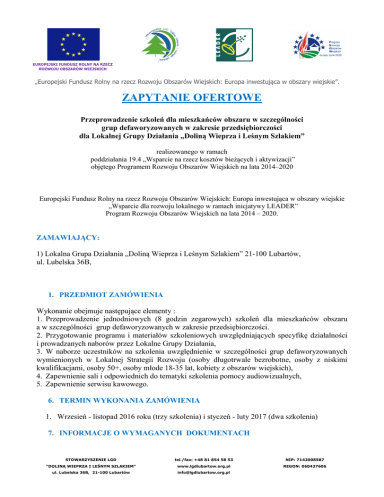 EUROPEJSKI FUNDUSZ ROLNY NA RZECZ ROZWOJU OBSZARÓW WIEJSKICH „Europejski Fundusz Rolny na rzecz Rozwoju Obszarów Wiejskich: Europa inwestująca w obszary wiejskie”. ZAPYTANIE OFERTOWE Przeprowadzenie szkoleń dla mieszkańców obszaru w szczególności grup defaworyzowanych w zakresie przedsiębiorczości dla Lokalnej Grupy Działania „Doliną Wieprza i Leśnym Szlakiem” realizowanego w ramach poddziałania 19.4 „Wsparcie na rzecz kosztów bieżących i aktywizacji” objętego Programem Rozwoju Obszarów Wiejskich na lata 2014–2020 Europejski Fundusz Rolny na rzecz Rozwoju Obszarów Wiejskich: Europa inwestująca w obszary wiejskie „Wsparcie dla rozwoju lokalnego w ramach inicjatywy LEADER” Program Rozwoju Obszarów Wiejskich na lata 2014 – 2020. ZAMAWIAJĄCY: 1) Lokalna Grupa Działania „Doliną Wieprza i Leśnym Szlakiem” 21-100 Lubartów, ul. Lubelska 36B, 1. PRZEDMIOT ZAMÓWIENIA Wykonanie obejmuje następujące elementy : 1. Przeprowadzenie jednodniowych (8 godzin zegarowych) szkoleń dla mieszkańców obszaru a w szczególności grup defaworyzowanych w zakresie przedsiębiorczości. 2. Przygotowanie programu i materiałów szkoleniowych uwzględniających specyfikę działalności i prowadzanych naborów przez Lokalne Grupy Działania, 3. W naborze uczestników na szkolenia uwzględnienie w szczególności grup defaworyzowanych wymienionych w Lokalnej Strategii Rozwoju (osoby długotrwale bezrobotne, osoby z niskimi kwalifikacjami, osoby 50+, osoby młode 18-35 lat, kobiety z obszarów wiejskich), 4. Zapewnienie sali i odpowiednich do tematyki szkolenia pomocy audiowizualnych, 5. Zapewnienie serwisu kawowego. 6. TERMIN WYKONANIA ZAMÓWIENIA 1. Wrzesień - listopad 2016 roku (trzy szkolenia) i styczeń - luty 2017 (dwa szkolenia) 7. INFORMACJE O WYMAGANYCH DOKUMENTACH STOWARZYSZENIE LGD tel./fax: +48 81 854 58 53 NIP: 7142008587 "DOLINĄ WIEPRZA I LEŚNYM SZLAKIEM" www.lgdlubartow.org.pl REGON: 060437606 ul. Lubelska 36B, 21-100 Lubartów [email protected] EUROPEJSKI FUNDUSZ ROLNY NA RZECZ ROZWOJU OBSZARÓW WIEJSKICH „Europejski Fundusz Rolny na rzecz Rozwoju Obszarów Wiejskich: Europa inwestująca w obszary wiejskie”. Ofertę należy złożyć na: druku zapytania ofertowego do wypełnienia. 8. OSOBA UPRAWNIONA DO POROZUMIEWANIA SIĘ Z OFERENTAMI Osoba do kontaktu: Leszek Zieliński – tel. / fax.: 81 8545853; e-mail: [email protected] 9. MIEJSCE ORAZ TERMIN SKŁADANIA OFERT Ofertę należy złożyć pocztą elektroniczną w formie skanu prawidłowo wypełnionego i opieczętowanego druku zapytania ofertowego na dres: [email protected] do dnia 31.08.2016 do godz. 14.00. 10. KRYTERIA, KTÓRYMI BĘDZIE SIĘ KIEROWAŁ ZAMAWIAJĄCY PRZY WYBORZE OFERTY, WRAZ Z PODANIEM ZNACZENIA TYCH KRYTERIÓW Zamawiający zleci wykonanie przedmiotu zamówienia wykonawcy, co do którego ustalono, że: 1) wykaże doświadczenie lub dysponowanie kadrą posiadającą takie doświadczenie w realizacji w/w szkoleń (35 % pkt – maksymalnie 35 punktów); 2) przedstawi Zamawiającemu program szkolenia (5% pkt – maksymalnie 5 punktów). 3) wykaże posiadanie niezbędnych środków technicznych (sala, pomoce audiowizualne) do realizacji w/w zamówienia (10% pkt – maksymalnie 10 punktów); 4) zaoferuje najkorzystniejszą – najniższą cenę ofertową brutto za wykonanie całości zamówienia (50% pkt – maksymalnie 50 punktów). 10. INNE Wykonawca może realizować przedmiot zamówienia wyłącznie na terenie objętym Lokalną Strategią Rozwoju. STOWARZYSZENIE LGD tel./fax: +48 81 854 58 53 NIP: 7142008587 "DOLINĄ WIEPRZA I LEŚNYM SZLAKIEM" www.lgdlubartow.org.pl REGON: 060437606 ul. Lubelska 36B, 21-100 Lubartów [email protected]