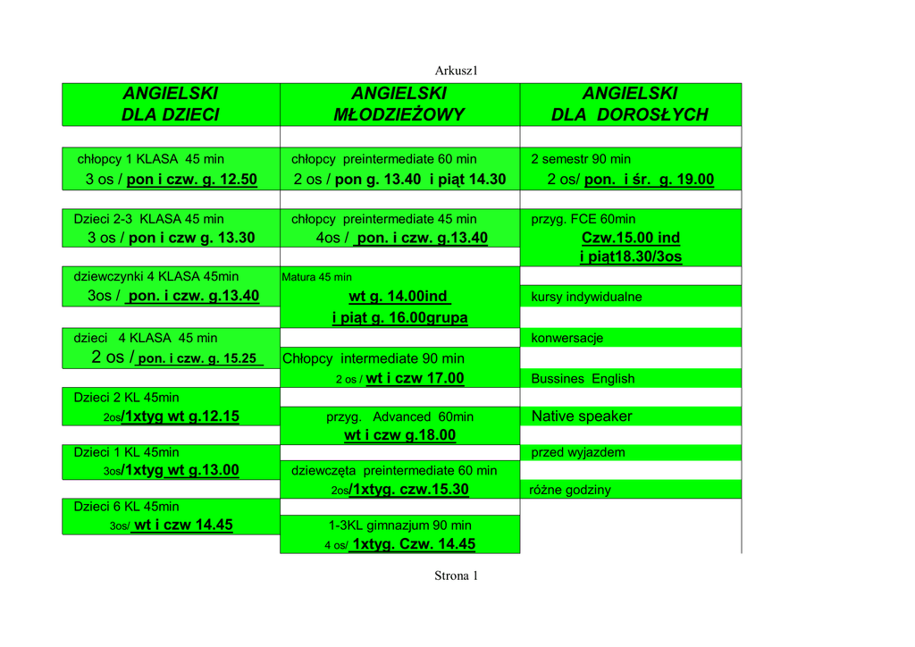 Arkusz1 ANGIELSKI DLA DZIECI chłopcy 1 KLASA 45 min 3 os / pon i czw. g. 12.50 Dzieci 2-3 KLASA 45 min 3 os / pon i czw g. 13.30 dziewczynki 4 KLASA 45min 3os / pon. i czw. g.13.40 ANGIELSKI MŁODZIEśOWY chłopcy preintermediate 60 min 2 os / pon g. 13.40 i piąt 14.30 chłopcy preintermediate 45 min 4os / pon. i czw. g.13.40 2 semestr 90 min 2 os/ pon. i śr. g. 19.00 przyg. FCE 60min Czw.15.00 ind i piąt18.30/3os Matura 45 min wt g. 14.00ind i piąt g. 16.00grupa dzieci 4 KLASA 45 min 2 os / pon. i czw. g. 15.25 ANGIELSKI DLA DOROSŁYCH kursy indywidualne konwersacje Chłopcy intermediate 90 min 2 os / wt i czw 17.00 Bussines English Dzieci 2 KL 45min 2os/1xtyg wt g.12.15 przyg. Advanced 60min Native speaker wt i czw g.18.00 Dzieci 1 KL 45min 3os/1xtyg wt g.13.00 przed wyjazdem dziewczęta preintermediate 60 min 2os/1xtyg. czw.15.30 Dzieci 6 KL 45min 3os/ wt i czw 14.45 1-3KL gimnazjum 90 min 4 os/ 1xtyg. Czw. 14.45 Strona 1 róŜne godziny Arkusz1 Dzieci 5/6 KL 45min 2os/ wt i piąt 15.30 Native speaker MłodzieŜ w kaŜdym wieku lekcje indywidualne róŜne godziny ZERÓWKA 45 min 3os/1xtyg. Śr g. 15.45 ANGIELSKI DLA DZIECI cd. dzieci 3/4KL 45 min 4os/ ROSYJSKI BUŁGARSKI WŁOSKI FRANCUSKI wt g. 16-20 3 sem 60 min śr i piąt 13.40 2os/ Native speaker wt. g.18.00 5 sem 60 min 2 os / pon. dzieci w kaŜdym wieku 9sem 60 min Osoby dorosłe lekcje indywidualne MłodzieŜ i dzieci róŜne godziny w kaŜdym wieku lekcje indywidualne i piąt. g. 19.00 3os/ piąt. g.12.50 Osoby dorosłe MłodzieŜ i dzieci w kaŜdym wieku lekcje indywidualne róŜne godziny róŜne godziny Strona 2 Arkusz1 NIEMIECKI DLA DZIECI chłopcy 5 KLASA 45 min 2os / pon. i śr. g.13.40 NIEMIECKI MŁODZIEśOWY dziewczęta NIEMIECKI DLA DOROSŁYCH POLSKI HISTORIA 3 sem 90 min 4os/ pon i piąt g.18.30 1gimnazjum 90 min 2 os / pon g. 13.40 Chłopcy 4 KLASA 45 min MłodzieŜ 3 gimnazjum 60 min / 3 os 3os / pon. g.16.15 i śr.ind. pon i śr g. 16.30 dziewczynki 4KLASA 45 min 3os/ śr i piąt 13.40 Matura 60 min ind pon wt śr piąt g.17.30 sob g.15.00 kursy indywidualne dzieci w kaŜdym wieku lekcje indywidualne róŜne godziny MłodzieŜ w kaŜdym wieku lekcje indywidualne róŜne godziny konwersacje róŜne godziny MłodzieŜ i dzieci w kaŜdym wieku lekcje indywidualne róŜne godziny Strona 3 Arkusz1 HISZPAŃSKI PORTUGALSKI SZWEDZKI 1 sem dziewczynki 5 KL 45 MIN 2os 1xtyg pon 13.40 zaawansowany 2 os/ 1xtyg czw 18.00 Osoby dorosłe MłodzieŜ i dzieci w kaŜdym wieku lekcje indywidualne róŜne godziny Strona 4 Arkusz1 MATEMATYKA ŚWIETLICA PSYCHOLOG FIZYKA INTEGRACJA SENSORYCZNA CHEMIA BIOLOGIA MłodzieŜ 3 gimnazjum 60 min / 3 os wtorek g. 18.15 Czw. 12.50 Czwartek 16.15 18.00 Sob. 8.00 9.00 Pon i sob g. 16.15 7.30 – 18.00 od pon do piąt. SZK.PODST. wt. czw. sob. MłodzieŜ i dzieci w kaŜdym wieku MŁODZIEś dzieci od urodzenia Do 13 lat DOROŚLI Czw , pon, wt ODRABIANIE LEKCJI SOBOTA g. 8.30-17.00 14.30-18.00 SZK.PODST. Matura 90 min ind DZIECI terapia reedukacja pamięć, szybkie czytanie Dysleksja – diagnoza - terapia lekcje indywidualne róŜne godziny Strona 5 g.16.30-20 sob. g.9.00-13.00 Arkusz1 Strona 6 Arkusz1 GITARA Dziewczęta 2 sem 45 min / 2os pon. g. 17.15 sob. g.9,10 TANIEC BALET taniec towarzyski dzieci przedszkolne i szkolne 60min/ 6 os GIMNASTYKA GIMNASTYKA KRĘGOSŁUPA KOREKTYWA wtorek g.16.30 GIMNASTYKA BALET OGÓLNOROZWOJOWA dzieci przedszkolne i szkolne 60min/ 6 os Wtorek g.19.15 Piątek 19.30 środa g.16.30 MłodzieŜ i dzieci w kaŜdym wieku taniec nowoczesny lekcje indywidualne róŜne godziny nauka tańca przed weselem wt, śr g.18,19 Strona 7 Arkusz1 Strona 8