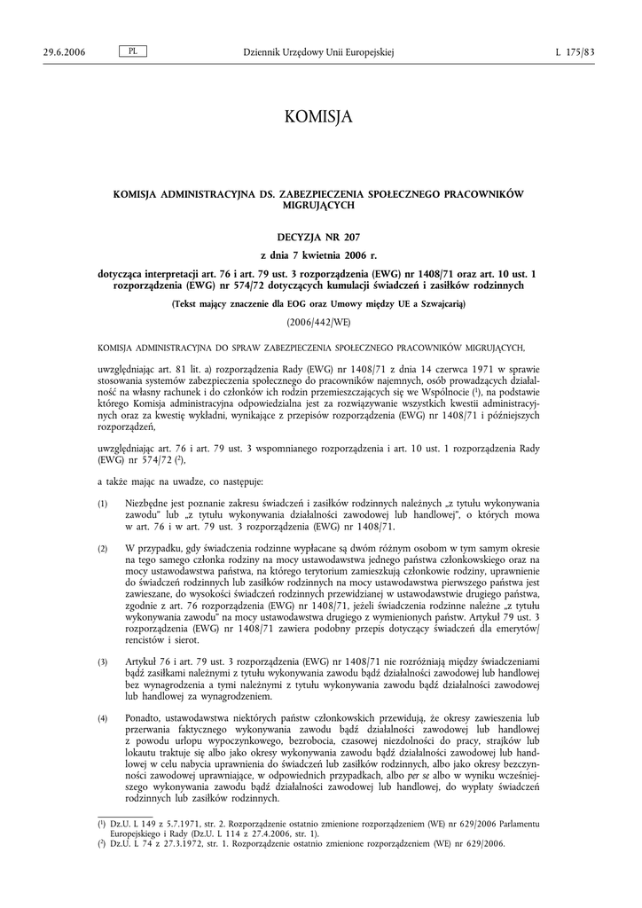 PL 29.6.2006 Dziennik Urzędowy Unii Europejskiej KOMISJA KOMISJA ADMINISTRACYJNA DS. ZABEZPIECZENIA SPOŁECZNEGO PRACOWNIKÓW MIGRUJĄCYCH DECYZJA NR 207 z dnia 7 kwietnia 2006 r. dotycząca interpretacji art. 76 i art. 79 ust. 3 rozporządzenia (EWG) nr 1408/71 oraz art. 10 ust. 1 rozporządzenia (EWG) nr 574/72 dotyczących kumulacji świadczeń i zasiłków rodzinnych (Tekst mający znaczenie dla EOG oraz Umowy między UE a Szwajcarią) (2006/442/WE) KOMISJA ADMINISTRACYJNA DO SPRAW ZABEZPIECZENIA SPOŁECZNEGO PRACOWNIKÓW MIGRUJĄCYCH, uwzględniając art. 81 lit. a) rozporządzenia Rady (EWG) nr 1408/71 z dnia 14 czerwca 1971 w sprawie stosowania systemów zabezpieczenia społecznego do pracowników najemnych, osób prowadzących działalność na własny rachunek i do członków ich rodzin przemieszczających się we Wspólnocie (1), na podstawie którego Komisja administracyjna odpowiedzialna jest za rozwiązywanie wszystkich kwestii administracyjnych oraz za kwestię wykładni, wynikające z przepisów rozporządzenia (EWG) nr 1408/71 i późniejszych rozporządzeń, uwzględniając art. 76 i art. 79 ust. 3 wspomnianego rozporządzenia i art. 10 ust. 1 rozporządzenia Rady (EWG) nr 574/72 (2), a także mając na uwadze, co następuje: (1) Niezbędne jest poznanie zakresu świadczeń i zasiłków rodzinnych należnych „z tytułu wykonywania zawodu” lub „z tytułu wykonywania działalności zawodowej lub handlowej”, o których mowa w art. 76 i w art. 79 ust. 3 rozporządzenia (EWG) nr 1408/71. (2) W przypadku, gdy świadczenia rodzinne wypłacane są dwóm różnym osobom w tym samym okresie na tego samego członka rodziny na mocy ustawodawstwa jednego państwa członkowskiego oraz na mocy ustawodawstwa państwa, na którego terytorium zamieszkują członkowie rodziny, uprawnienie do świadczeń rodzinnych lub zasiłków rodzinnych na mocy ustawodawstwa pierwszego państwa jest zawieszane, do wysokości świadczeń rodzinnych przewidzianej w ustawodawstwie drugiego państwa, zgodnie z art. 76 rozporządzenia (EWG) nr 1408/71, jeżeli świadczenia rodzinne należne „z tytułu wykonywania zawodu” na mocy ustawodawstwa drugiego z wymienionych państw. Artykuł 79 ust. 3 rozporządzenia (EWG) nr 1408/71 zawiera podobny przepis dotyczący świadczeń dla emerytów/ rencistów i sierot. (3) Artykuł 76 i art. 79 ust. 3 rozporządzenia (EWG) nr 1408/71 nie rozróżniają między świadczeniami bądź zasiłkami należnymi z tytułu wykonywania zawodu bądź działalności zawodowej lub handlowej bez wynagrodzenia a tymi należnymi z tytułu wykonywania zawodu bądź działalności zawodowej lub handlowej za wynagrodzeniem. (4) Ponadto, ustawodawstwa niektórych państw członkowskich przewidują, że okresy zawieszenia lub przerwania faktycznego wykonywania zawodu bądź działalności zawodowej lub handlowej z powodu urlopu wypoczynkowego, bezrobocia, czasowej niezdolności do pracy, strajków lub lokautu traktuje się albo jako okresy wykonywania zawodu bądź działalności zawodowej lub handlowej w celu nabycia uprawnienia do świadczeń lub zasiłków rodzinnych, albo jako okresy bezczynności zawodowej uprawniające, w odpowiednich przypadkach, albo per se albo w wyniku wcześniejszego wykonywania zawodu bądź działalności zawodowej lub handlowej, do wypłaty świadczeń rodzinnych lub zasiłków rodzinnych. (1) Dz.U. L 149 z 5.7.1971, str. 2. Rozporządzenie ostatnio zmienione rozporządzeniem (WE) nr 629/2006 Parlamentu Europejskiego i Rady (Dz.U. L 114 z 27.4.2006, str. 1). (2) Dz.U. L 74 z 27.3.1972, str. 1. Rozporządzenie ostatnio zmienione rozporządzeniem (WE) nr 629/2006. L 175/83 PL L 175/84 Dziennik Urzędowy Unii Europejskiej (5) Celem uniknięcia niepewności bądź różnic w interpretacji, niezbędne jest zdefiniowanie zakresu wyrażeń „wykonywanie zawodu” oraz „wykonywanie działalności zawodowej lub handlowej”. (6) Niezbędne jest również poznanie zakresu terminu „działalność zawodowa lub handlowa”, o którym mowa w art. 10 ust. 1 rozporządzenia (EWG) nr 574/72. (7) W przypadku, gdy świadczenia lub zasiłki rodzinne wypłacane są dwóm różnym osobom w tym samym okresie na tego samego członka rodziny na mocy ustawodawstwa jednego państwa członkowskiego oraz na mocy ustawodawstwa drugiego państwa, zgodnie z którym nabycie prawa do świadczeń nie jest uzależnione od spełnienia warunków ubezpieczenia, zatrudnienia lub działalności na własny rachunek, uprawnienie do świadczeń rodzinnych na mocy ustawodawstwa pierwszego państwa zostaje zawieszone, do wysokości świadczeń rodzinnych przewidzianej w ustawodawstwie drugiego państwa, zgodnie z art. 10 ust. 1 lit. b) i) rozporządzenia (EWG) nr 574/72, jeżeli działalność zawodowa lub handlowa wykonywana jest w drugim z wymienionych państw. Artykuł 10 ust. 1 lit. b) ii) rozporządzenia (EWG) nr 574/72 zawiera podobny przepis dotyczący świadczeń dla emerytów/rencistów i sierot. (8) W kwestii kumulacji świadczeń rodzinnych lub zasiłków rodzinnych, celem art. 10 ust. 1 jest nadanie wykonywaniu działalności zawodowej lub handlowej w państwie członkowskim, gdzie uprawnienie do świadczeń lub zasiłków rodzinnych nie wynika z wykonywania tego rodzaju działalności, takiego samego skutku jak w państwach członkowskich, w których takie uprawnienie wynika z prowadzenia tego typu działalności. Wykładnia art. 76 i art. 79 ust. 3 rozporządzenia (EWG) nr 1408/71 i art. 10 ust. 1 rozporządzenia (EWG) nr 574/72 jest taka sama. (9) W przypadku, gdy status aktywnego zatrudnienia pracownika zawieszono z powodu bezpłatnego urlopu z tytułu urodzenia dziecka, który jest przeznaczony na wychowywanie tego dziecka, Trybunał Sprawiedliwości Wspólnot Europejskich odniósł się do art. 73 rozporządzenia (EWG) nr 1408/71 w połączeniu z art. 13 ust. 2 lit. a) rozporządzenia (EWG) nr 1408/71 (1). Dlatego też tego rodzaju urlop bezpłatny również należy kwal
