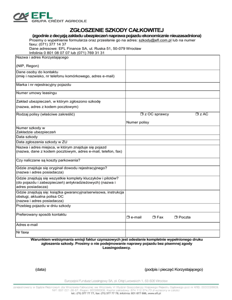 ZGŁOSZENIE SZKODY CAŁKOWITEJ (zgodnie z decyzją zakładu ubezpieczeń naprawa pojazdu ekonomicznie nieuzasadniona) Prosimy o wypełnienie formularza oraz przesłanie go na adres: [email protected] lub na numer faxu: (071) 377 14 37 Dane adresowe: EFL Finance SA, ul. Ruska 51, 50-079 Wrocław Infolinia 0 801 08 07 07 lub (071) 769 31 31 Nazwa i adres Korzystającego (NIP, Regon) Dane osoby do kontaktu (imię i nazwisko, nr telefonu komórkowego, adres e-mail) Marka i nr rejestracyjny pojazdu Numer umowy leasingu Zakład ubezpieczeń, w którym zgłoszono szkodę (nazwa, adres z kodem pocztowym) Rodzaj polisy (właściwe zakreślić) z OC sprawcy z AC Numer polisy Numer szkody w Zakładzie ubezpieczeń Data szkody Data zgłoszenia szkody w ZU Nazwa i adres miejsca, w którym znajduje się pojazd (nazwa, dane z kodem pocztowym, adres e-mail, telefon, fax) Czy naliczane są koszty parkowania? Gdzie znajduje się oryginał dowodu rejestracyjnego? (nazwa i adres posiadacza) Gdzie znajdują się wszystkie komplety kluczyków i pilotów? (do pojazdu i zabezpieczeń) antykradzieżowych) (nazwa i adres posiadacza) Gdzie znajdują się: książka gwarancyjna/serwisowa, instrukcja obsługi, aktualna polisa OC (nazwa i adres posiadacza) Przebieg pojazdu w dniu szkody Preferowany sposób kontaktu e-mail Fax Poczta Adres e-mail Nr faxu Warunkiem wstrzymania emisji faktur czynszowych jest odesłanie kompletnie wypełnionego druku zgłoszenia szkody. Prosimy o nie podejmowanie naprawy pojazdu bez pisemnej zgody Leasingodawcy. (data) (podpis i pieczęć Korzystającego)