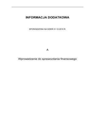 ___________________________________________________________________________ INFORMACJA DODATKOWA SPORZĄDZONA NA DZIEŃ 31-12-2010 R. A Wprowadzenie do sprawozdania finansowego Dodatkowe informacje i objaśnienia 2 1)Nazwa (firma) i siedziba: ZWIĄZEK LUBUSKICH ORGANIZACJI POZARZĄDOWYCH , 65-775 Zielona Góra ul. Zacisze 17, NIP 929-17-05-358, REGON 970616900 . Cel działania organizacji : - TWORZENIE PŁASZCZYZNY WSPÓŁPRACY I INTEGRACJA DZIAŁALNOŚCI ORGANIZACJI POZARZĄDOWYCH NA RZECZ ZWIĘKSZENIA ICH SKUTECZNOŚCI DZIAŁANIA DLA ROZWOJU SPOŁECZEŃSTWA OBYWATELSKIEGO. - POMOC ORGANIZACJOM POZARZADOWYM W ROZWIĄZYWANIU PROBLEMÓW ZWIĄZANYCH Z ICH STATUTOWĄ DZIAŁALNOŚCIA. -PODNOSZENIE RANGI ORGANIZACJI POZARZĄDOWYCH W POLITYCE SPOŁECZNEJ, EKONOMICZNEJ I KULTURALNEJ PAŃSTWA. -REPREZENTOWANIE ORGANIZACJI POZARZĄDOWYCH WOBEC SEKTORA PUBLICZNEGO I INNYCH ŚRODOWISK. Podstawa prawna działalności : Stowarzyszenie działa na podstawie Statutu i obowiązujących ustaw pod nazwą : ZWIĄZEK LUBUSKICH ORGANIZACJI POZARZĄDOWYCH Organ rejestrowy i data wpisu do rejestru : Stowarzyszenie jest zarejestrowane w Rejestrze Stowarzyszeń, Innych Organizacji Społecznych i Zawodowych, Fundacji oraz Publicznych Zakładów Opieki Zdrowotnej prowadzonym przez Sąd Rejonowy w Zielonej Górze, VIII Wydz. Gospodarczy Krajowego Rejestru Sądowego . Stowarzyszenie jest zarejestrowane pod numerem KRS 0000169865. 2)Sprawozdanie finansowe sporządzono za okres od 01-01-2010 r. do 31-12-2010 r. 3)Przyjęte zasady rachunkowości, w tym metody wyceny aktywów i pasywów : 1.Rokiem obrotowym jest rok kalendarzowy . W ramach roku obrotowego okresem sprawozdawczym jest miesiąc – do sumowania obrotów na kontach księgi głównej i uzgodnienia z dziennikiem oraz z zapisami na kontach ksiąg pomocniczych. 2.Zasady funkcjonowania kont przyjmuje się według „Wzorcowego Planu Kont”, wydanego przez PERFECTUM-AUDIT , Sp. z o.o. W Warszawie /wydanie 2003r./ stosując je odpowiednio – do poszczególnych kont, a także gdy zostały one podzielone lub połączone w zakładowym wykazie kont księgi głównej”. 3.Zasady prowadzenia kont ksiąg pomocniczych i wyceny składników majątku. 3.1.Koszty związane z zakupem materiałów zalicza się bezpośrednio do kosztów działalności statutowej na podstawie dowodów źródłowych. Dodatkowe informacje i objaśnienia 3 3.2.Amortyzacja środków trwałych oraz wartości niematerialnych i prawnych o wartości przekraczającej jednostkowo 3.500 zł jest dokonywana metodą liniową , według stawek określonych jako maksymalne dla celów podatkowych w równych ratach miesięcznych, przy zastosowaniu dopuszczalnych przepisami podatkowymi współczynników podwyższających stawki amortyzacyjne / z uwzględnieniem odpowiednich przepisów podatkowych/. Środki trwałe o niskiej wartości jednostkowej, nie przekraczającej 3.500 zł, amortyzuje się w sposób uproszczony, dokonując jednorazowego odpisu ich pełnej wartości w momencie przekazania do używania i prowadzi ich ewidencję księgowo w sposób umożliwiający identyfikacje każdego przedmiotu . 4.Jednostka prowadzi ewidencję i rozliczanie kosztów według rodzajów - na kontach zespołu 4 w powiązaniu z kosztami wg działalności zespołu 5 sporządza rachunek zysków i strat w postaci porównawczej. 5.Ewidencję przychodów i związanych z nimi kosztów wyodrębnionych rodzajów działalności statutowej prowadzi się w sposób pozwalający na ustalenie wyniku finansowego na działalności statutowej. 6.Przyjęte metody wyceny aktywów i pasywów : - środki trwałe oraz wartości niematerialne i prawne wyceniono wg cen nabycia pomniejszone o odpisy amortyzacyjne przy zastosowaniu stawek amortyzacyjnych określonych w ustawie o podatku dochodowym od osób prawnych, - ewidencja kosztów działalności prowadzona jest w układzie rodzajowym, a rachunek zysków i strat prezentowany w układzie porównawczym, - należności i zobowiązania wyceniono w kwocie wymagającej zapłaty, - środki pieniężne, fundusze oraz pozostałe aktywa i pasywa wyceniono wg wartości nominalnej. PREZES ZARZADU Zielona Góra, dnia 2011-03-24 (pieczątka firmowa) Sporządziła : Ewa Kaniewska Podpisy członków Zarządu 1.Romuald Malinowski ............................................. 2.Włodzimierz Szopinski ............................................. 3.Zofia Kulikowska 4.Irena Ratajczak ............................................. ............................................ 5.Ryszard Napierała ............................................. (członek Zarządu od 12 marca 2010r.) 6.Grzegorz Szulczyk .............................................. (członek Zarządu do 12 marca 2010r.) Dodatkowe informacje i objaśnienia 4 B Dodatkowe informacje i objaśnienia . 1) Szczegółowy zakres zmian wartości grup rodzajowych środków trwałych, wartości niematerialnych i prawnych oraz trwałych lokat finansowych: rodki trwałe : – 20.570,74,- ( BO – niskiej warto ci ) Zakup - Darowizna - Likwidacja RAZEM 0,00 -1.000,00 – dla Stow. Klub Abstyneneta ZDRÓJ 0.00 19.570,74 Warto ci niematerialne i prawne: - nie wyst piły 2) wartość gruntów użytkowanych wieczyście: NIE DOTYCZY 3) wartość nie amortyzowanych lub nie umarzanych przez jednostkę środków trwałych, używanych na podstawie umów najmu, dzierżawy i innych umów, w tym z tytułu umów leasingu: nie dotyczy Dodatkowe informacje i objaśnienia 5 4) propozycje co do sposobu podziału zysku lub pokrycia straty za rok obrotowy: Nadwy ka przychodów nad kosztami zwi kszy przychody nast pnego roku obrotowego. 4) podział zobowiązań długoterminowych według pozycji bilansu o pozostałym od dnia bilansowego, przewidywanym umową, okresie spłaty: nie wyst piły 5) wykaz istotnych pozycji czynnych i biernych rozliczeń międzyokresowych: 1Międzyokresowe rozliczenie przychodu - 2.924,97 – dotyczy amortyzacji kserokopiarki zakupionej w ramach realizacji projektu 