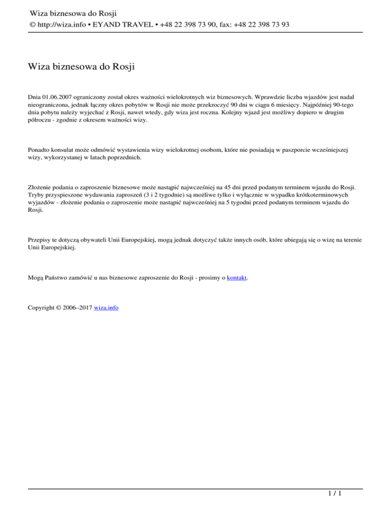 Wiza biznesowa do Rosji © http://wiza.info • EYAND TRAVEL • +48 22 398 73 90, fax: +48 22 398 73 93 Wiza biznesowa do Rosji Dnia 01.06.2007 ograniczony został okres ważności wielokrotnych wiz biznesowych. Wprawdzie liczba wjazdów jest nadal nieograniczona, jednak łączny okres pobytów w Rosji nie może przekroczyć 90 dni w ciągu 6 miesięcy. Najpóźniej 90-tego dnia pobytu należy wyjechać z Rosji, nawet wtedy, gdy wiza jest roczna. Kolejny wjazd jest możliwy dopiero w drugim półroczu - zgodnie z okresem ważności wizy. Ponadto konsulat może odmówić wystawienia wizy wielokrotnej osobom, które nie posiadają w paszporcie wcześniejszej wizy, wykorzystanej w latach poprzednich. Złożenie podania o zaproszenie biznesowe może nastąpić najwcześniej na 45 dni przed podanym terminem wjazdu do Rosji. Tryby przyspieszone wydawania zaproszeń (3 i 2 tygodnie) są możliwe tylko i wyłącznie w wypadku krótkoterminowych wyjazdów - złożenie podania o zaproszenie może nastąpić najwcześniej na 5 tygodni przed podanym terminem wjazdu do Rosji. Przepisy te dotyczą obywateli Unii Europejskiej, mogą jednak dotyczyć także innych osób, które ubiegają się o wizę na terenie Unii Europejskiej. Mogą Państwo zamówić u nas biznesowe zaproszenie do Rosji - prosimy o kontakt. Copyright © 2006–2017 wiza.info 1/1