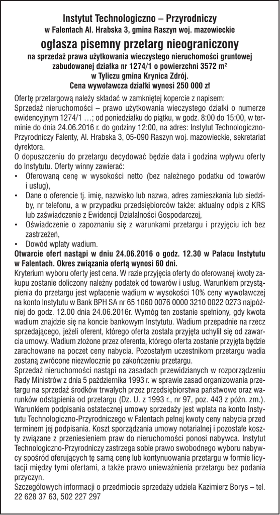Instytut Technologiczno – Przyrodniczy w Falentach Al. Hrabska 3, gmina Raszyn woj. mazowieckie ogłasza pisemny przetarg nieograniczony na sprzedaż prawa użytkowania wieczystego nieruchomości gruntowej zabudowanej działka nr 1274/1 o powierzchni 3572 m2 w Tyliczu gmina Krynica Zdrój. Cena wywoławcza działki wynosi 250 000 zł Ofer tę przetargową należy składać w zamkniętej kopercie z napisem: Sprzedaż nieruchomości – prawo użytkowania wieczystego działki o numerze ewidencyjnym 1274/1 …; od poniedziałku do piątku, w godz. 8:00 do 15:00, w terminie do dnia 24.06.2016 r. do godziny 12:00, na adres: Instytut TechnologicznoPrzyrodniczy Falenty, Al. Hrabska 3, 05-090 Raszyn woj. mazowieckie, sekretariat dyrektora. O dopuszczeniu do przetargu decydować będzie data i godzina wpływu ofer ty do Instytutu. Ofer ty winny zawierać: • Oferowaną cenę w wysokości netto (bez należnego podatku od towarów i usług), • Dane o oferencie tj. imię, nazwisko lub nazwa, adres zamieszkania lub siedziby, nr telefonu, a w przypadku przedsiębiorców także: aktualny odpis z KRS lub zaświadczenie z Ewidencji Działalności Gospodarczej, • Oświadczenie o zapoznaniu się z warunkami przetargu i przyjęciu ich bez zastrzeżeń, • Dowód wpłaty wadium. Otwarcie ofert nastąpi w dniu 24.06.2016 o godz. 12.30 w Pałacu Instytutu w Falentach. Okres związania ofertą wynosi 60 dni. Kryterium wyboru ofer ty jest cena. W razie przyjęcia ofer ty do oferowanej kwoty zakupu zostanie doliczony należny podatek od towarów i usług. Warunkiem przystąpienia do przetargu jest wpłacenie wadium w wysokości 10% ceny wywoławczej na konto Instytutu w Bank BPH SA nr 65 1060 0076 0000 3210 0022 0273 najpóźniej do godz. 12.00 dnia 24.06.2016r. Wymóg ten zostanie spełniony, gdy kwota wadium znajdzie się na koncie bankowym Instytutu. Wadium przepadnie na rzecz sprzedającego, jeżeli oferent, którego ofer ta została przyjęta uchylił się od zawarcia umowy. Wadium złożone przez oferenta, którego ofer ta zostanie przyjęta będzie zarachowane na poczet ceny nabycia. Pozostałym uczestnikom przetargu wadia zostaną zwrócone niezwłocznie po zakończeniu przetargu. Sprzedaż nieruchomości nastąpi na zasadach przewidzianych w rozporządzeniu Rady Ministrów z dnia 5 października 1993 r. w sprawie zasad organizowania przetargu na sprzedaż środków trwałych przez przedsiębiorstwa państwowe oraz warunków odstąpienia od przetargu (Dz. U. z 1993 r., nr 97, poz. 443 z późn. zm.). Warunkiem podpisania ostatecznej umowy sprzedaży jest wpłata na konto Instytutu Technologiczno-Przyrodniczego w Falentach pełnej kwoty ceny nabycia przed terminem jej podpisania. Koszt sporządzania umowy notarialnej i pozostałe koszty związane z przeniesieniem praw do nieruchomości ponosi nabywca. Instytut Technologiczno-Przyrodniczy zastrzega sobie prawo swobodnego wyboru nabywcy spośród oferujących tę samą cenę lub kontynuowania przetargu w formie licytacji między tymi ofer tami, a także prawo unieważnienia przetargu bez podania przyczyn. Szczegółowych informacji o przedmiocie sprzedaży udziela Kazimierz Borys – tel. 22 628 37 63, 502 227 297