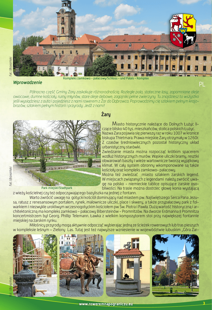 fot. I.Brzeziński Wprowadzenie Kompleks zamkowo - pałacowy/Schloss - und Palais - Komplex PL Północna część Gminy Żary zaskakuje różnorodnością. Rozległe pola, stateczne lasy, zapomniane aleje owocowe, dumne kościoły, ruiny młynów, stare aleje dębowe, zagajniki pełne zwierzyny. Tu znajdziesz to wszystko jeśli wysiądziesz z auta i pojedziesz z nami rowerem z Żar do Dąbrowca. Poprowadzimy cię szlakiem pełnym krajobrazów, szlakiem pełnym historii i przyrody. Jedź z nami! Żary Miasto historycznie należące do Dolnych Łużyc liczące blisko 40 tys. mieszkańców, stolica polskich Łużyc. Nazwa Zara pojawia się pierwszy raz w roku 1007 w kronice biskupa Thietmara. Prawa miejskie Żary otrzymały w 1260r. Z czasów średniowiecznych pozostał historyczny układ urbanistyczny starówki. Zwiedzanie miasta można rozpocząć krótkim spacerem wzdłuż historycznych murów. Wąskie uliczki bramy, resztki obwarowań baszty i wieże wartownicze tworzą wyjątkowy klimat. W cały system obronny wkomponowane są także kościoły oraz kompleks zamkowo- pałacowy. Można też zwiedzać miasto szlakiem żarskich legend. W miejscach związanych z legendami należy zwrócić uwagę na polsko - niemieckie tablice opisujące żarskie osoPark miejski/Stadtpark bliwości. Na trasie można dostrzec głowę konia wystającą z wieży kościelnej czy też odpoczywającego bazyliszka na jednej z fontann. Warto zwrócić uwagę na gotycki kościół dominujący nad miastem pw. Najświętszego Serca Pana Jezusa, ratusz z renesansowym portalem, rynek, malownicze uliczki, place i skwery, a także przypałacowy park z folwarkiem i niezwykle urokliwym wczesnogotyckim kościołem pw Św. Piotra i Pawła. Dużą wartość historyczną i architektoniczną ma kompleks zamkowo - pałacowy Bibersteinów - Promnitzów. Na dworze Erdmanna II Promnitza koncertmistrzem był Georg. Phillip Telemann. Ławka z wielkim kompozytorem stoi przy największej fontannie miejskiej na żarskim rynku. Miłośnicy przyrody mogą aktywnie odpocząć wybierając jedną ze ścieżek rowerowych lub tras pieszych w kompleksie leśnym – Zielony Las. Tutaj jest też najwyższe wzniesienie w województwie lubuskim „Góra Żar fot. I.Brzeziński fot. I.Brzeziński www.roweremnapograniczu.eu 3 ska” 227 m. n.p.m. Turystę może zaskoczyć prawie górski krajobraz, który jest pozostałością po morenie czołowej ostatniego zlodowacenia. Parowy porośnięte urokliwą buczyną mają czasami głębokość dochodzącą do 50m. Warto też skorzystać z kompleksu basenów krytych „Wodnik” oraz jednego z wielu nowoczesnych wielofunkcyjnych boisk. Koniecznie trzeba także odwiedzić Muzeum Pogranicza Śląsko - Łużyckiego, w którym można zobaczyć ciekawą makietę starówki, zbiór żarskiej porcelany oraz wiele pamiątek z dawnych czasów. DE Einleitung fot. I.Brzeziński fot. I.Brzeziński 4 Der nördliche Teil der Gemeinde Żary überrascht mit ihrer Vielfältigkeit. Weite Felder, prächtige Wälder, in Vergangenheit geratene Fruchtalleen, aufragende Kirchen, Mühlenruinen, alte Eichenalleen, Haine voller Tiere. Hier kannst du das alles finden, wenn du nur aus deinem Wagen aussteigst und mit uns mit Fahrrädern von Żary nach Dąbrowiec fährst. Wir führen dich durch den landschaftlich wunderschönen Radweg, voller Geschichte und Natur. Fahr mit uns! Żary Historisch gesehen gehört die Stadt zu Niederlausitz. Mit knapp 40.000 Rynek/Marktplatz Einwohnern ist Żary die Hauptstadt deren polnischen Teils. Der Name Zara wird zum ersten Mal im Jahre 1007 in der Chronik Thietmars von Merseburg genannt. Die Stadtrechte erhielt Żary im Jahre 1260. Vom Mittelalter blieb der historische Städtebau der Altstadt. Die Stadtbesichtigung kann man mit kurzem Spaziergang historische Stadtmauer entlang beginnen. Schmale Gassen, Tore, Befestigungsreste des Wehrturms und Wehrtürme schaffen außergewöhnliches Klima. In das ganze Wehrkomplex sind auch die Kirchen und Schloss- und Palais Komplex hineinkomponiert. Man kann die Stadt auch nach der Tour der Sorauer Sagen besichtigen. An Stellen, die mit den Sagen verbunden sind, soll man Aufmerksamkeit auf deutsch- polnische Tafeln lenken, die Sorauer Sehenswürdigkeiten beschreiben. Auf der Tour sehen wir also den Pferdekopf, der aus dem Kirchturm ragt, oder den auf einer der Fontänen ausruhenden Wurm. Es lohnt sich hier die über der Stadt aufragende gotische Herz-Jesu-Kirche, Rathaus mit dem Renaissance- Portal, Markplatz, schöne Gassen, Grünanlagen, sowie Schlosspark mit Vorwerk und schöner frühgotischer Kirche St. Peter und Paul zu besichtigen. Vom großen historischen und architektonischen Wert ist der Schloss- und PalaisKomplex von Biberstein- Promnitz. Georg Philipp Telemann war Kapellmeister am Hofe des Grafen Erdmann II. von Promnitz. Die Bank mit dem berühmten Komponisten steht bei der größten Fontaine auf dem Sorauer Marktplatz. Die Naturfreunde können sich aktiv erholen, indem sie eine der Wander- oder Radwege im „Sorauer Wald“ – Zielony Las wählen. Hier befindet sich die höchste Erhebung im Lebuser Land „Góra Żarska” 227 m ü. NN. Der Tourist kann mit der beinahe Gebirgslandschaft überrascht werden, die durch die Stirnmoräne der letzten Eiszeit gestaltet worden ist. Die mit reizendem Buchenwald bewachsenen Schluchten sind teilweise bis zu 50 m tief. Man kann hier auch Schwimmbadkomplex „Wodnik“ und einen der modernen Mehrzwecksportplätze nutzen. Es lohnt sich auch das Museum des Schlesisch- Lausitzer Grenzgebietes zu besuchen, wo man interessantes Modell der Altstadt, die Sammlung Sorauer Porzellan und viele andere Andenken aus alten Zeiten sehen kann. Katedra/Pfarrkirche Rynek nocą/Marktplatz in der Nach www.roweremnapograniczu.eu Ratusz/Rathaus PL Lubomyśl www.lubomysl.pl Zaliczany jest do najstarszych osad łużyckich na Ziemi Żarskiej. W swej bogatej historii wiele razy zmieniał swoją nazwę. Niemiecka brzmiała: Waltersdorf, łu