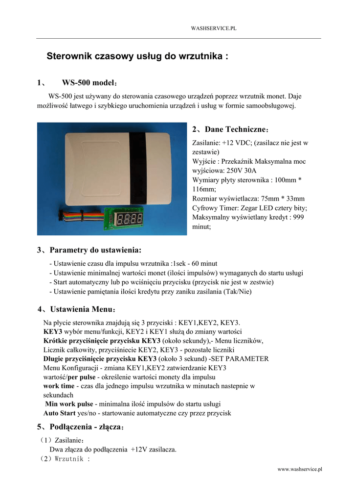 WASHSERVICE.PL Sterownik czasowy usług do wrzutnika : 1、 WS-500 model: WS-500 jest używany do sterowania czasowego urządzeń poprzez wrzutnik monet. Daje możliwość łatwego i szybkiego uruchomienia urządzeń i usług w formie samoobsługowej. 2、Dane Techniczne: Zasilanie: +12 VDC; (zasilacz nie jest w zestawie) Wyjście : Przekaźnik Maksymalna moc wyjściowa: 250V 30A Wymiary płyty sterownika : 100mm * 116mm; Rozmiar wyświetlacza: 75mm * 33mm Cyfrowy Timer: Zegar LED cztery bity; Maksymalny wyświetlany kredyt : 999 minut; 3、Parametry do ustawienia: - Ustawienie czasu dla impulsu wrzutnika :1sek - 60 minut - Ustawienie minimalnej wartości monet (ilości impulsów) wymaganych do startu usługi - Start automatyczny lub po wciśnięciu przycisku (przycisk nie jest w zestwie) - Ustawienie pamiętania ilości kredytu przy zaniku zasilania (Tak/Nie) 4、Ustawienia Menu: Na płycie sterownika znajdują się 3 przyciski : KEY1,KEY2, KEY3. KEY3 wybór menu/funkcji, KEY2 i KEY1 służą do zmiany wartości Krótkie przyciśnięcie przycisku KEY3 (około sekundy),- Menu liczników, Licznik całkowity, przyciśniecie KEY2, KEY3 - pozostałe liczniki Długie przyciśnięcie przycisku KEY3 (około 3 sekund) -SET PARAMETER Menu Konfiguracji - zmiana KEY1,KEY2 zatwierdzanie KEY3 wartość/per pulse - określenie wartości monety dla impulsu work time - czas dla jednego impulsu wrzutnika w minutach nastepnie w sekundach Min work pulse - minimalna ilość impulsów do startu usługi Auto Start yes/no - startowanie automatyczne czy przez przycisk 5、Podłączenia - złącza: (1)Zasilanie: Dwa złącza do podłączenia +12V zasilacza. (2)Wrzutnik : www.washservice.pl SHANGHAI WAFER MICROELECTRONICS CO.,LTD. W przypadku dostarczenia wrzutnika H9 naszej firmy podłączenie według : Czerwony: +12V DC Czarny: GND -12V DC White:Wyjście impulsowe (NO typu) wrzutnika. Pozostałych przewodów nie należy podłączać. (3)Przycisk Start: Przycisk służy do uruchomienia usług po wrzuceniu monet. Jeśli jest wybrany w menu tryb auto przycisk nie jest używany. (4)Przycisk Reset: Służy do awaryjnego wyłączenia przyciskiem stop w momencie gdy usługa działa. 6、Schemat połączeń: WS-500LCD ma jedno wyjście przekaźnikowe - przekazuje podłączone napięcie dla urządzenia - odbiornika zasilanego po wrzuceniu monety. . www.washservice.pl
