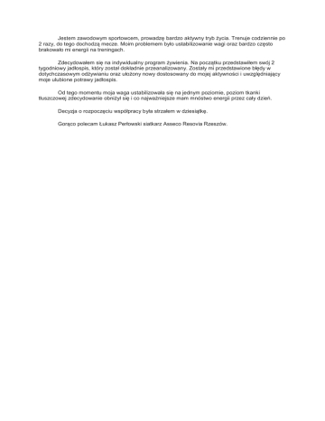 Jestem zawodowym sportowcem, prowadzę bardzo aktywny tryb życia. Trenuje codziennie po 2 razy, do tego dochodzą mecze. Moim problemem było ustabilizowanie wagi oraz bardzo często brakowało mi energii na treningach. Zdecydowałem się na indywidualny program żywienia. Na początku przedstawiłem swój 2 tygodniowy jadłospis, który został dokładnie przeanalizowany. Zostały mi przedstawione błędy w dotychczasowym odżywianiu oraz ułożony nowy dostosowany do mojej aktywności i uwzględniający moje ulubione potrawy jadłospis. Od tego momentu moja waga ustabilizowała się na jednym poziomie, poziom tkanki tłuszczowej zdecydowanie obniżył się i co najważniejsze mam mnóstwo energii przez cały dzień. Decyzja o rozpoczęciu współpracy była strzałem w dziesiątkę. Gorąco polecam Łukasz Perłowski siatkarz Asseco Resovia Rzeszów.