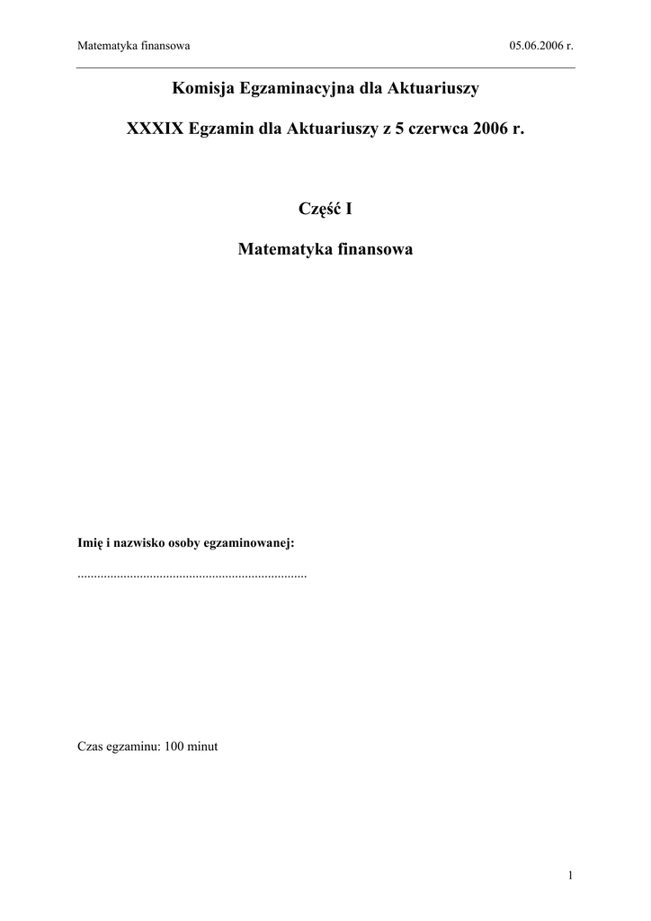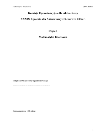 Matematyka finansowa 05.06.2006 r. Komisja Egzaminacyjna dla Aktuariuszy XXXIX Egzamin dla Aktuariuszy z 5 czerwca 2006 r. Część I Matematyka finansowa Imię i nazwisko osoby egzaminowanej: ...................................................................... Czas egzaminu: 100 minut 1 Matematyka finansowa 05.06.2006 r. 1. Inwestor dokonuje lokaty w kwocie 1000 PLN na 10 lat. Roczne stopy zwrotu w poszczególnych latach są niezależne i mają rozkład równomierny na przedziale (-10%;25%). Ile wynosi współczynnik E(X) / σ(X) dla tej lokaty? (E(X) - wartość oczekiwana stopy zwrotu z lokaty, σ(X) - odchylenie standardowe stopy zwrotu z lokaty). Podaj najbliższą wartość. A) 1,4 B) 1,5 C) 1,6 D) 1,7 E) 1,8 2 Matematyka finansowa 05.06.2006 r. 2. Zakład ubezpieczeń oferuje swojemu klientowi jako opcję dodatkową przy polisie życiowej możliwość zakupu za rok pewnego produktu finansowego, którego wartość rynkowa (f) zależy od poziomu rynkowego odpowiedniej stopy procentowej (i). Zależność ta dana jest funkcją : π 2π f (i ) = 100 000 * 1 + sin i * 200 − 3 3 Klient zakładu będzie mógł nabyć ten produkt po ustalonej z góry cenie f(7%). Oblicz wysokość rezerwy netto jaką zakład powinien utworzyć dzisiaj na taką opcję dodatkową przy następujących założeniach: • prawdopodobieństwo zgonu klienta w ciągu najbliższego roku q = 5% (wówczas wygasa możliwość skorzystania z opcji dodatkowej), • klient skorzysta z opcji dodatkowej zawsze, gdy będzie to dla niego korzystne w porównaniu do ceny rynkowej produktu, • rynkowa stopa procentowa i dla tego typu produktu za rok ma rozkład równomierny na przedziale (4%, 10%), • stopa techniczna dla tego typu rezerwy na najbliższy rok i1 = 8%, • rezerwa ma pokryć ryzyko ukształtowania się za rok ceny rynkowej produktu powyżej ceny oferowanej klientowi w opcji dodatkowej. Podaj najbliższą wartość. A) 25 000 B) 26 000 C) 27 000 D) 28 000 E) 29 000 3 Matematyka finansowa 05.06.2006 r. 3. Inwestor przyjmuje następujące założenia co do kształtowania się kursu akcji spółki X w kolejnych trzech okresach: • obecna cena akcji wynosi 50, • w każdym z trzech kolejnych okresów cena akcji może zmienić się o +20% (z prawdopodobieństwem 60%) lub -10% w odniesieniu do jej wartości z początku okresu, a prawdopodobieństwa zmiany są jednakowe w każdym okresie. Inwestor zamierza nabyć europejską opcję call na 1 akcję spółki X z ceną wykonania 55 i terminem wykonania na koniec trzeciego okresu. Specyfika tej inwestycji polega na tym, że płatność za opcję następuje w dwóch ratach - pierwsza na początku inwestycji a druga na koniec drugiego okresu. Inwestor może nie zapłacić drugiej raty i wówczas opcja natychmiast wygasa bez możliwości jej wykonania. Inwestor w całości traci wówczas pierwszą ratę. Jaką maksymalną kwotę inwestor byłby skłonny zapłacić za opcję (nominalna suma obu rat) przy następujących założeniach: - pierwsza rata wynosi 40% ceny całkowitej (druga 60%), - inwestor oczekuje stopy zwrotu z inwestycji w opcję na poziomie i = 10% w skali jednego okresu. Podaj najbliższą wartość. A) 8,85 B) 9,45 C) 10,05 D) 10,65 E) 11,25 4 Matematyka finansowa 05.06.2006 r. 4. Inwestor zamierza nabyć 10-letnią obligację zerokuponową o nominale 1000 PLN po cenie 1000 / (1,06)10 PLN. Obligacja posiada opcję przedwczesnego wykupu przez emitenta za 5 lat po cenie 1000 / (1,05)5 PLN. Rozkład zerokuponowej stopy 5 letniej za 5 lat jest równomierny na przedziale (2%;8%). Ile wynosi wartość oczekiwana rocznej efektywnej stopy zwrotu inwestora w okresie 10 lat (inwestor reinwestuje środki po stopie rynkowej o ile nastąpi wcześniejszy wykup, który to wykup następuje zawsze, o ile jest korzystny dla emitenta)? Podaj najbliższą wartość. A) 5,52% B) 5,62% C) 5,72% D) 5,82% E) 5,92% 5 Matematyka finansowa 05.06.2006 r. 5. Zakład ubezpieczeń oferuje produkt gwarantujący klientowi za 20 lat wypłatę 100 000 zł przy rocznej efektywnej stopie i = 4%. Oblicz składkę brutto płatną corocznie z góry przez 20 lat jeżeli: • koszty początkowe wynoszą 500 zł, • koszty związane z obsługą kolejnych składek (począwszy od drugiej) składają się z dwóch części: o stałej wynoszącej 75 zł, o zmiennej wyrażonej jako % składki, rosnącej liniowo od 3% (dla drugiej składki) do 6% (dla składki dwudziestej) Podaj najbliższą wartość. A) 3 473 B) 3 555 C) 3 648 D) 3 724 E) 3 811 6 Matematyka finansowa 05.06.2006 r. 6. Oblicz wartość obecną 20-letniej renty, która na końcu roku k (k = 1, 2, …, 20), wypłaca 20 . Stopa dyskontowa i = 5%. k kwotę A) 647 575 B) 649 575 C) 651 575 D) 653 575 E) 655 575 7 Matematyka finansowa 05.06.2006 r. 7. W chwili t = 0 rozpoczyna się akumulacja kwoty 1 zł z intensywnością oprocentowania δ1(t). Po losowym czasie T następuje zmiana intensywności oprocentowania na δ2(t) i dalej akumulacja odbywa się do chwili t = n. Funkcje akumulacji odpowiadające ciągłym intensywnościom oprocentowania δ1(t) i δ2(t) to odpowiednio a1(t) i a2(t). T jest zmienną losową o obciętym rozkładzie wykładniczym ze średnią α, z masą w punkcie n. Niech a(n) oznacza zakumulowaną wartość 1 zł w chwili n. Oblicz wartość oczekiwaną a(n), jeżeli wiadomo, że dla każdego t>0 zachodzi relacja a1 (t ) = t. Podaj odpowiedź dla n = 10 i α = 5. a 2 (t ) Podaj najbliższą wartość. A) 4.12 ∗ a 2 (10) B) 4.22 ∗ a 2 (10) C) 4.32 ∗ a 2 (10) D) 4.42 ∗ a 2 (10) E) 4.52 ∗ a 2 (10) 8 Matematyka finansowa 05.06.2006 r. 8. Dany jest nieskończony ciąg rent ciągłych, taki że renta startująca na początku roku t (t = 1, 2, ( ) …) wypłaca z rosnąco liniowo intensywnością od 0 do t przez następnych t lat ( I a t ). Wyznacz duration takiego ciągu płatności dla eδ - 1 = 10%, δ stałe w czasie. Podaj najbliższą wartość. A) 20 B) 21 C) 22 D) 23 E) 24 ∞ Uwaga. ∑t t =1 1 1 3 2 . v 