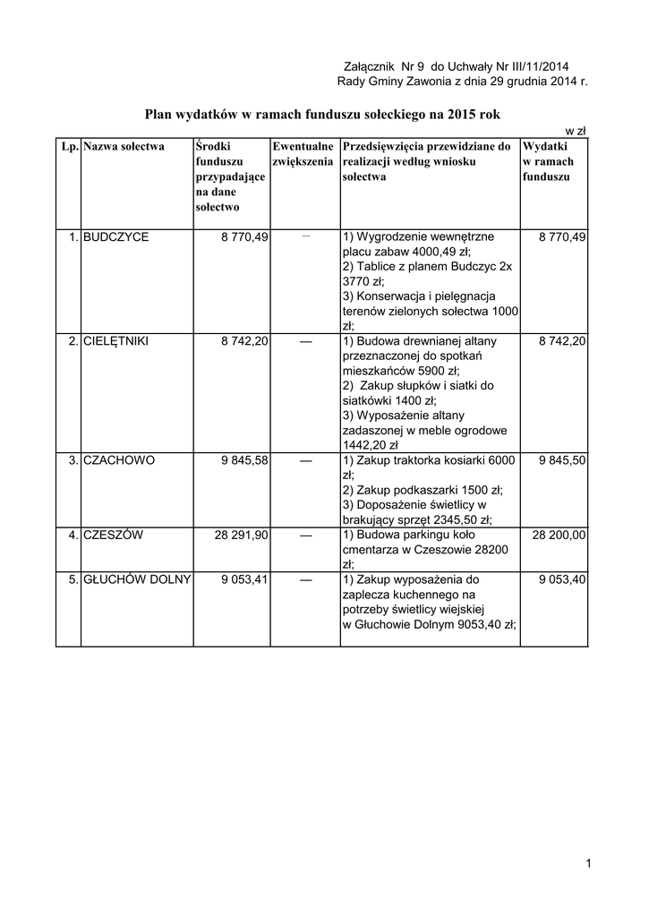 Załącznik Nr 9 do Uchwały Nr III/11/2014 Rady Gminy Zawonia z dnia 29 grudnia 2014 r. Plan wydatków w ramach funduszu sołeckiego na 2015 rok Lp. Nazwa sołectwa w zł Środki Ewentualne Przedsięwzięcia przewidziane do Wydatki funduszu zwiększenia realizacji według wniosku w ramach przypadające sołectwa funduszu na dane sołectwo 1. BUDCZYCE 8 770,49 — 2. CIELĘTNIKI 8 742,20 — 3. CZACHOWO 9 845,58 — 28 291,90 — 9 053,41 — 4. CZESZÓW 5. GŁUCHÓW DOLNY 1) Wygrodzenie wewnętrzne placu zabaw 4000,49 zł; 2) Tablice z planem Budczyc 2x 3770 zł; 3) Konserwacja i pielęgnacja terenów zielonych sołectwa 1000 zł; 1) Budowa drewnianej altany przeznaczonej do spotkań mieszkańców 5900 zł; 2) Zakup słupków i siatki do siatkówki 1400 zł; 3) Wyposażenie altany zadaszonej w meble ogrodowe 1442,20 zł 1) Zakup traktorka kosiarki 6000 zł; 2) Zakup podkaszarki 1500 zł; 3) Doposażenie świetlicy w brakujący sprzęt 2345,50 zł; 1) Budowa parkingu koło cmentarza w Czeszowie 28200 zł; 1) Zakup wyposażenia do zaplecza kuchennego na potrzeby świetlicy wiejskiej w Głuchowie Dolnym 9053,40 zł; 8 770,49 8 742,20 9 845,50 28 200,00 9 053,40 1 6. KAŁOWICE 8 629,03 — 1) Zakup karniszy i firanek do świetlicy 620 zł; 2) Montaż rolet do świetlicy wiejskiej 3200 zł; 3) Zakup naczyń do kuchni w świetlicy wiejskiej 2409,03 zł; 4) Organizacja uroczystości Dnia Kobiet w miejscowości Kałowice 700 zł; 5) Organizacja uroczystości Dzień Dziecka w m. Kałowice 400 zł; 6) Organizacja uroczystości Dożynki wiejskie 900 zł; 7) Organizacja uroczystości Mikołajki 400 zł; 8 629,03 7. LUDGIERZOWICE I POMIANOWICE 9 251,45 — 8 251,45 8. MIŁONOWICE 10 269,96 — 9. NIEDARY 11 712,85 — 10. PĘCISZÓW 10 864,09 — 1) Pomianowice - montaż korytek odwadniających drogę gminną w miejscowości Pomianowice przy drodze asfaltowej 3080 zł; 2) Ludgierzowice - pielęgnacja i konserwacja zieleni placu zabaw 3000 zł; 3) Imprezy promocyjne sołectwa Ludgierzowice 2171,45 zł; 1) Montaż korytek ściekowych wzdłuż posesji 15/6 na odcinku 80 m 8 662,05 zł; 2) Zakup tłucznia - utwardzenie pobocza drogi gminnej przy posesji 15/4 w Miłonowicach 1476 zł; 3) Zakup paliwa, żyłki do kosy spalinowej i oleju do sporządzenia mieszanki paliwowej 131,90 zł; 1) Zakup słupków na boisko do siatkówki 1000 zł; 2) Zakup pawilonu namiotowego składanego 2000 zł; 3) Zakup paliwa oraz części eksploatacyjnych do kosiarki 500 zł; 4) Tablica informacyjna o Niedarach 2000 zł; 5) Zakup słupków i łąńcucha na boisko sportowe 500 zł; 6) Wkład do projektu odnośnie budowy boiska 5712 zł; 1) Doposażenie placu zabaw w Pęciszowie 10864 zł; 10 269,95 11 712,00 10 864,00 2 11. PRAWOCICE 7 271,02 — 12. PSTRZEJOWICE 7 157,85 — 13. RADŁÓW 6 931,52 — 15 051,29 — 14. RZĘDZISZOWICE I KOPIEC 1) Kosiarka z napędem 3500 zł; 2) Ogrodzenie placu zabaw Prawocie 3271,02 zł; 3) Rożno dla wioski (sołectwo Prawocice) 500 zł; 1) Zakup kosiarki do trawy 3500 zł; 2) Zakup grilla 1000 zł; 3) Zakup dwóch bramek 2x3 do gry w piłkę i zewnętrznego stołu do ping ponga 2657,85 zł; 1) Dalsze roboty budowlane polegające na wyłożeniu rowu odwadniającego drogę gminną płytami jomby 6931,52 zł; 7 271,02 7 157,85 6 931,52 15 040,00 1) Zakup do świetlicy stołu pingpongowego oraz tzw. hantelków do ćwiczeń siłowych 2000 zł; 2) Zlecenie wykonania pomieszczenia gospodarczego obok świetlicy 1790 zł; 3) Uzupełnienie wyposażenia w kuchni świetlicy 1450 zł; 4) Zamontowanie w WC ubikacji damskiej + doprowadzenie wody + dokupienie grzejnika do ubikacji 1000 zł; 5) Zakup kosiarki spalinowej do koszenia terenów zielonych trawy na placach zabaw oraz koło świetlicy 2500 zł; 6) Przeniesienie placu zabaw zabawowych z istniejącego placu zabaw w inne bezpieczne miejsce oraz dokupienie do wyposażenia urządzeń zabawowych - tygrysek na sprężynie 5000 zł; 7) Zamontowanie 2 szt. gablot ogłoszeniowych w przysiółku Kopiec oraz w osiedlu mieszkaniowym Rzędziszowice 1300 zł; . . 3 15. SĘDZICE 16 805,39 — 16. SKOTNIKI 7 780,27 — 17. STANIĘCICE I ZŁOTÓWEK 7 440,77 18. SUCHA WIELKA 8 685,61 19. TARNOWIEC I SUCHA MAŁA — — 17 569,27 — 20. TRZĘSOWICE 9 081,70 — 21. ZAWONIA 28 291,90 — 22. ZŁOTÓW I TRZEMSZE 19 266,78 — 266 764,33 — Ogółem: 1) Zakup wyposażenia audiowizualnego do świetlicy wiejskiej 7984 zł; 2) Zakup krat i rolet z montażem na okna i drzwi świetlicy wiejskiej 3829 zł; 3) Dodatkowe oświetlenie i zakup listwy ochronnej na ściany w świetlicy wiejskiej 1160 zł; 1) Wyłożenie rowu odwadniającego drogę gminną w miejscowości Skotniki płytami jomby 7780,27 zł; 1) Odwodnienie drogi gminnej 109/2 - przygotowanie projektu 7440,77 zł; 1) Ogrodzenie placu zabaw w Suchej Wielkiej 8685,61 zł; 1) Budowa chodnika w Suchej Małej - projekt budowy tego chodnika w Suchej Małej 7569,27 zł; 2) Zakup kręgów o średnicy 600 mm do zabudowy rowu na działce gminnej 2000 zł; 3) Korytkowy spust wody przy drodze gminnej w Tarnowcu, przy posesji nr 58 i 56 - 8000 zł; 1) Zamontowanie 3 lamp ulicznych w tym 1 szt. słup w kierunku przystanku autobusowego w m. Trzęsowice 7000 zł; 2) Barierka ochronna na moście w Trzęsowicach przy drodze gminnej 2000 zł; 1) Zagospodarowanie terenu wokół Urzędu Gminy i GOK-u w Zawoni 28290 zł; 1) Uporządkowanie i zagospodarowanie parku w centrum wsi 19266,78 zł; 12 973,00 7 780,27 7 440,77 8 685,61 17 569,27 9 000,00 28 290,00 19 266,78 261 744,11 4