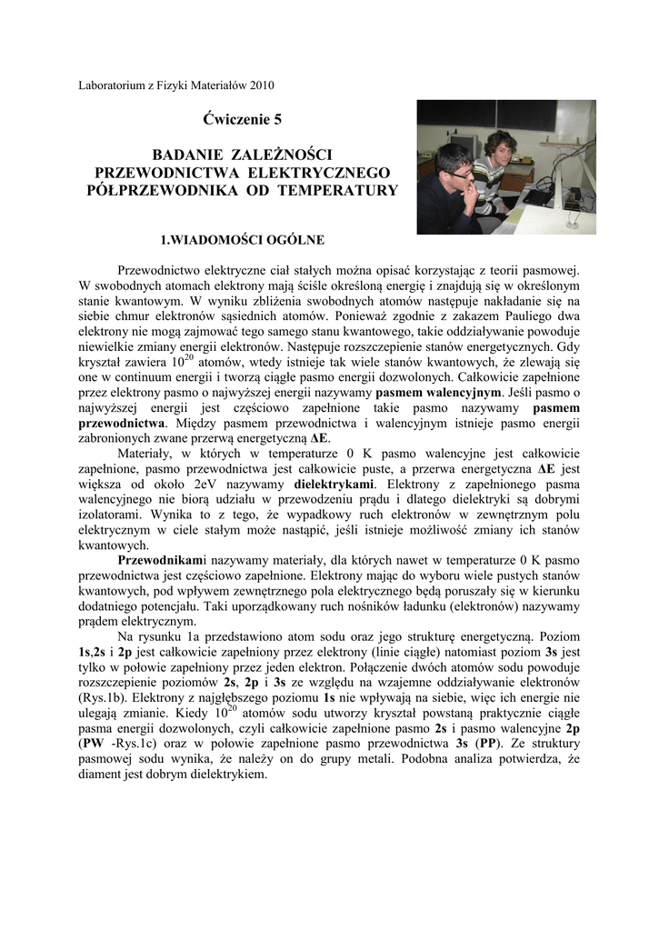 Laboratorium z Fizyki Materiałów 2010 Ćwiczenie 5 BADANIE ZALEŻNOŚCI PRZEWODNICTWA ELEKTRYCZNEGO PÓŁPRZEWODNIKA OD TEMPERATURY 1.WIADOMOŚCI OGÓLNE Przewodnictwo elektryczne ciał stałych można opisać korzystając z teorii pasmowej. W swobodnych atomach elektrony mają ściśle określoną energię i znajdują się w określonym stanie kwantowym. W wyniku zbliżenia swobodnych atomów następuje nakładanie się na siebie chmur elektronów sąsiednich atomów. Ponieważ zgodnie z zakazem Pauliego dwa elektrony nie mogą zajmować tego samego stanu kwantowego, takie oddziaływanie powoduje niewielkie zmiany energii elektronów. Następuje rozszczepienie stanów energetycznych. Gdy kryształ zawiera 1020 atomów, wtedy istnieje tak wiele stanów kwantowych, że zlewają się one w continuum energii i tworzą ciągłe pasmo energii dozwolonych. Całkowicie zapełnione przez elektrony pasmo o najwyższej energii nazywamy pasmem walencyjnym. Jeśli pasmo o najwyższej energii jest częściowo zapełnione takie pasmo nazywamy pasmem przewodnictwa. Między pasmem przewodnictwa i walencyjnym istnieje pasmo energii zabronionych zwane przerwą energetyczną ΔE. Materiały, w których w temperaturze 0 K pasmo walencyjne jest całkowicie zapełnione, pasmo przewodnictwa jest całkowicie puste, a przerwa energetyczna ΔE jest większa od około 2eV nazywamy dielektrykami. Elektrony z zapełnionego pasma walencyjnego nie biorą udziału w przewodzeniu prądu i dlatego dielektryki są dobrymi izolatorami. Wynika to z tego, że wypadkowy ruch elektronów w zewnętrznym polu elektrycznym w ciele stałym może nastąpić, jeśli istnieje możliwość zmiany ich stanów kwantowych. Przewodnikami nazywamy materiały, dla których nawet w temperaturze 0 K pasmo przewodnictwa jest częściowo zapełnione. Elektrony mając do wyboru wiele pustych stanów kwantowych, pod wpływem zewnętrznego pola elektrycznego będą poruszały się w kierunku dodatniego potencjału. Taki uporządkowany ruch nośników ładunku (elektronów) nazywamy prądem elektrycznym. Na rysunku 1a przedstawiono atom sodu oraz jego strukturę energetyczną. Poziom 1s,2s i 2p jest całkowicie zapełniony przez elektrony (linie ciągłe) natomiast poziom 3s jest tylko w połowie zapełniony przez jeden elektron. Połączenie dwóch atomów sodu powoduje rozszczepienie poziomów 2s, 2p i 3s ze względu na wzajemne oddziaływanie elektronów (Rys.1b). Elektrony z najgłębszego poziomu 1s nie wpływają na siebie, więc ich energie nie ulegają zmianie. Kiedy 1020 atomów sodu utworzy kryształ powstaną praktycznie ciągłe pasma energii dozwolonych, czyli całkowicie zapełnione pasmo 2s i pasmo walencyjne 2p (PW -Rys.1c) oraz w połowie zapełnione pasmo przewodnictwa 3s (PP). Ze struktury pasmowej sodu wynika, że należy on do grupy metali. Podobna analiza potwierdza, że diament jest dobrym dielektrykiem. Na 1020 Na 2 Na E 3s 3s PP ΔE 2p 2p 2s 2s 1s 1s a b PW c Rys.1 Półprzewodniki są materiałami o podobnej strukturze energetycznej do dielektryków, lecz o mniejszej przerwie energetycznej (ΔE<ok.2eV). Półprzewodniki w temperaturze 0K są izolatorami. W wyższych temperaturach pojawia się przewodnictwo spowodowane wzbudzeniem niektórych elektronów z zapełnionego pasma walencyjnego do pustego pasma przewodnictwa. Co więcej, w ich miejscu powstają nie zapełnione stany kwantowe umożliwiające ruch elektronów w paśmie walencyjnym. Ruch elektronów z pasma walencyjnego można interpretować jako ruch dodatnio naładowanych dziur. W polu elektrycznym takie dodatnie dziury poruszają się w przeciwnym kierunku do kierunku ruchu elektronów. W efekcie, w półprzewodniku pojawia się przewodnictwo elektronowe i dziurowe. W półprzewodnikach samoistnych liczba elektronów jest równa liczbie dziur. Przewodnictwo półprzewodników samoistnych silnie zależy od wielkości szerokości przerwy energetycznej i temperatury E 1 0 e 2 kT , (13.1) R gdzie: σo - wartość przewodnictwa gdy T dąży do nieskończoności, k-stała Boltzmanna, a ΔE jest przerwą energetyczną. Typowymi półprzewodnikami samoistnymi są krzem i german. Domieszkowanie półprzewodników samoistnych pierwiastkami z III i V grupy układu okresowego pierwiastków zmienia koncentrację dziur i elektronów. Otrzymywane są półprzewodniki z nadmiarem elektronów, czyli typu n oraz półprzewodniki z nadmiarem dziur, czyli typu p. Odpowiednio domieszkowane półprzewodniki służą do budowy większości urządzeń elektronicznych. Analogia między pasmowym modelem półprzewodnika, a kameralnym kinem. Założenie: w kinie znajdują się miejsca dla widzów na parterze i na balkonie. Miejsca ustawione są w coraz wyżej ustawionych rzędach (coraz wyższa energia). Balkon znajduje się znacząco wyżej od ostatniego rzędu na parterze. Widzowie zapełniają kino od najniższego rzędu. Sytuacja 1. Parter jest całkowicie zapełniony przez widzów, balkon jest pusty (np. .w remoncie). Skutek: z powodu braku miejsc pustych żaden widz nie może zmienić miejsca. Analogia: Jeśli widzowie reprezentują elektrony, a miejsca w kinie dozwolone stany energetyczne to jest to model półprzewodnika w temperaturze 0K gdzie parter jest pasmem walencyjnym, a balkon pasmem zabronionym. Z powodu braku pustych stanów ruch elektronów jest niemożliwy. 3 2 1 BALKON 6 5 4 3 2 1 PARTE R Sytuacja 2. Z powodu zbyt dużej temperatury panującej w górnych rzędach parteru, mimo 3 problemów trzech widzów wspięło się na balkon. 2 Skutek: trójka widzów na balkonie praktycznie w 1 dowolny sposób może przemieścić się po całym balkonie. Na parterze w ostatnim rzędzie a b c d pozostały trzy wolne miejsca. Pozwala to na 6 przemieszczenie się wielu widzów. Na przykład 5 4 widz a na puste miejsce, widz b na miejsce po a, 3 widz c na miejsce po b itd. W efekcie takiej 2 sekwencji przesunięcia widzów puste miejsce 1 przewędrowało w prawą stronę. Można pow